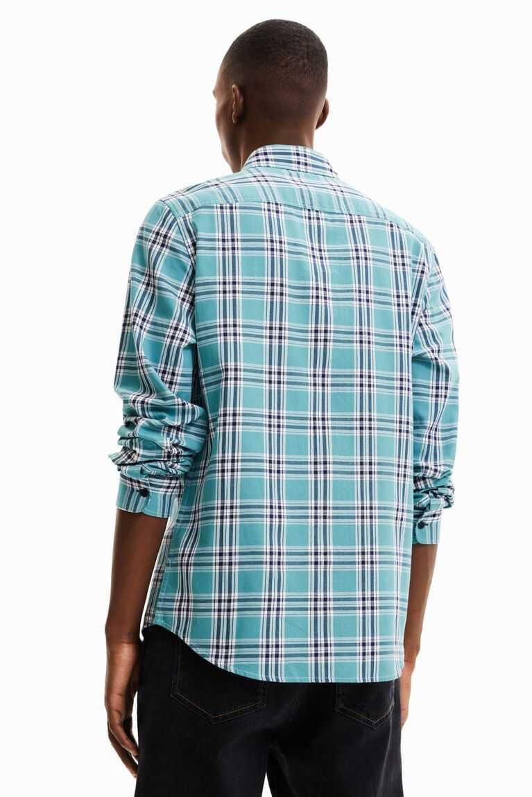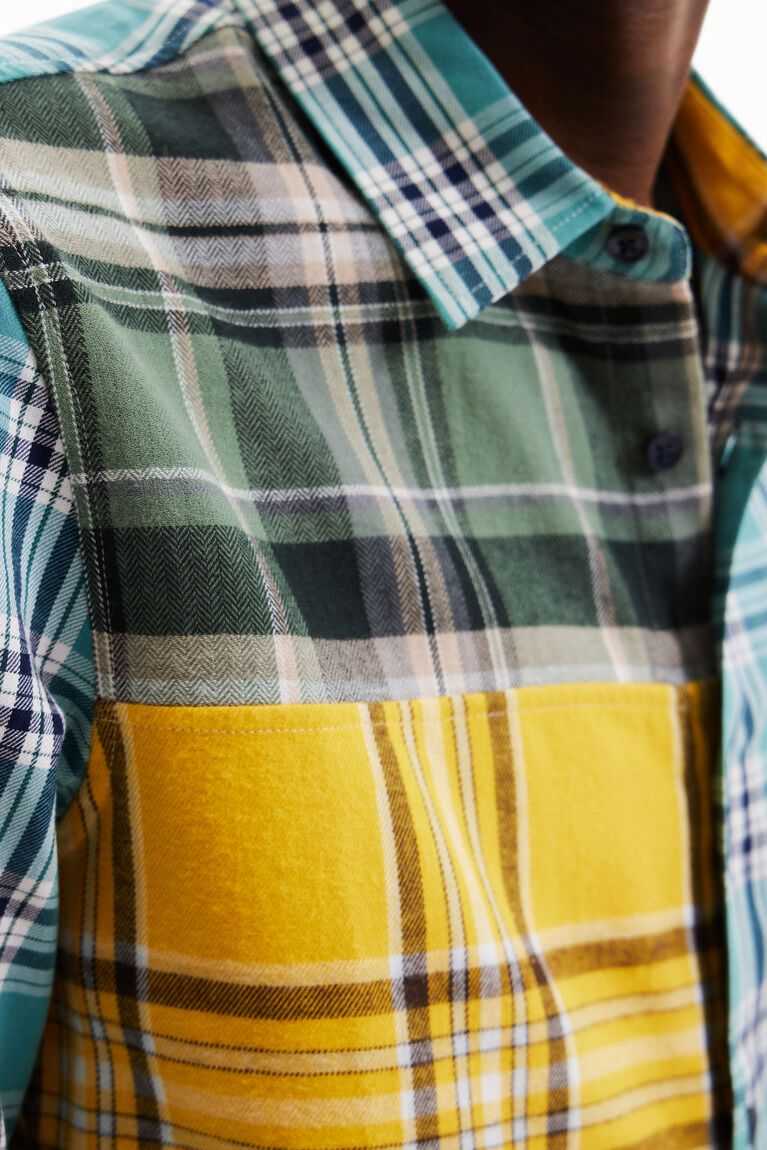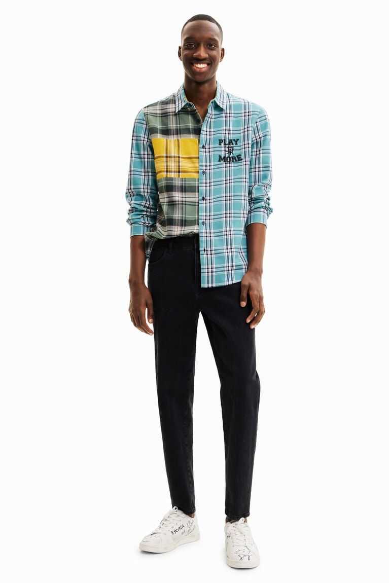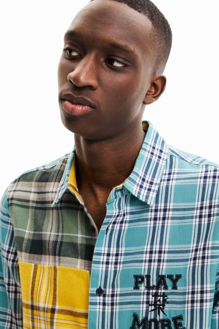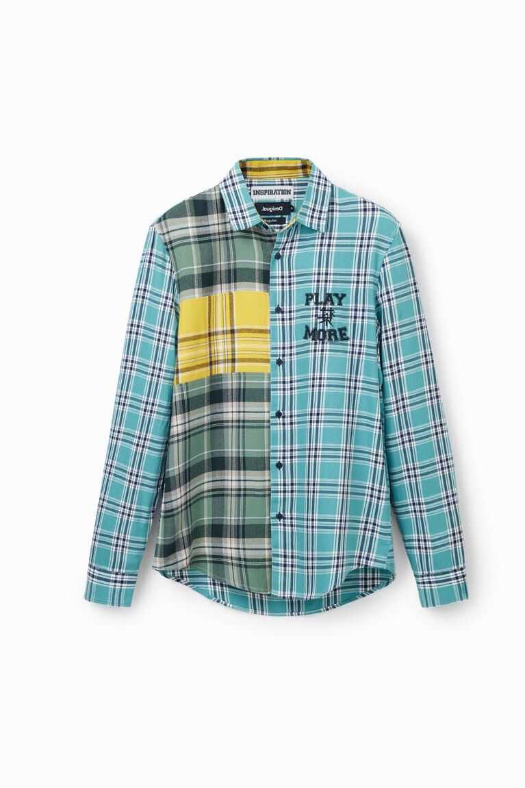 A regular-fit shirt, made from cotton, with a patchwork of different plaid prints and the message: "Play more".