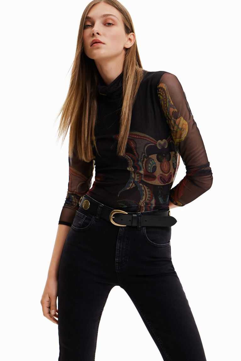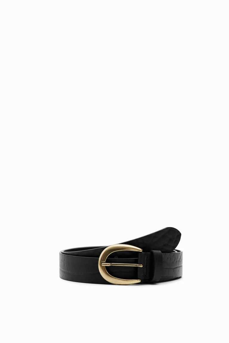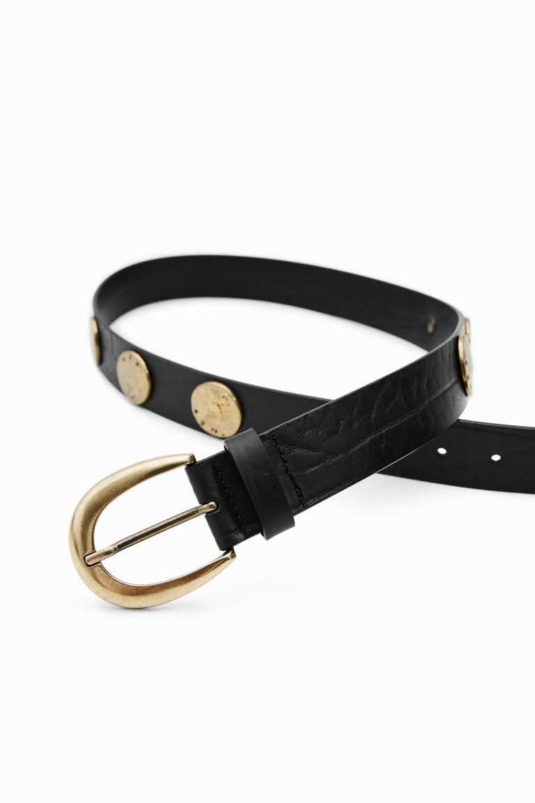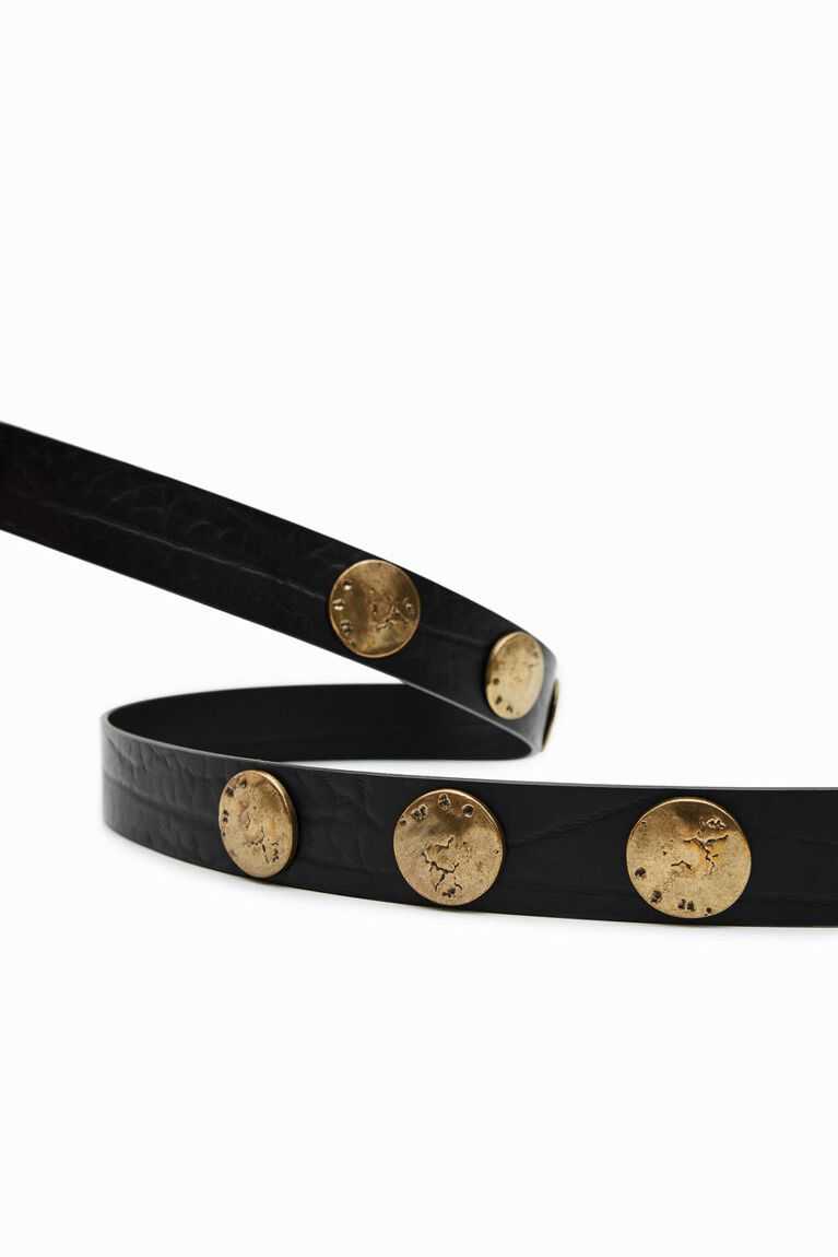 Rustic textured leather belt with an antiqued buckle in a gold tone and embellished with circular plates in a similar tone.
