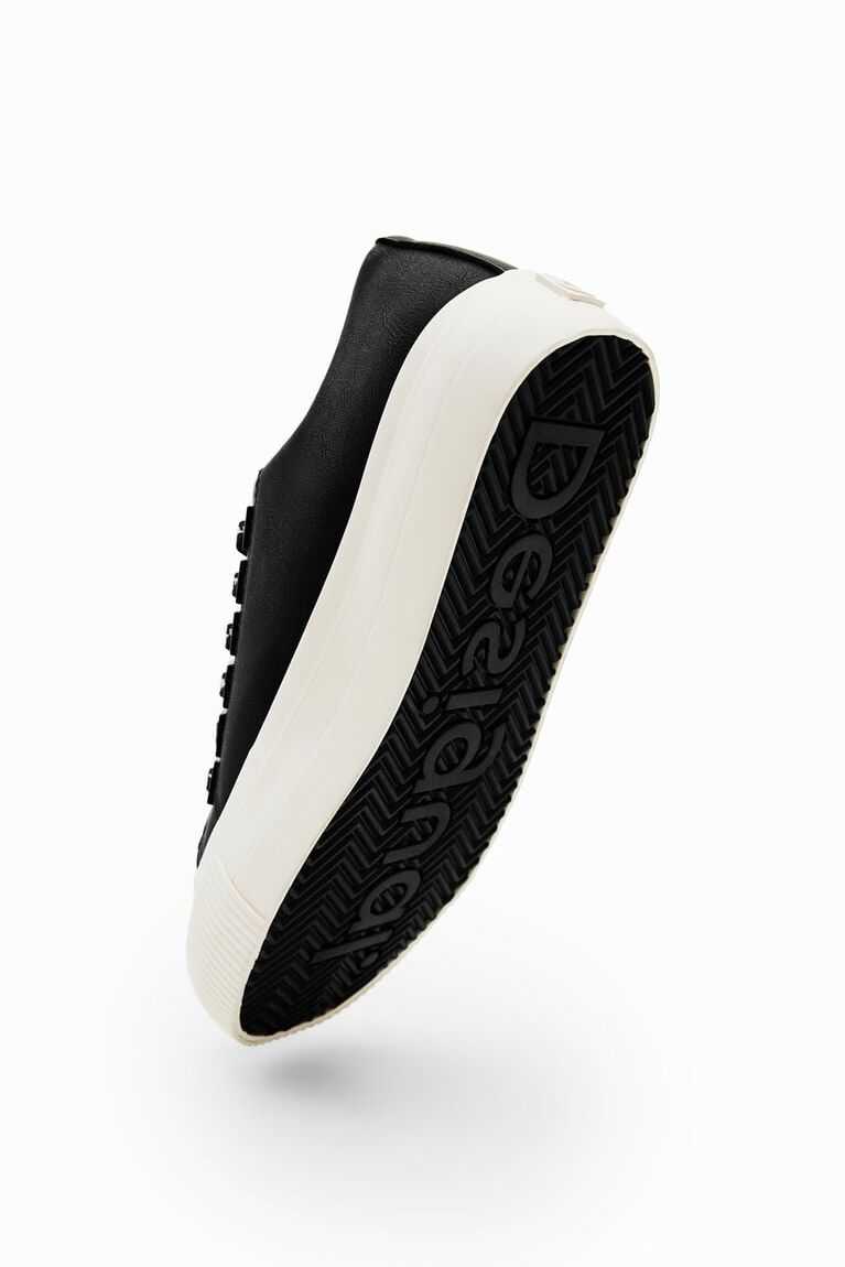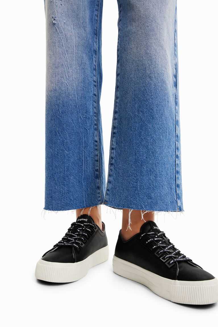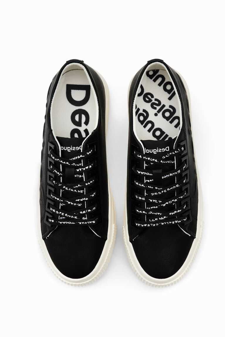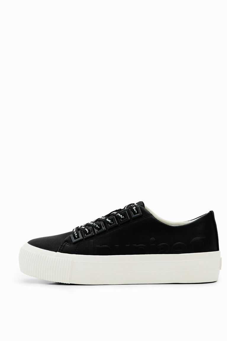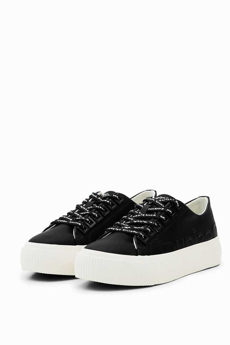Platform sneakers in a plain colour with a half logo embossed on the side, tone-on-tone eyelets and message laces. Featuring a white sole made from recycled rubber.