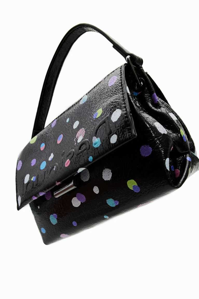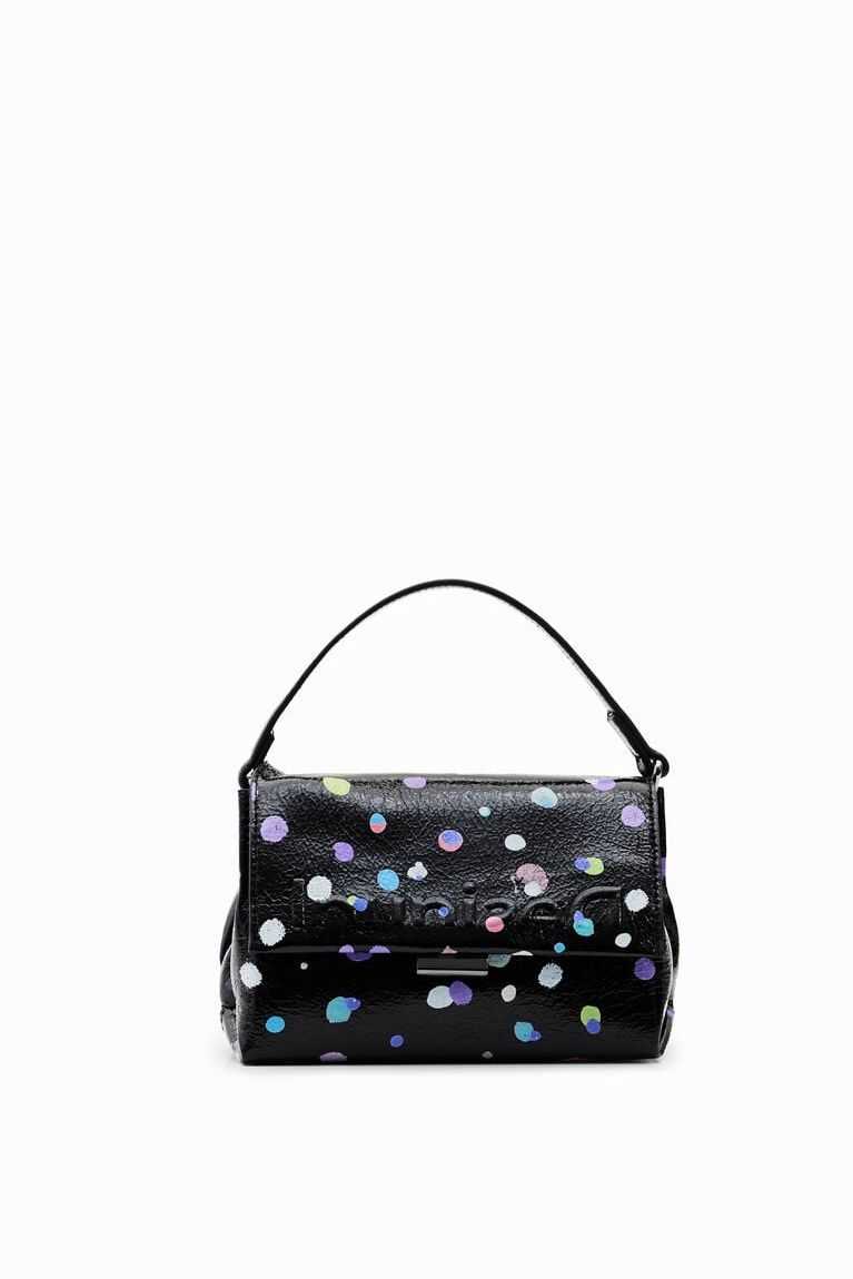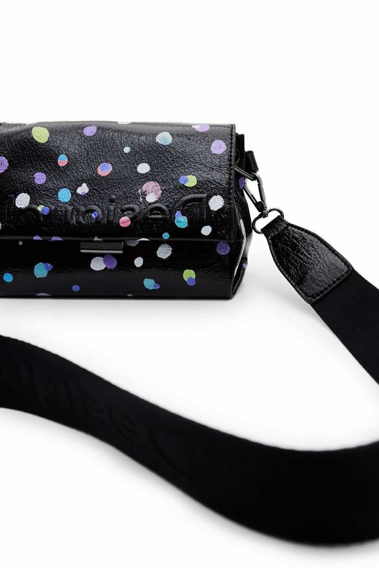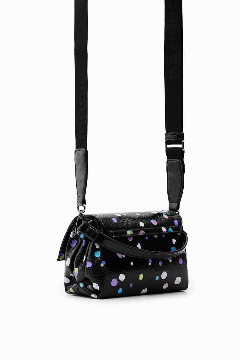 A mini crossbody bag with a very arty and colourful polka dot print on the outside. With several plain-colour straps, it has multiple compartments inside.