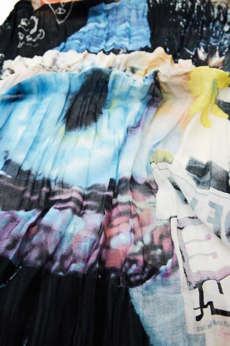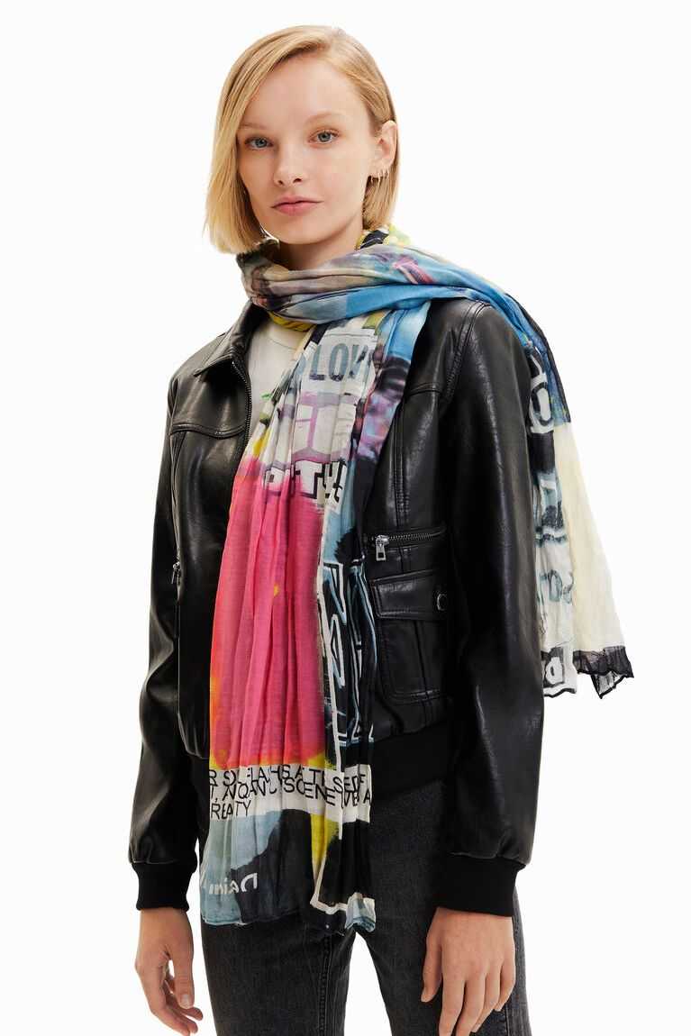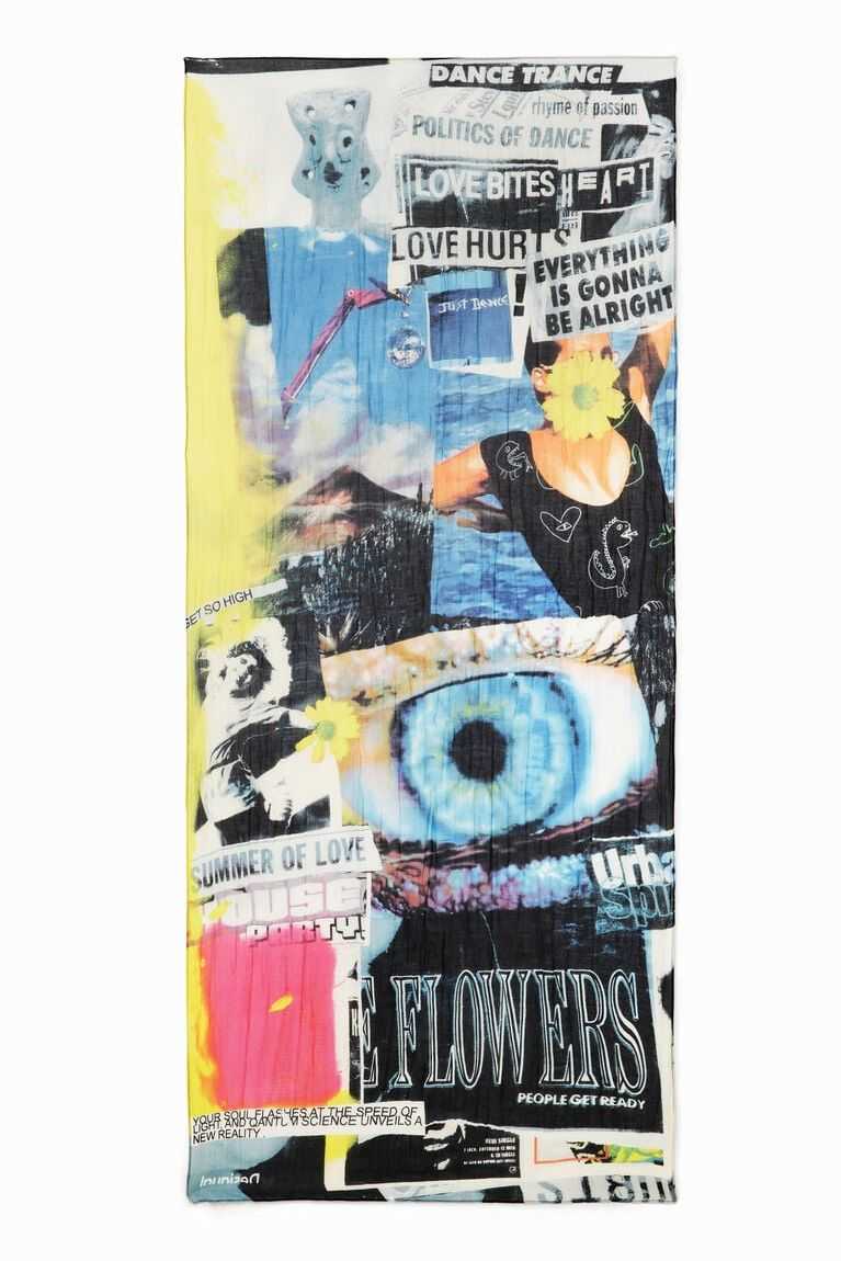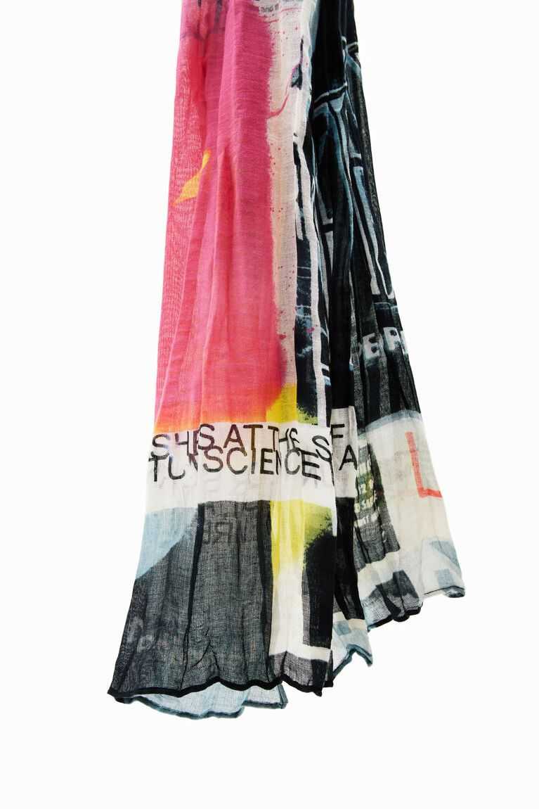 A rectangular foulard in fabric with a crinkle-effect texture and newspaper print.