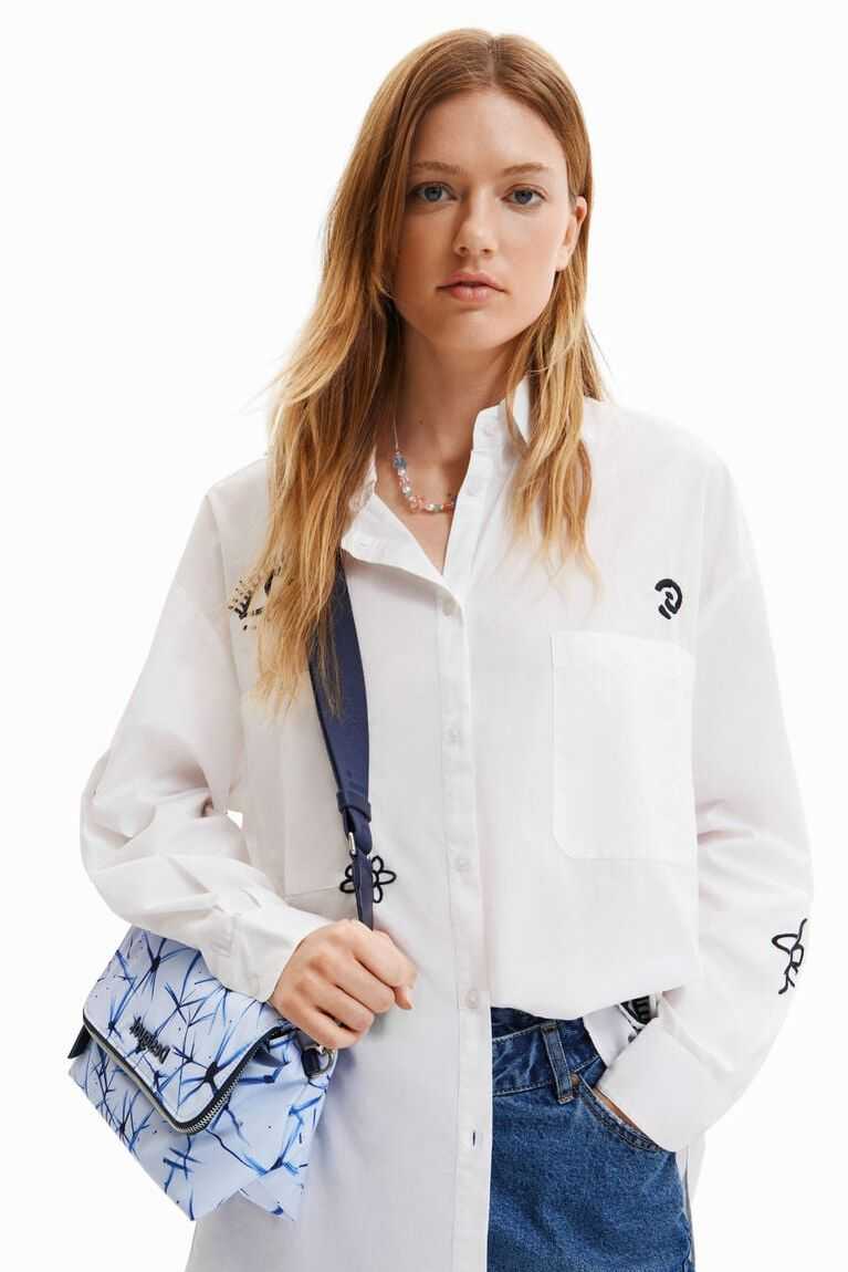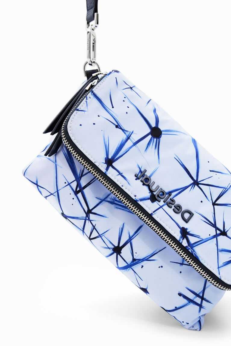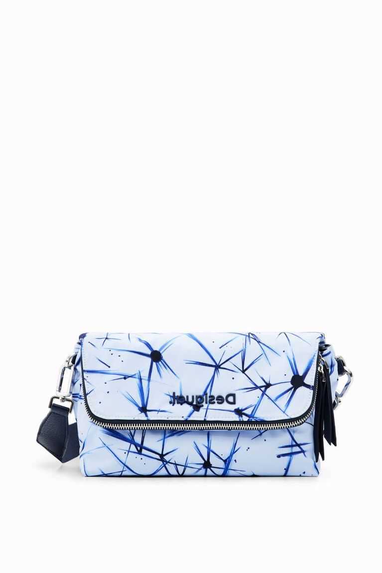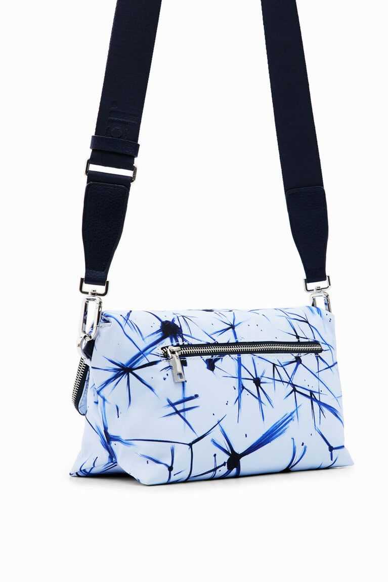 A crossbody bag with an abstract arty print. Made from recycled fibres, it is very light with a soft texture. Multiple straps and compartments.