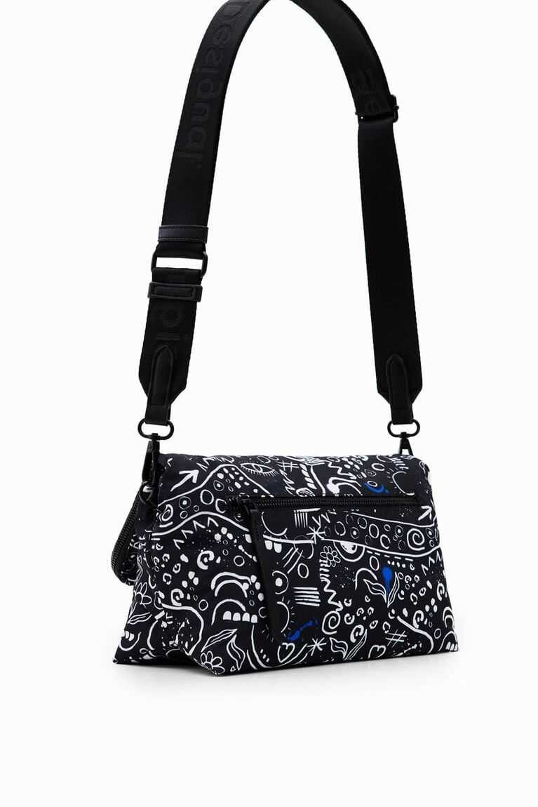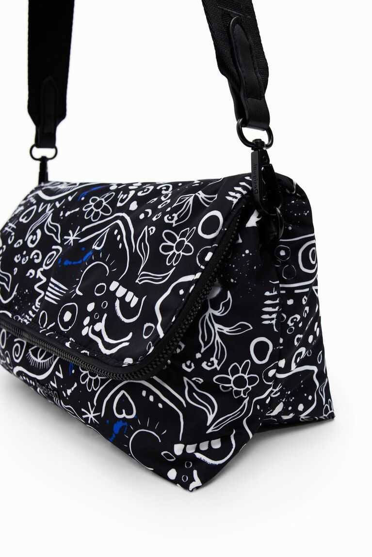 Black and white crossbody bag with a hand-drawn illustration effect. Made from recycled fibres, it is very light with a soft texture. Multiple straps and compartments.