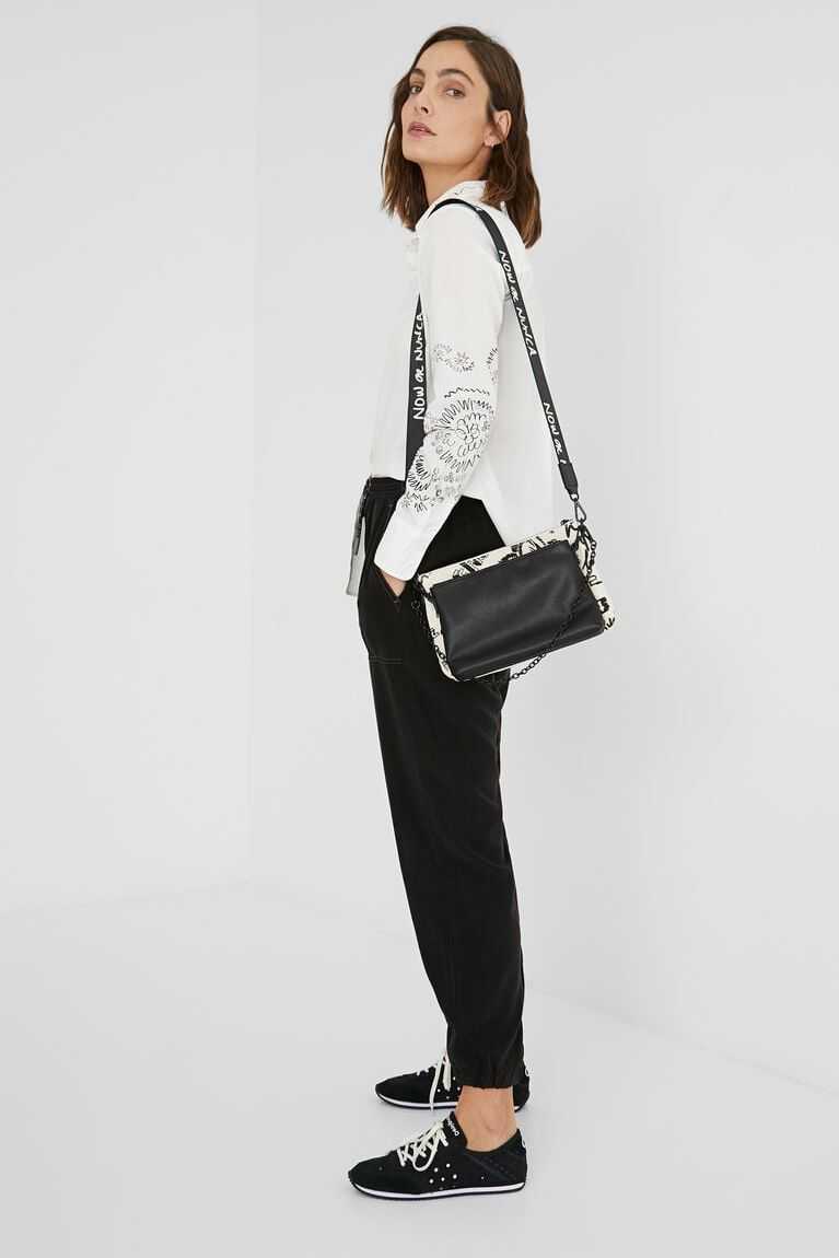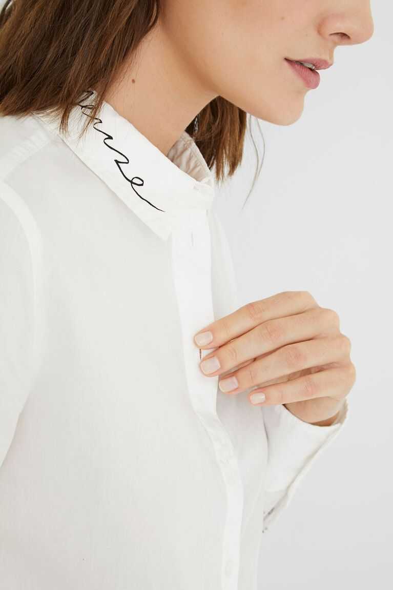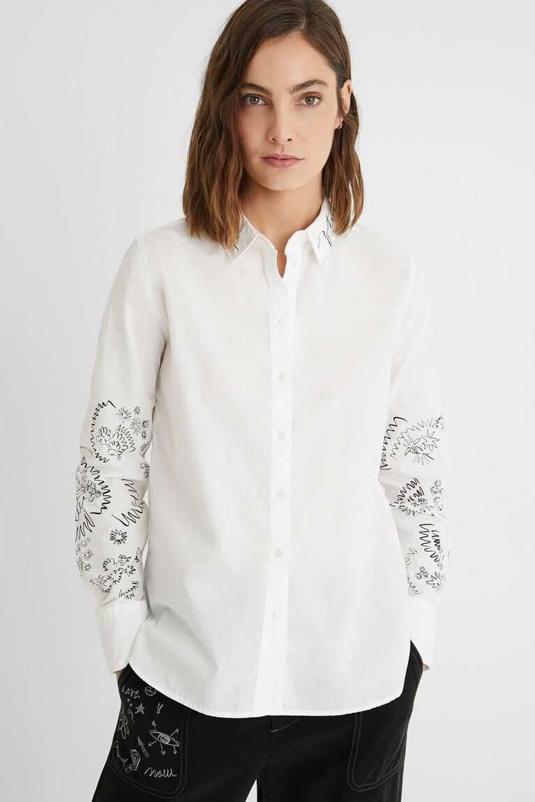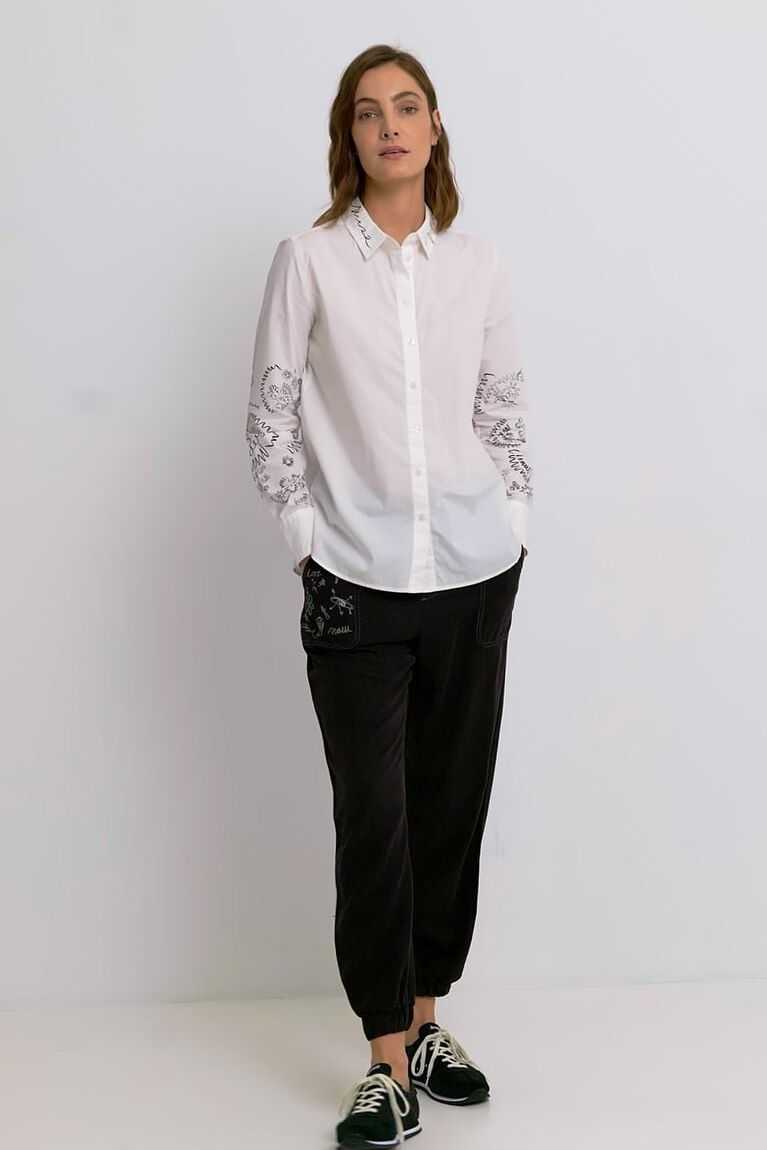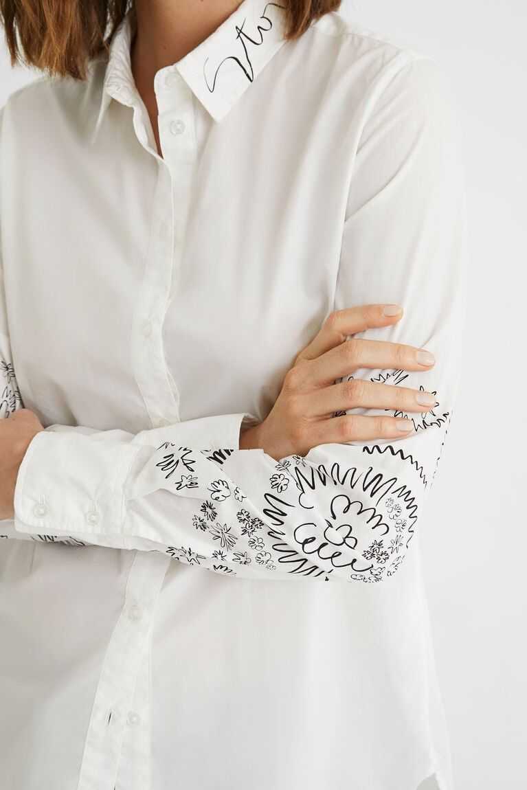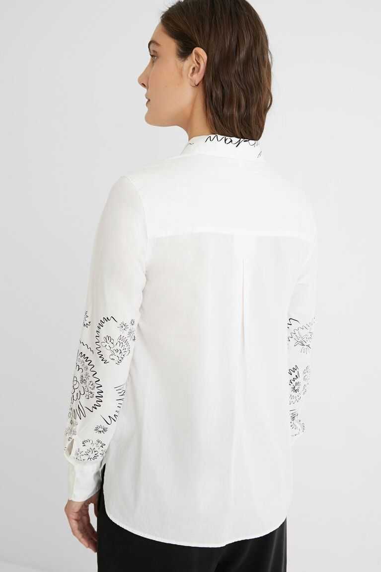 Cool and casual, this white cotton shirt with abstract style drawings of mandalas on the elbows and written on the collar is ideal for your informal looks.
