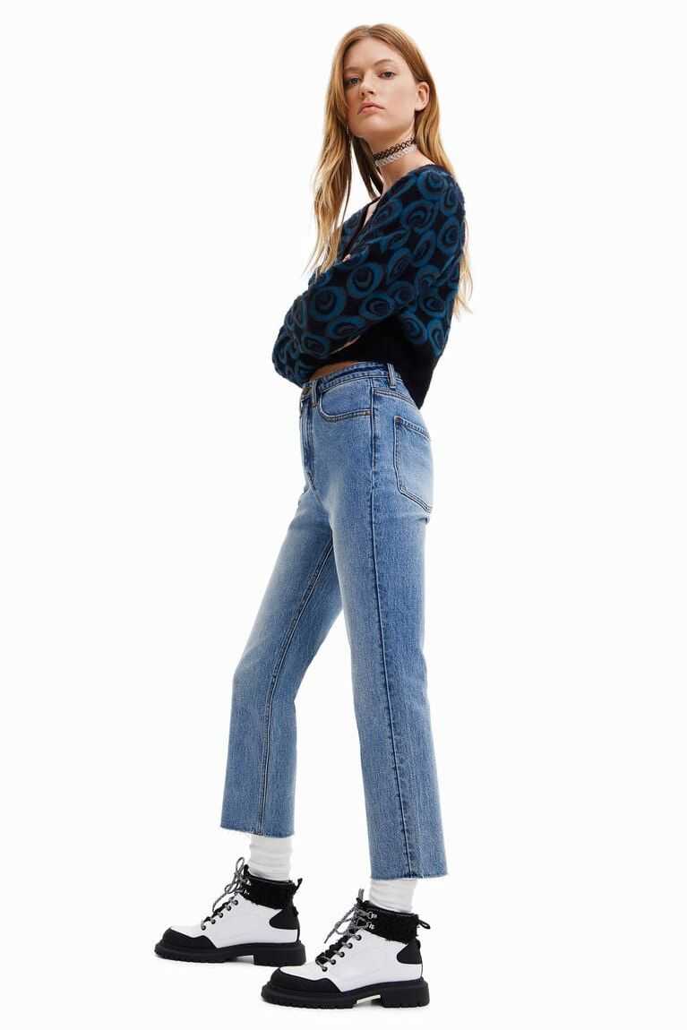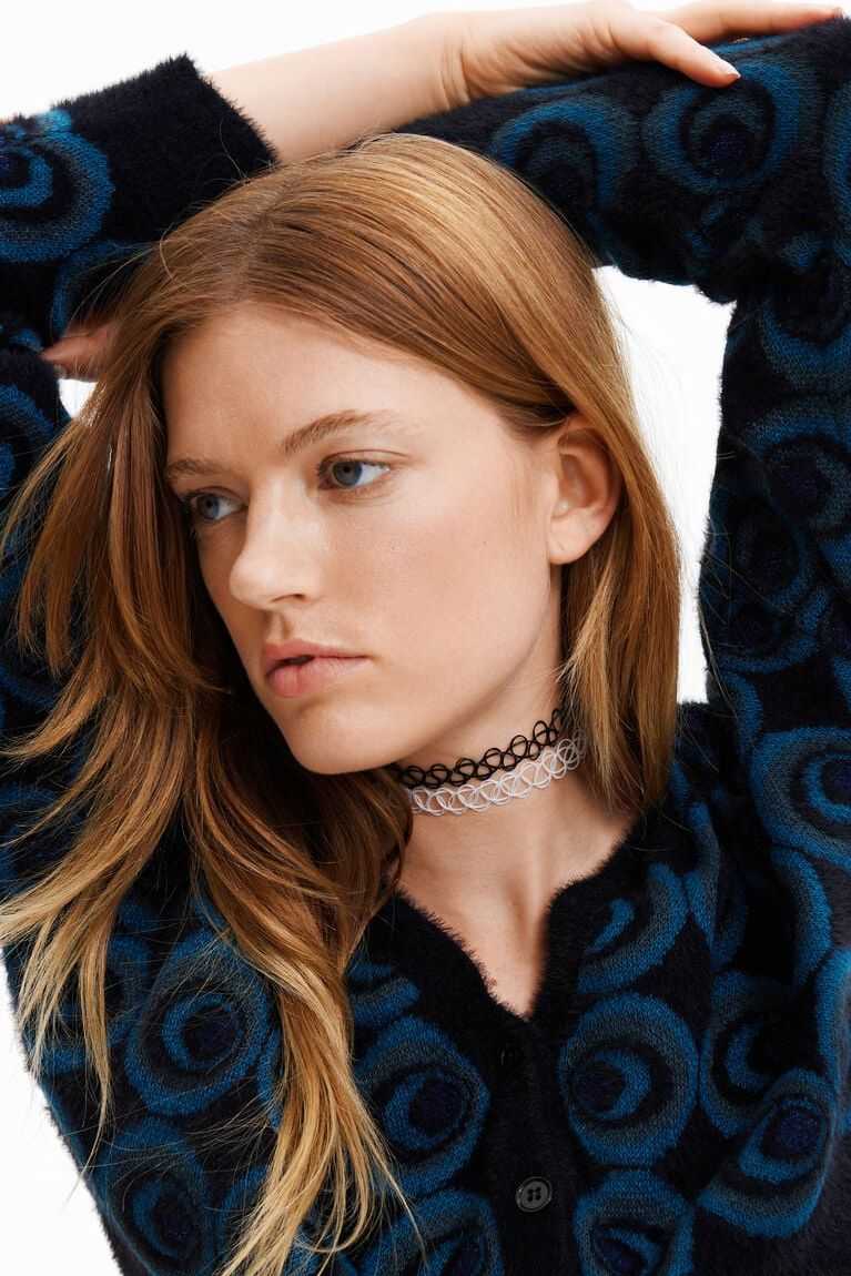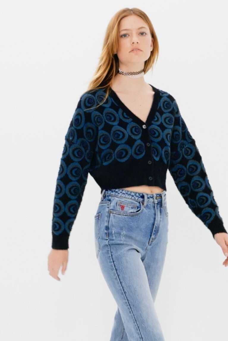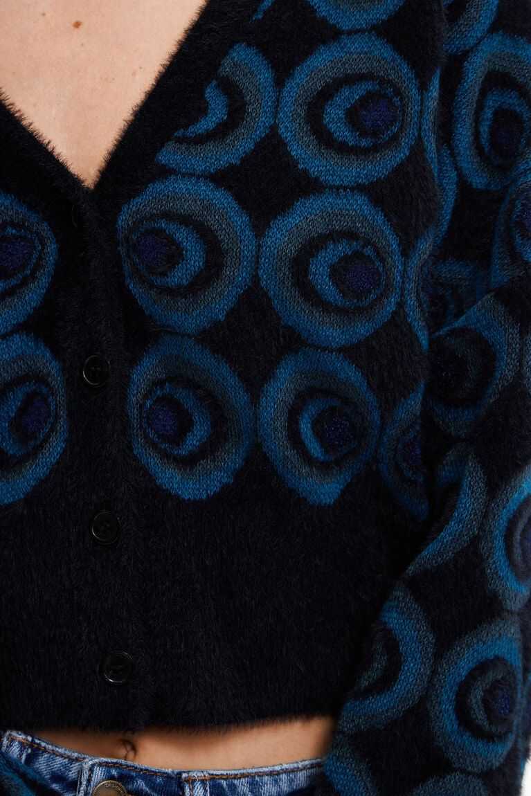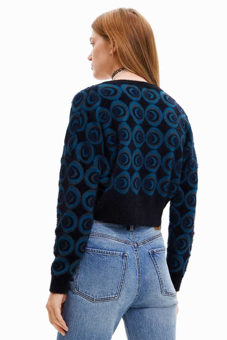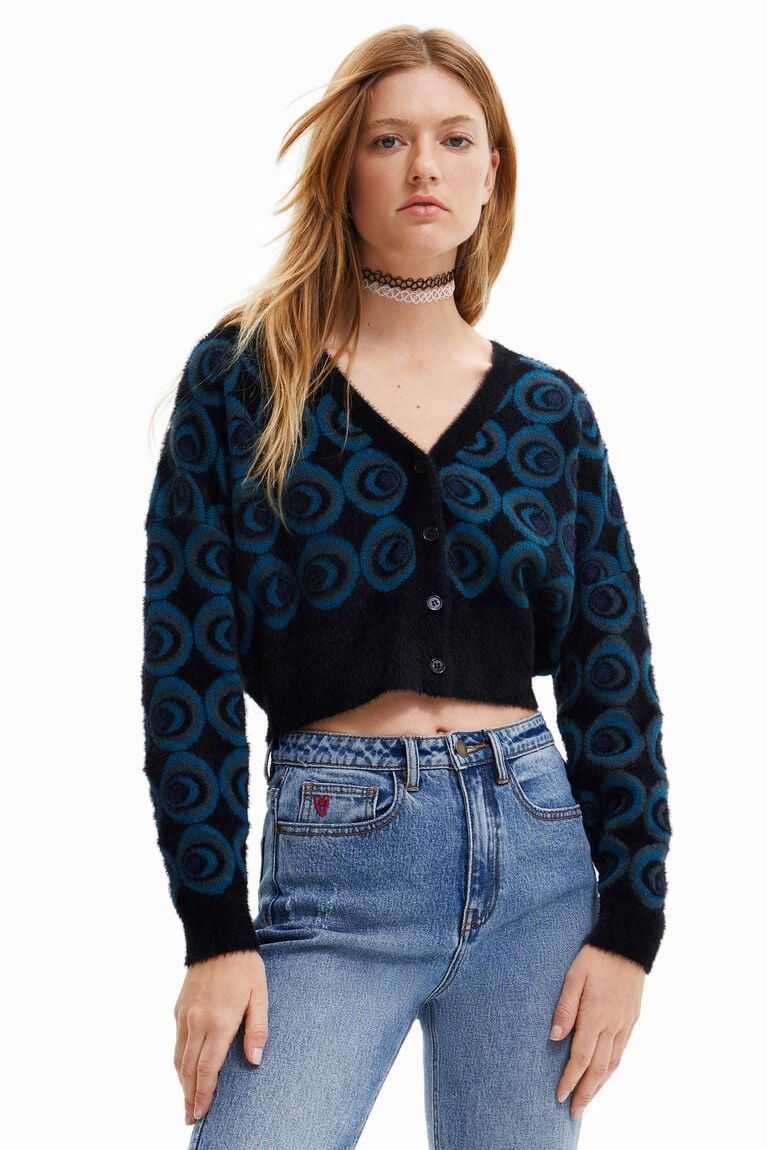 A short jacquard knit cardigan with retro motifs and plush effect.