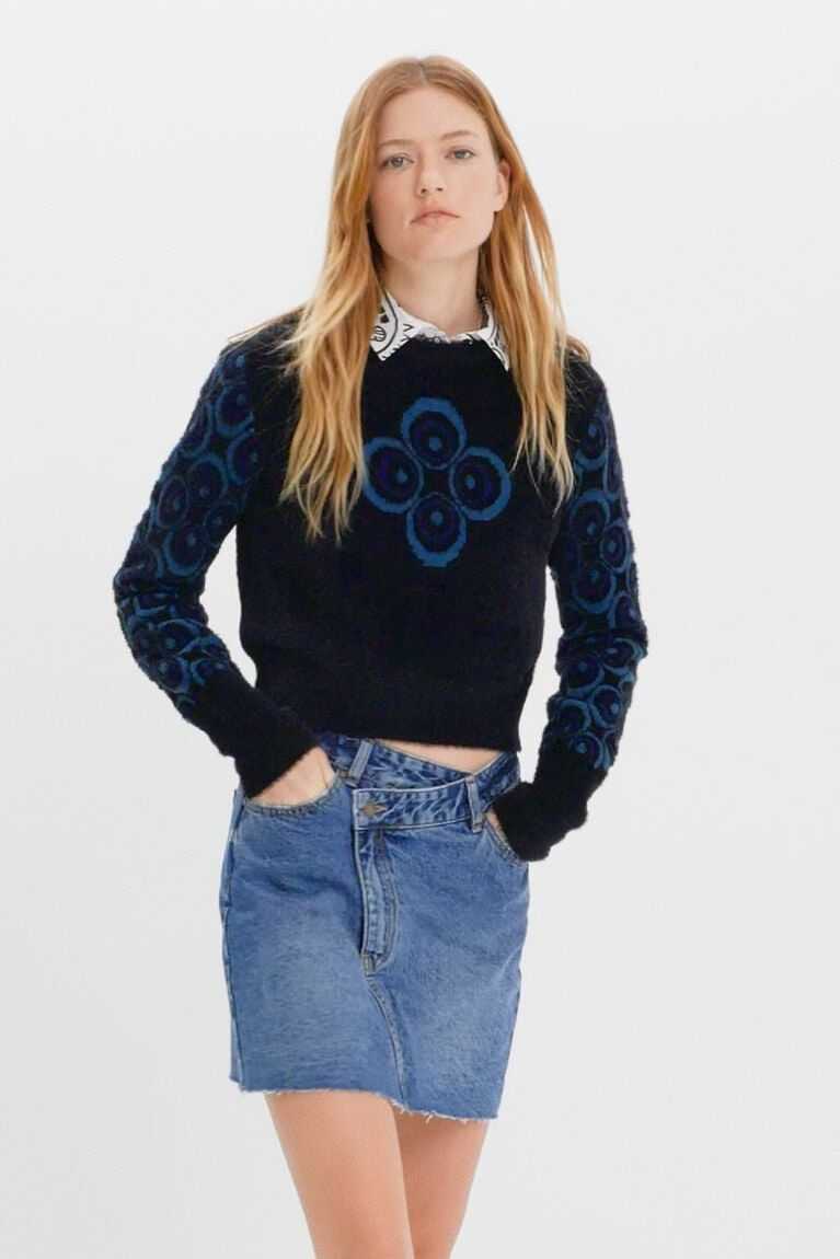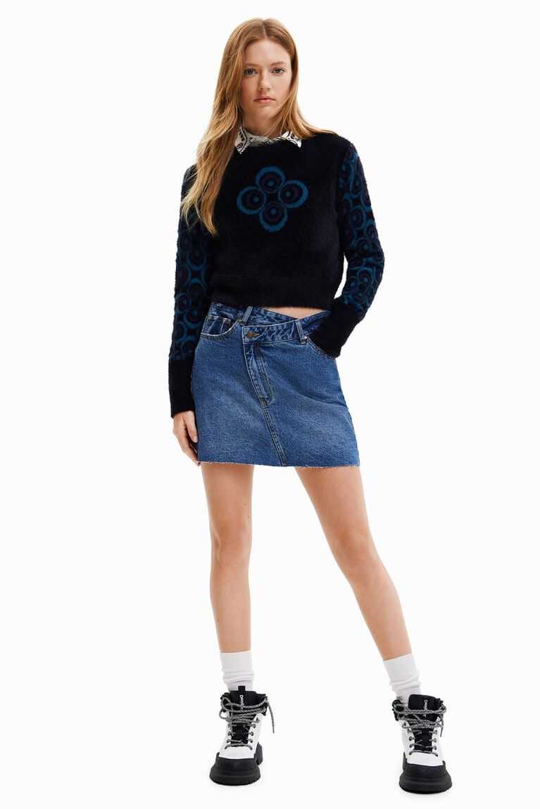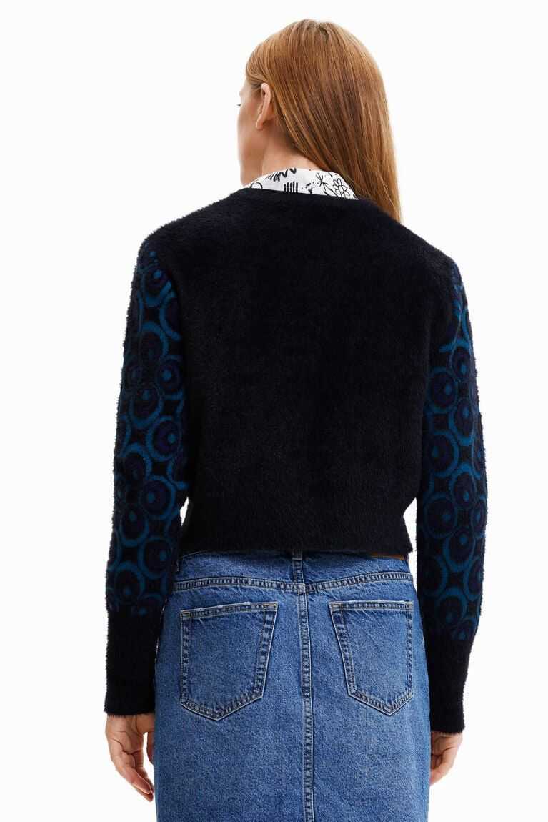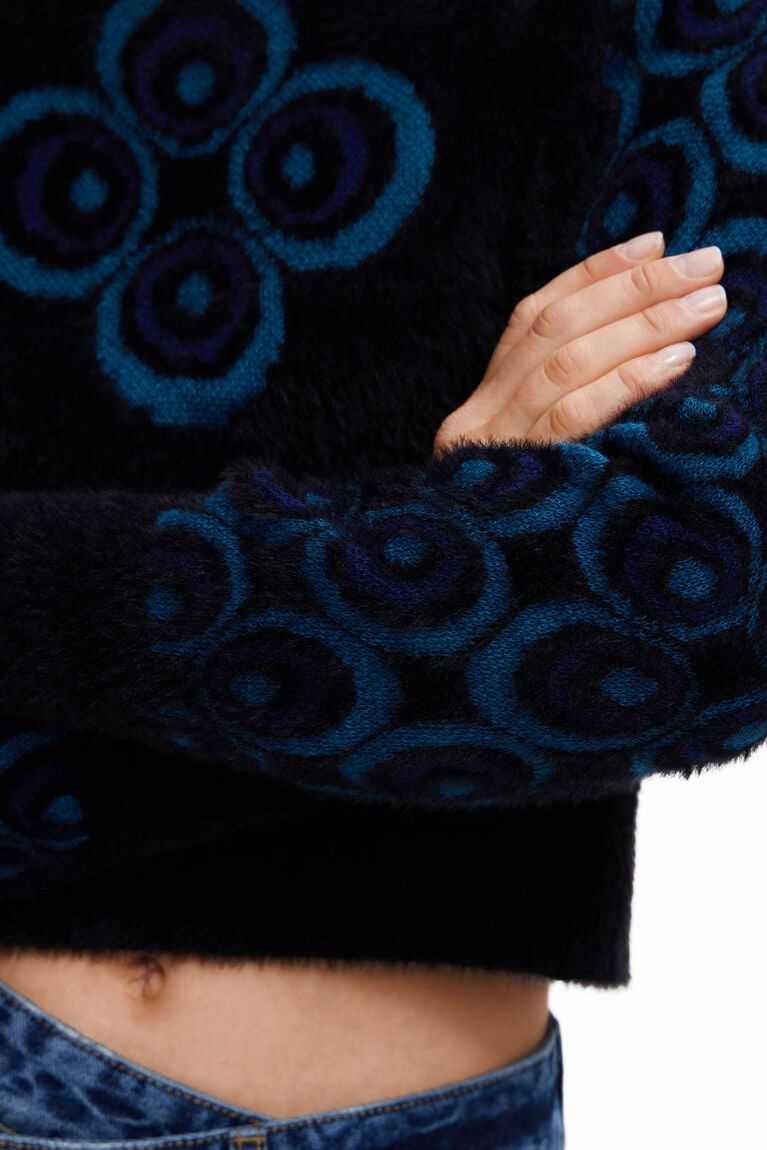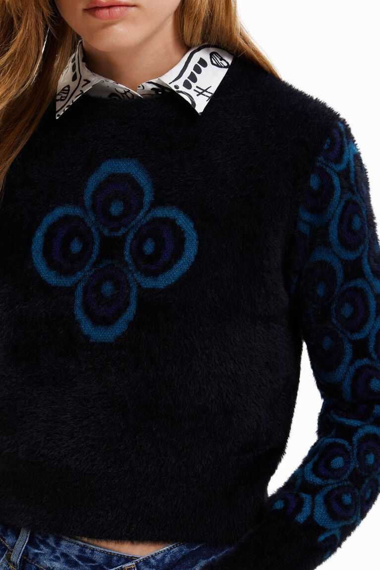 This plush-effect pullover adds a retro touch to your outfit thanks to the pattern of concentric circles on its sleeves. Made from sustainable fibres.