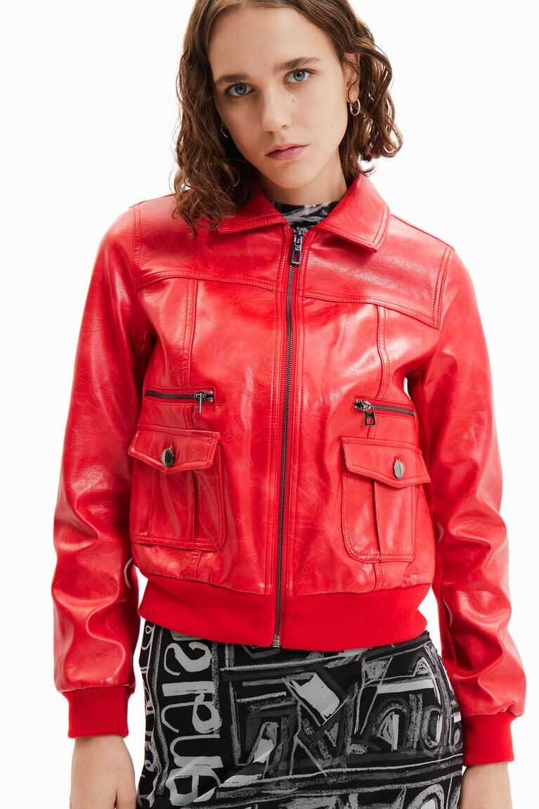 A plain leather-effect PU jacket in a retro style, with four pockets and long sleeves with cuffs and a button.