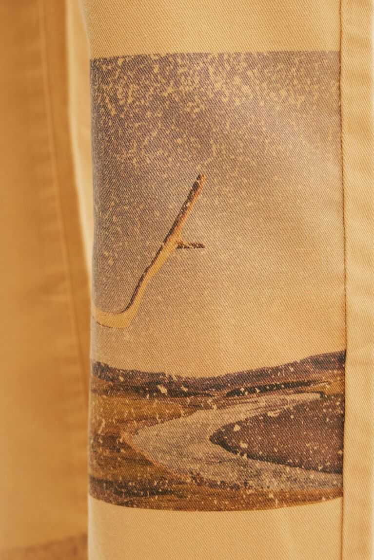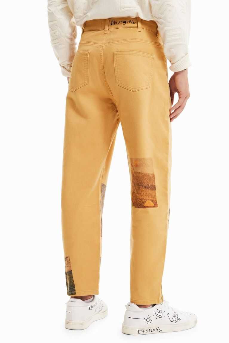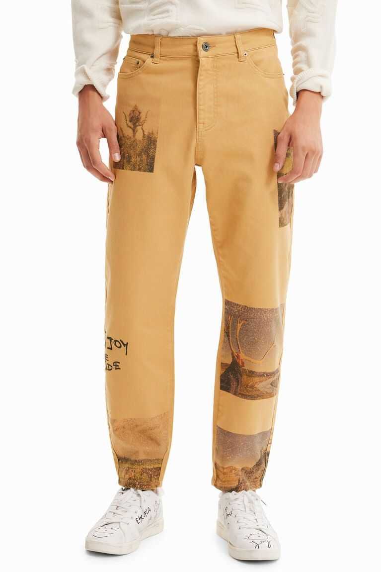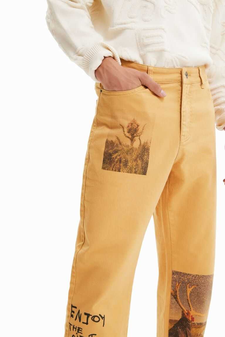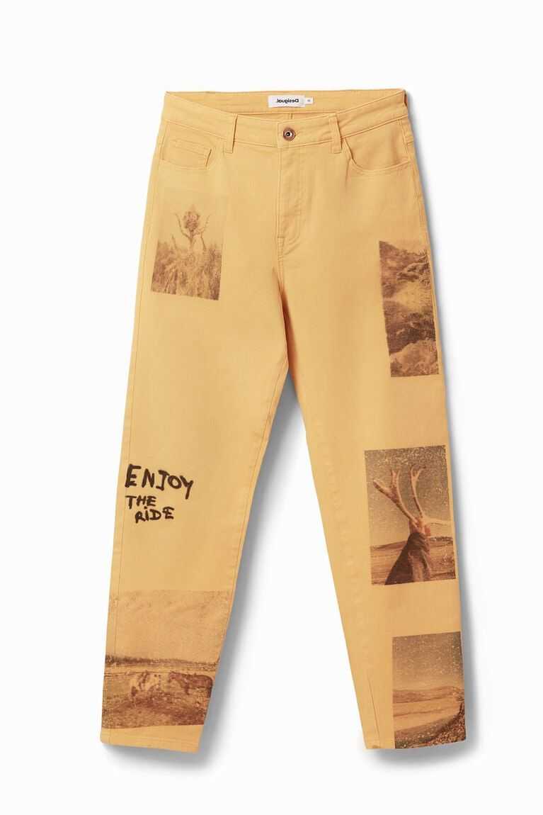 Straight-cut comfort jeans with retro-style postcard details and an "Enjoy the ride" message.