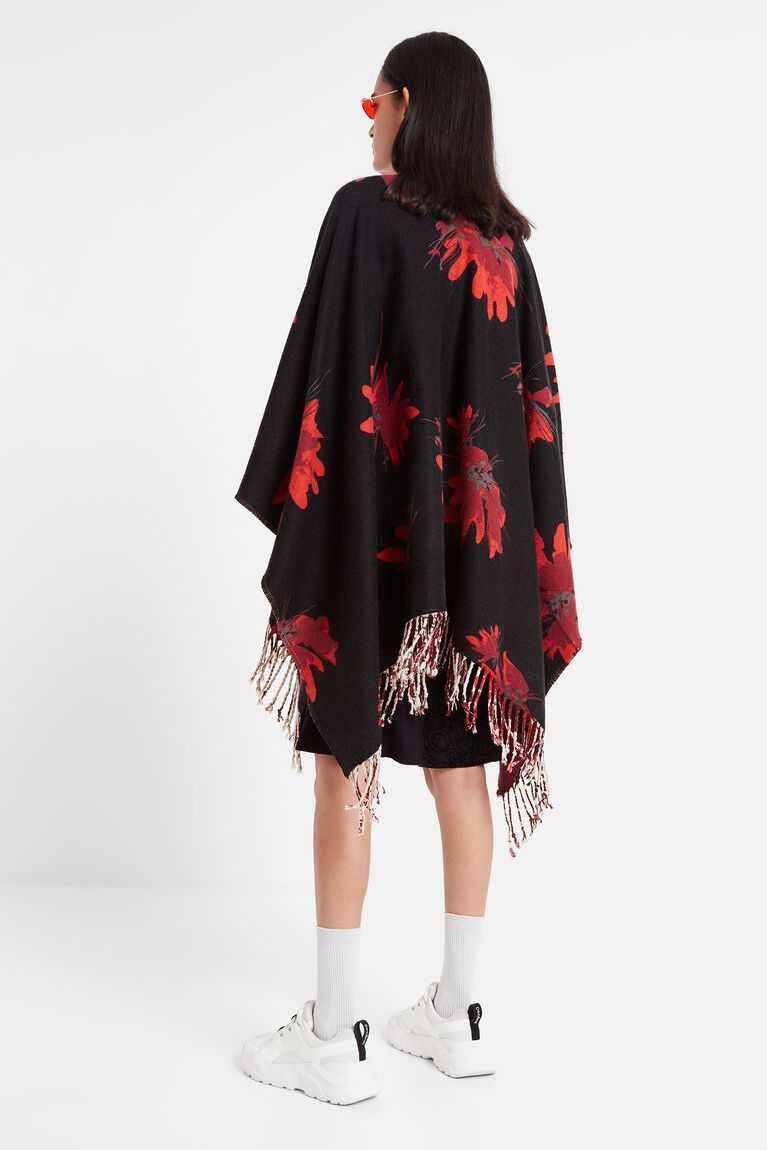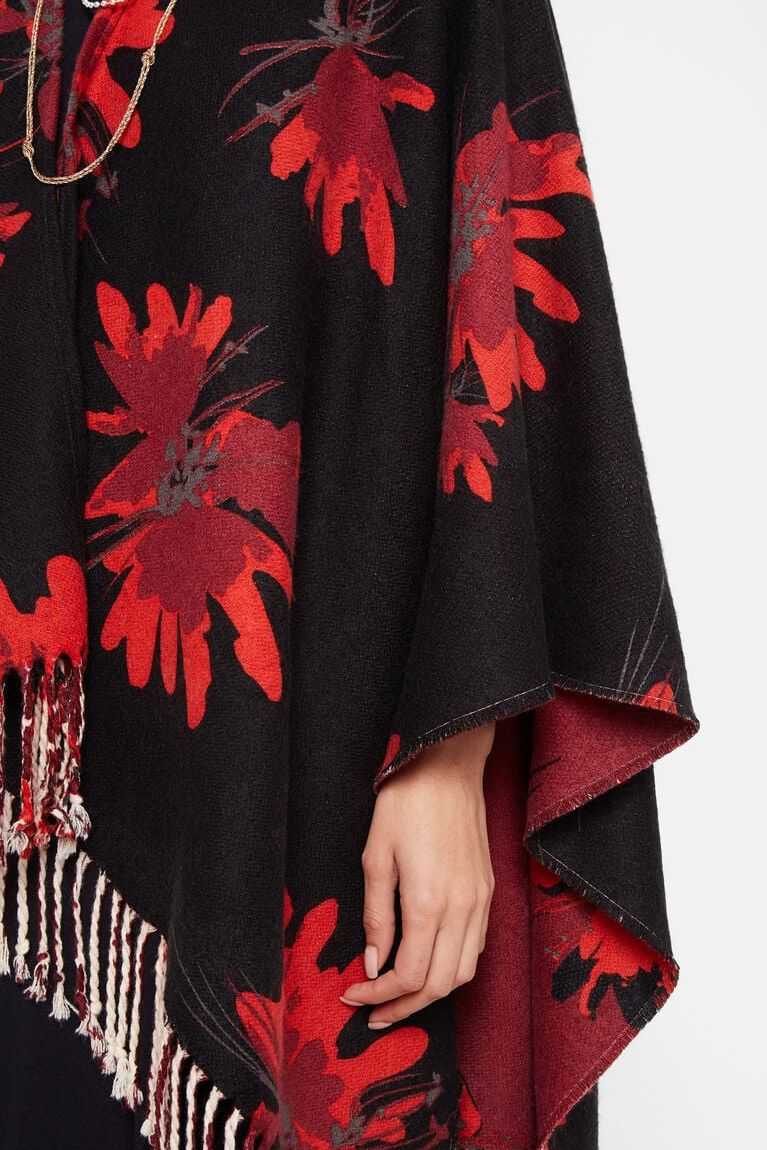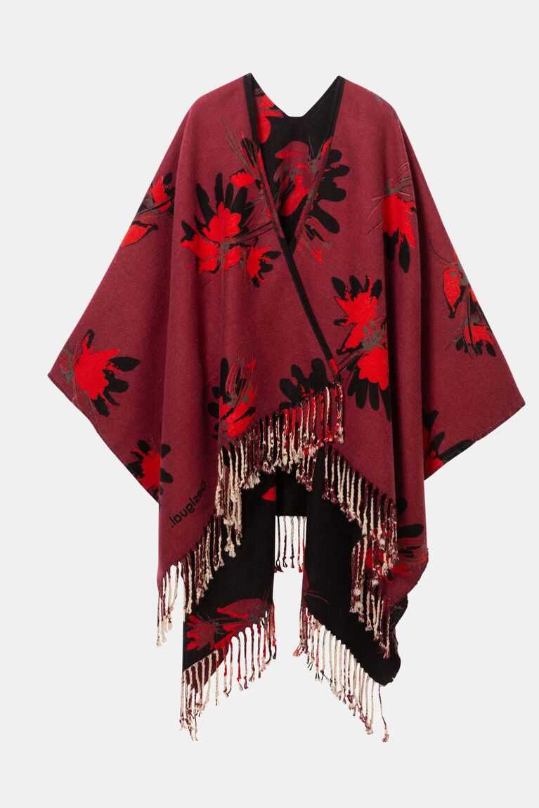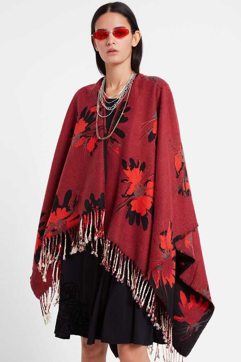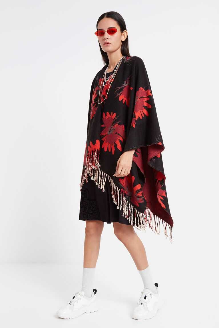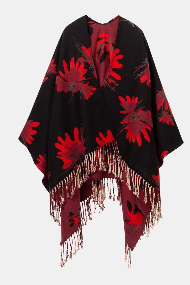 A poncho with elegant boho-inspired floral print finished in braided fringe, knotted at the tip... A basic of every wardrobe, isn't it? And more so still if it is like this reversible poncho that you can show off on one side in black and on the other side in red.