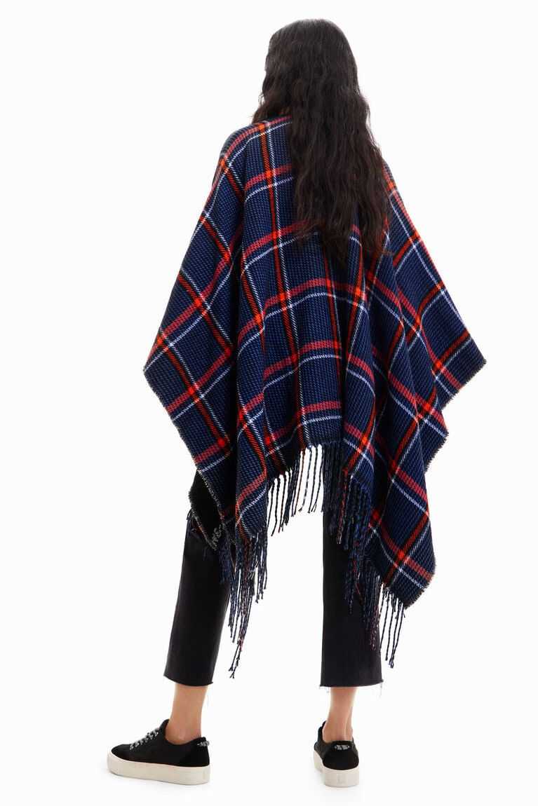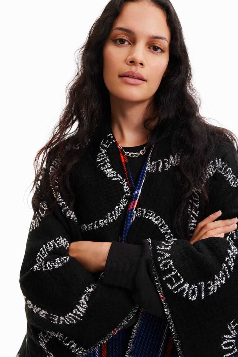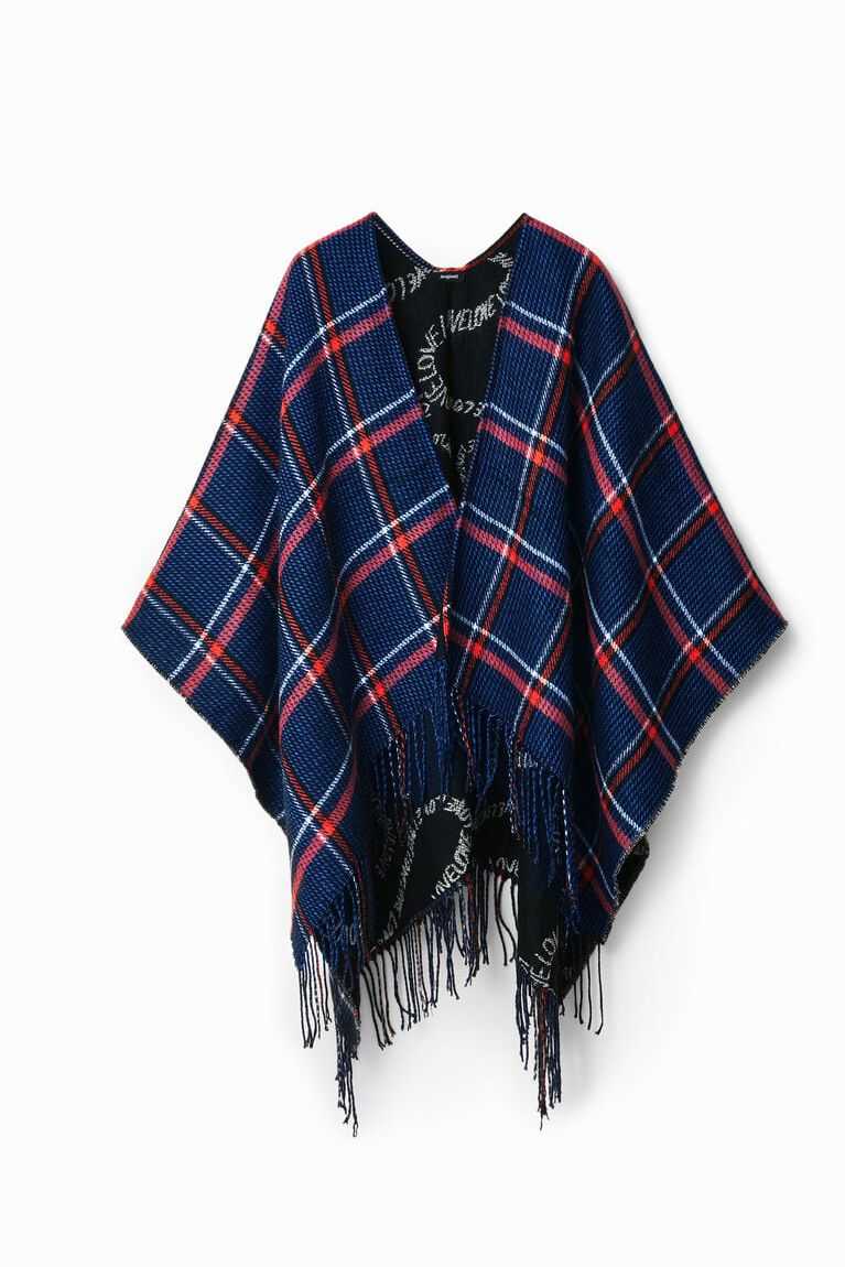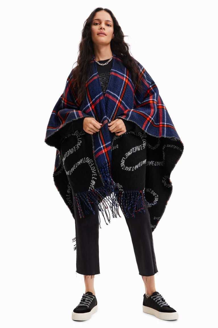 Reversible poncho with plaid on one side and the word "love" in black and white lettering on the other. Longer for a more contemporary look. Made from recycled polyester.