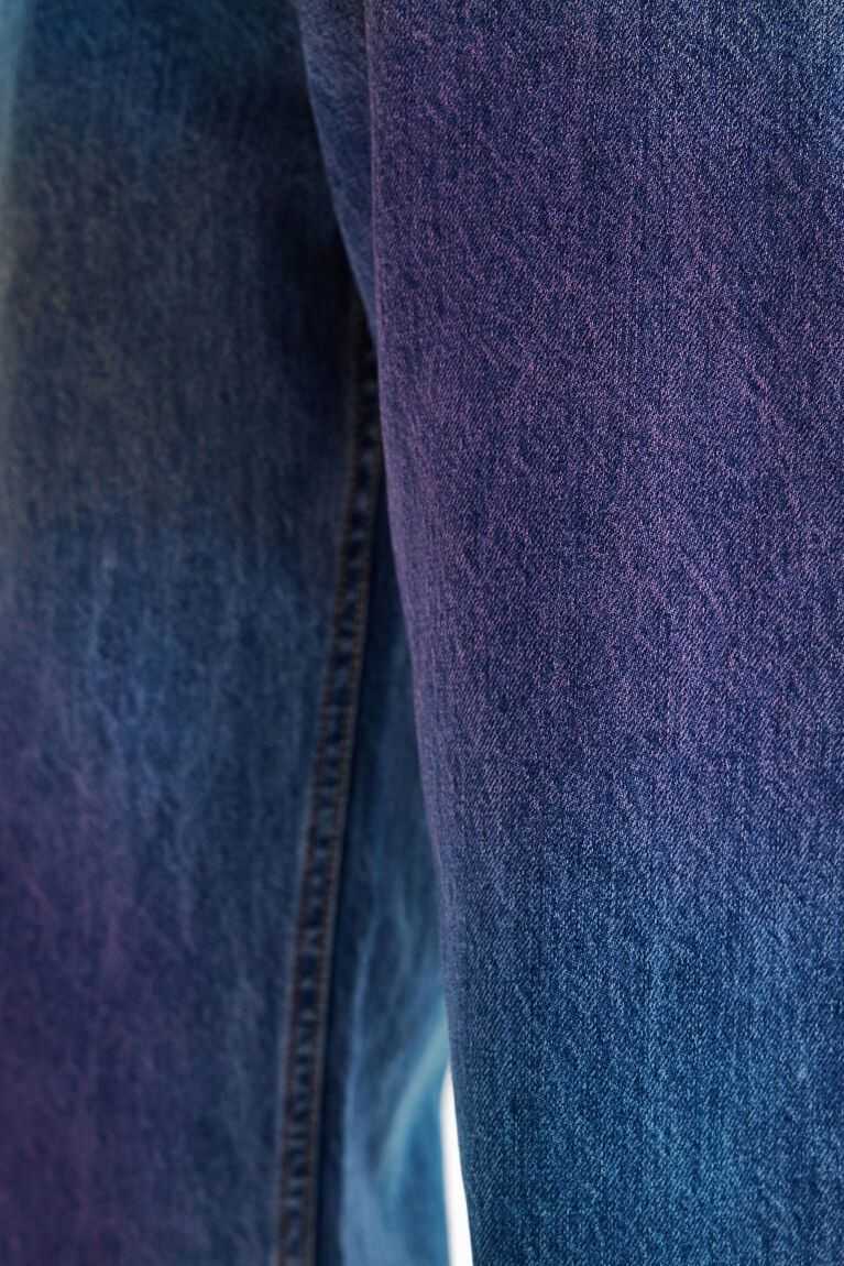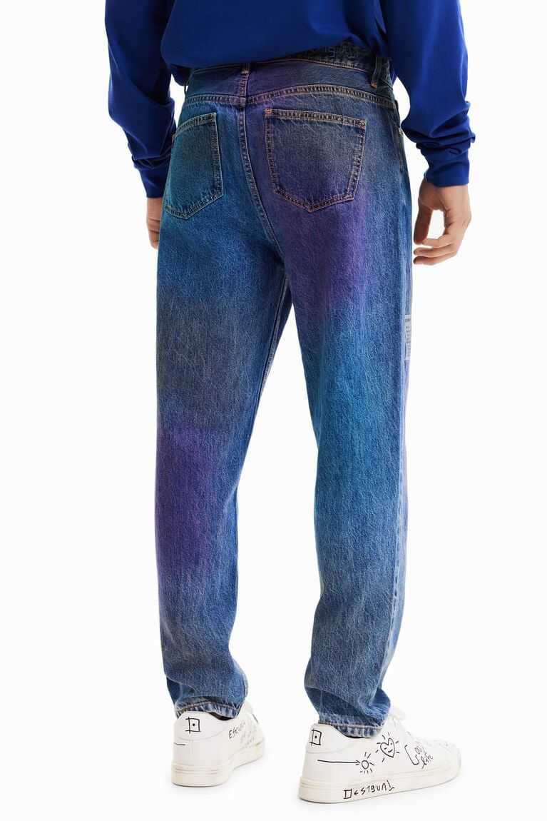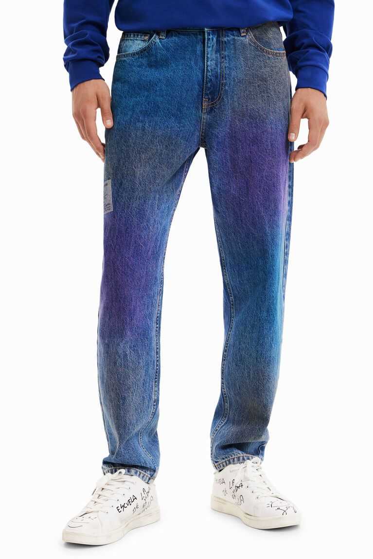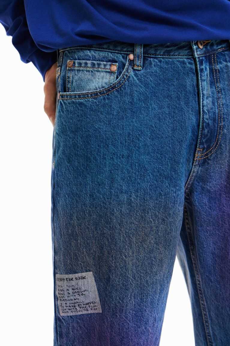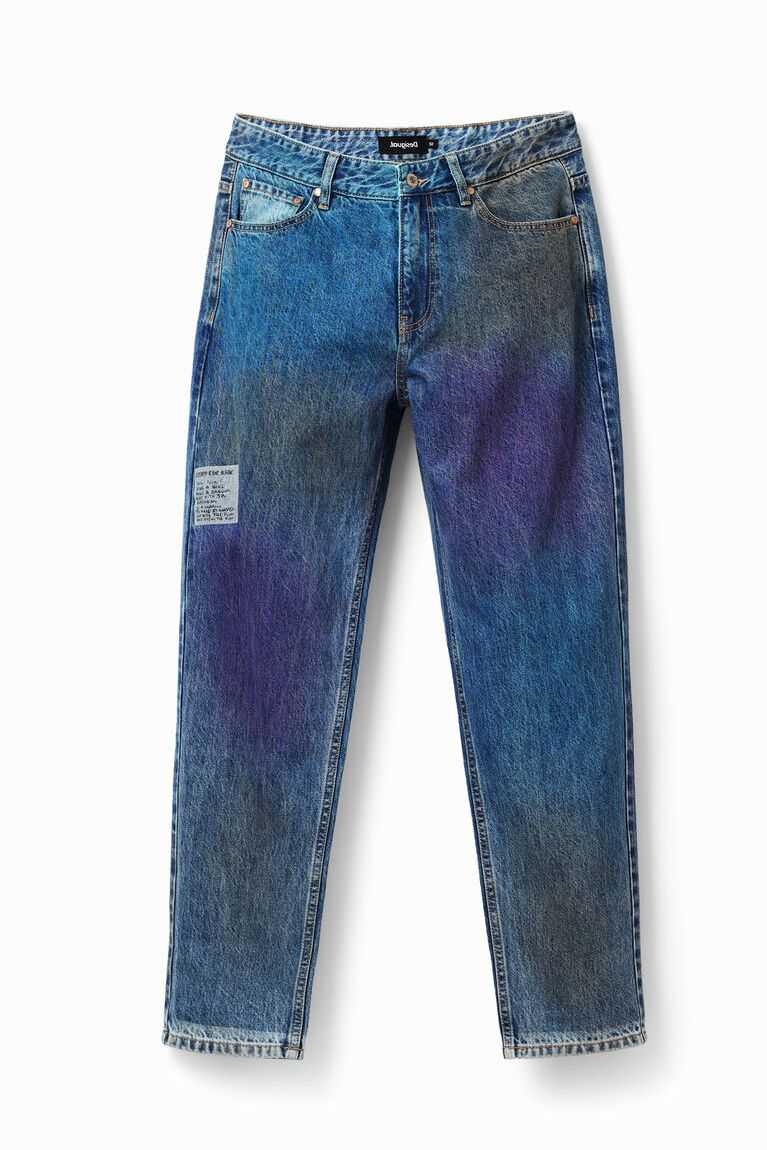 Straight-cut comfort jeans with a distressed-effect in various colours and a patch message detail on one side.