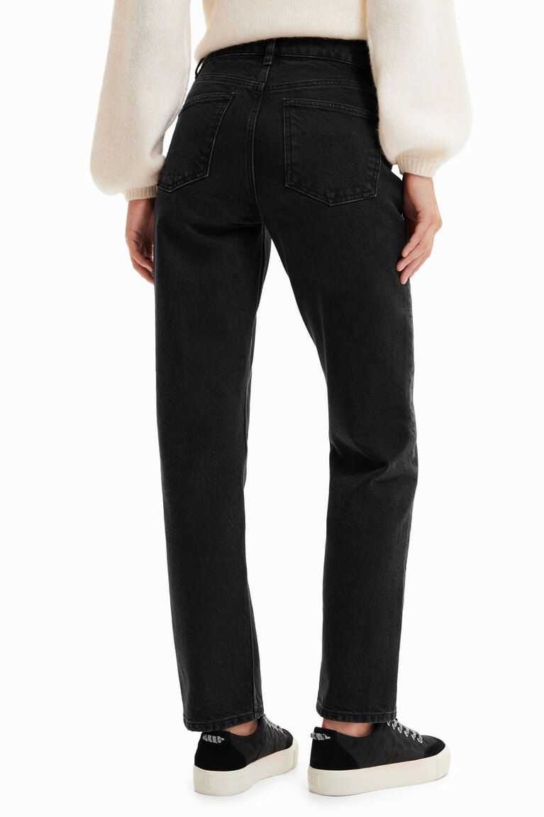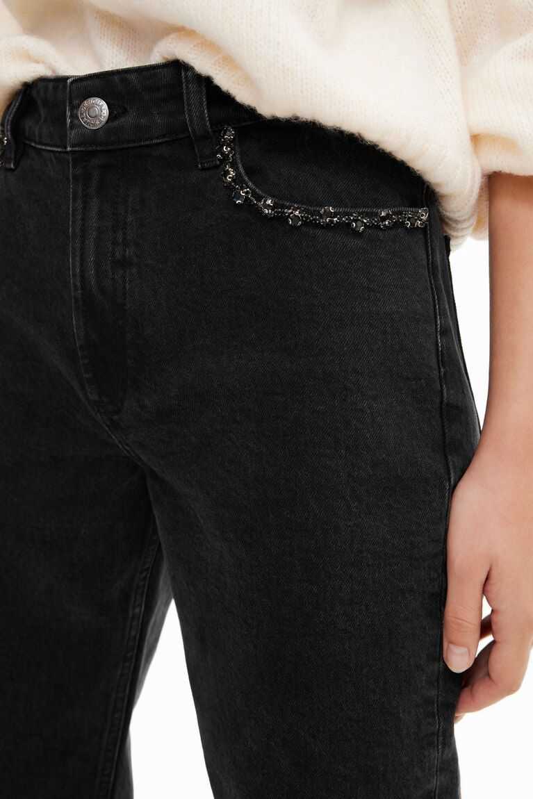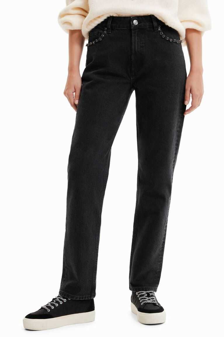 Straight-cut, mid-rise jeans with subtly fitted legs in fabric with a hint of stretch. Featuring a rhinestone chain on the pockets.