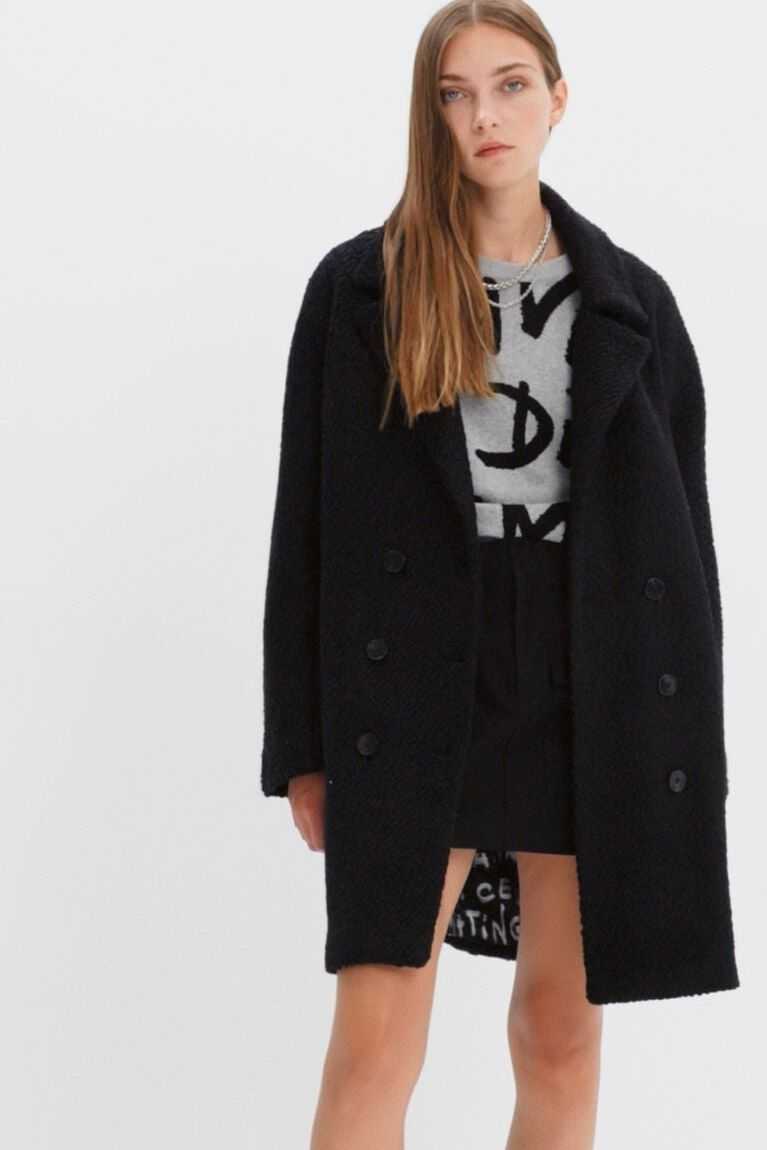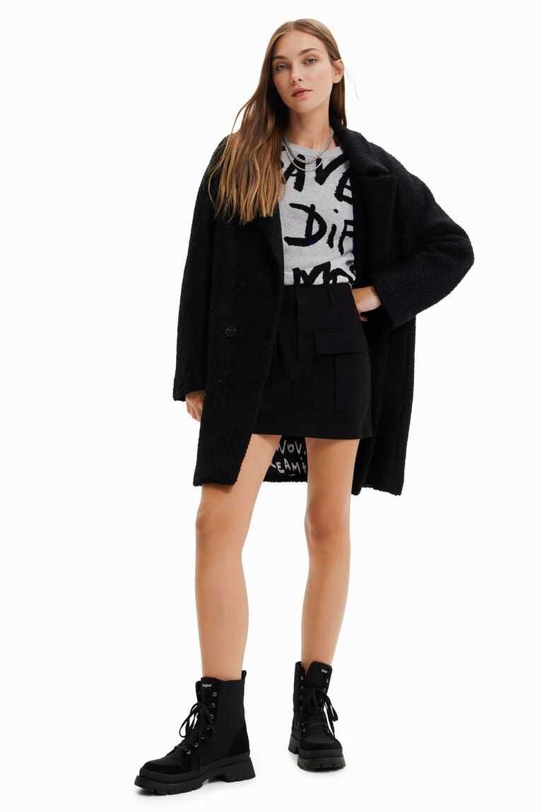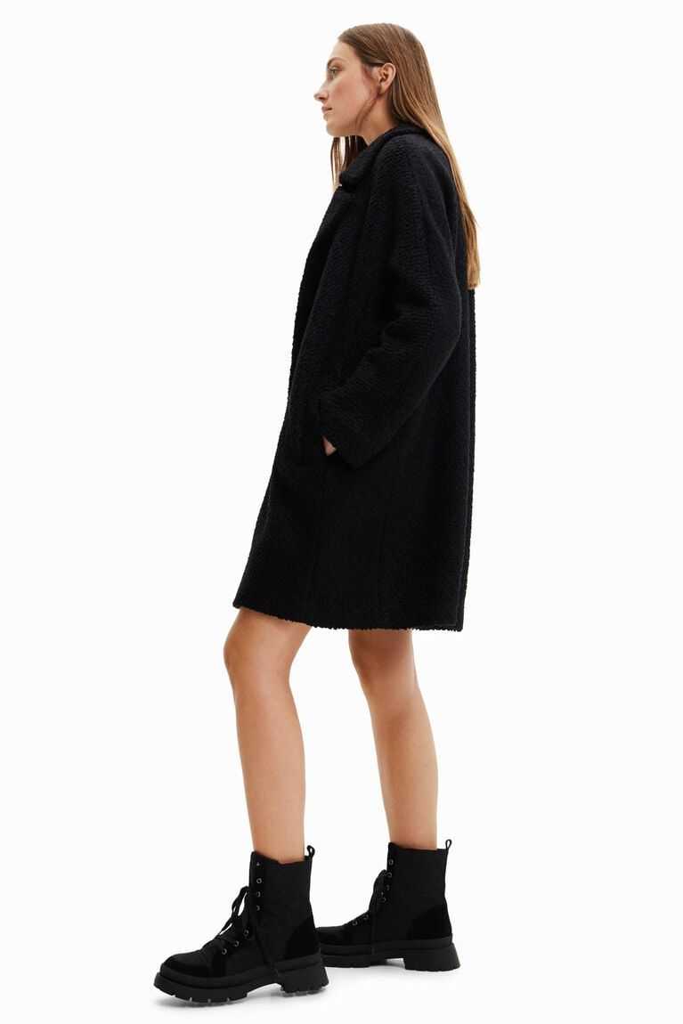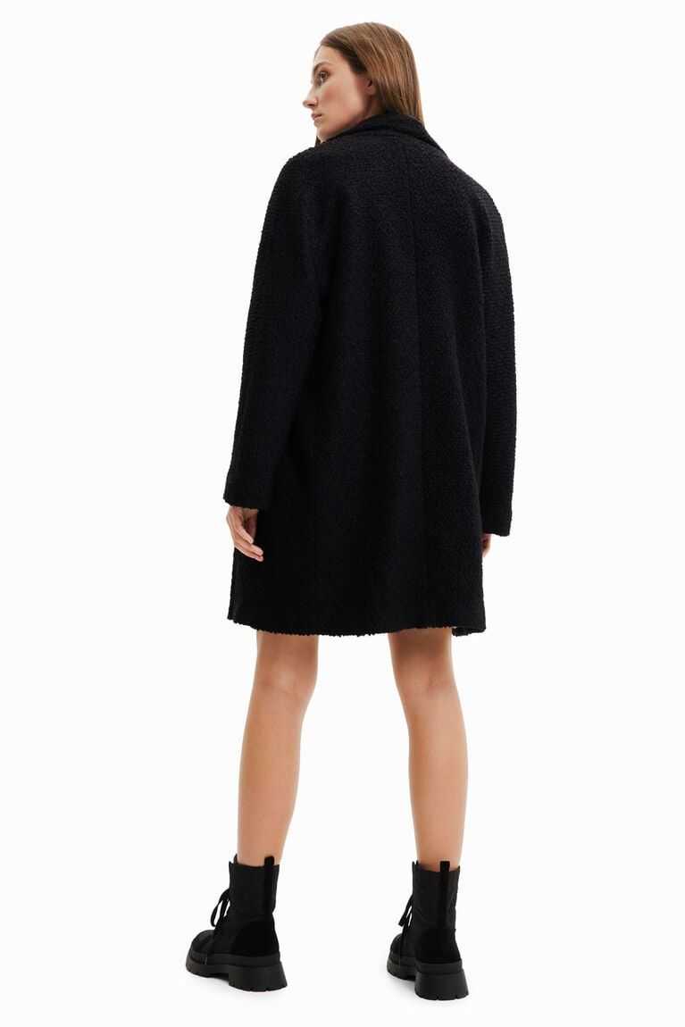 A straight double-breasted coat in very soft wool, with lapels and button fastening.