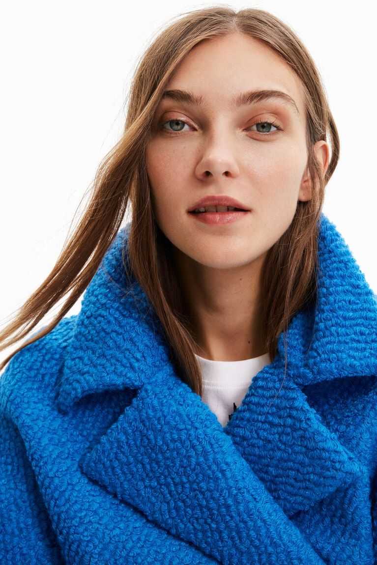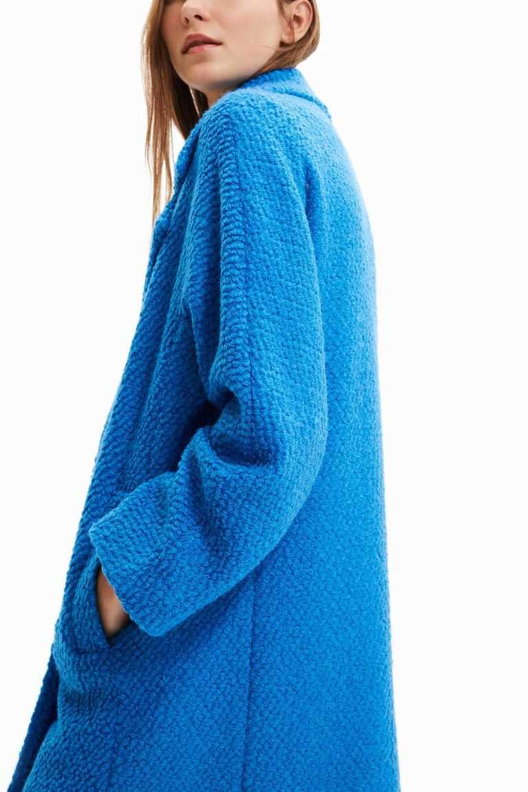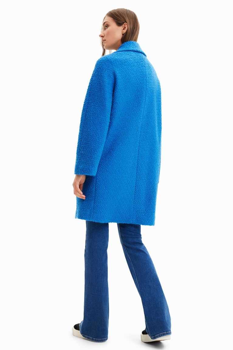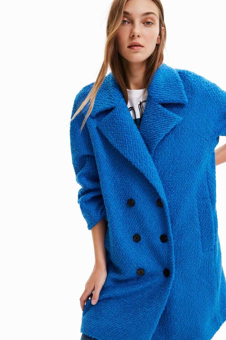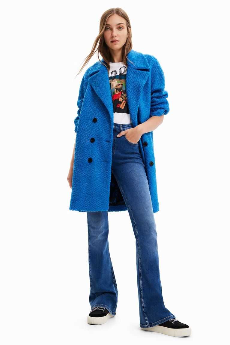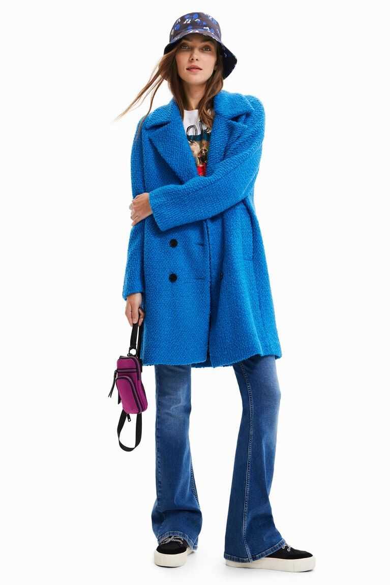 A straight double-breasted coat in very soft wool, with lapels and button fastening.