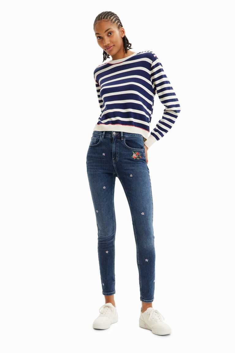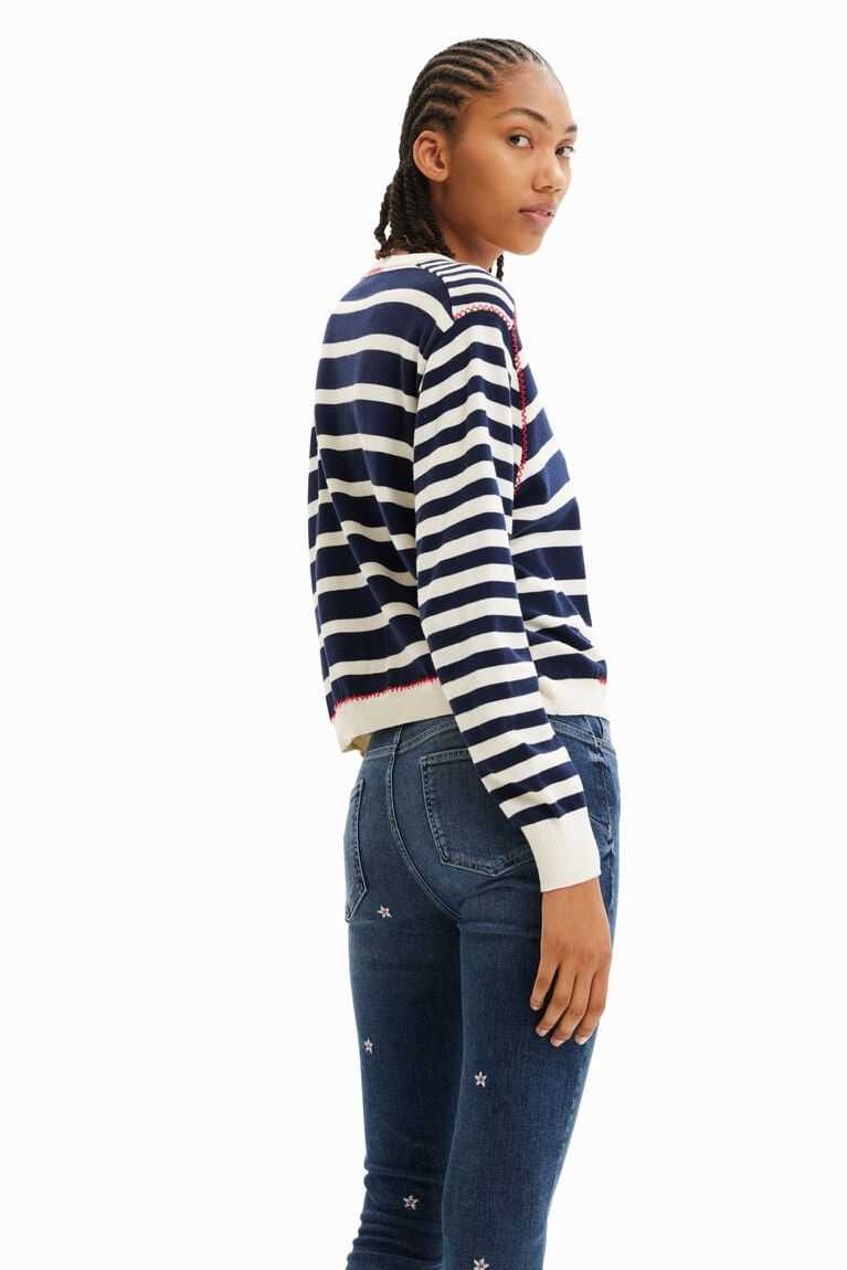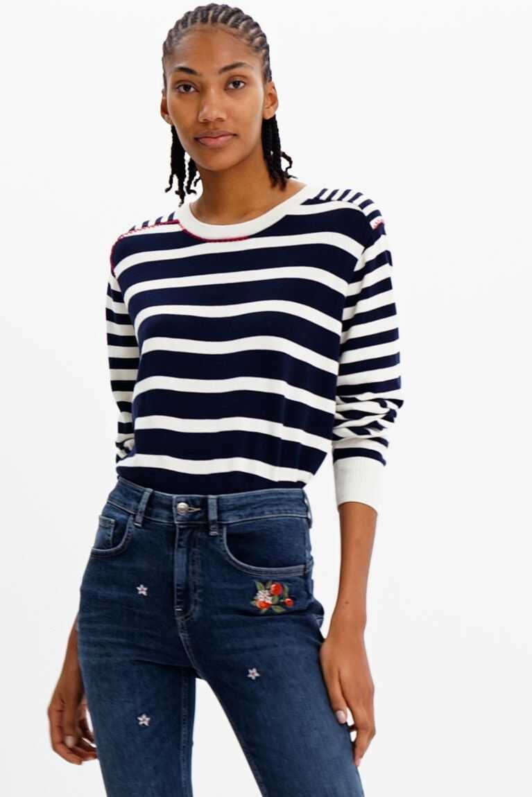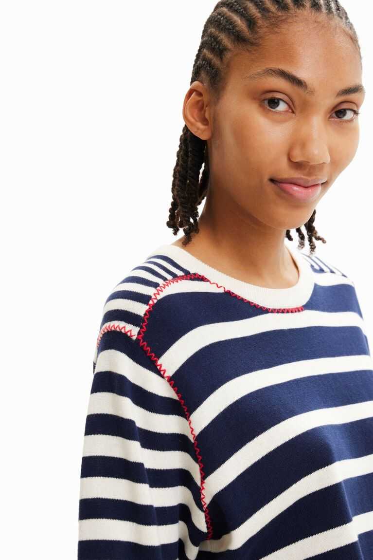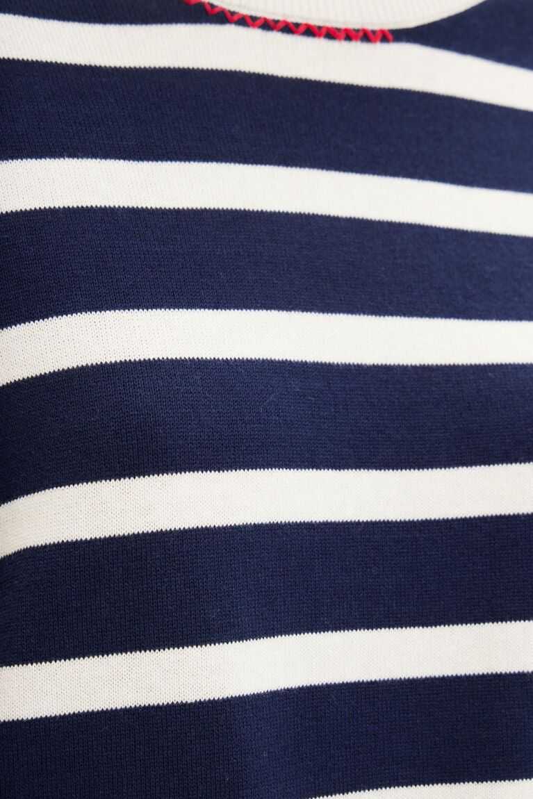 A long-sleeve crewneck pullover in fine knit with sailor stripes of different thicknesses.