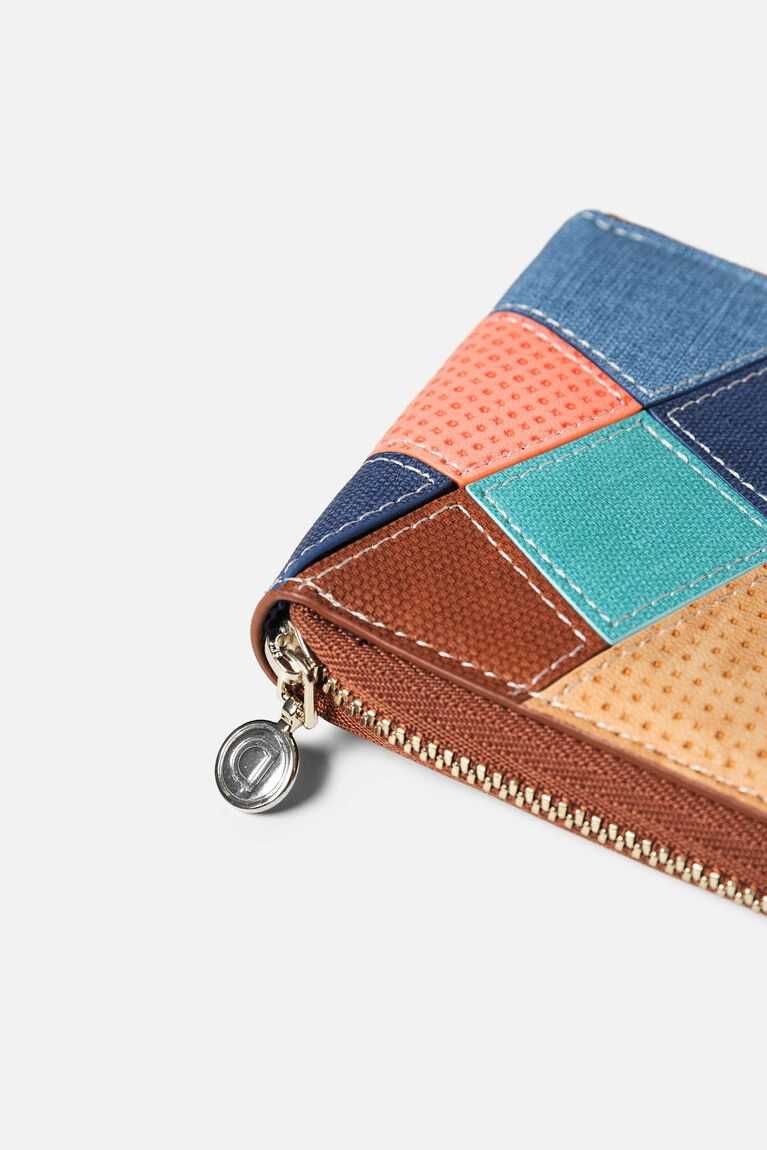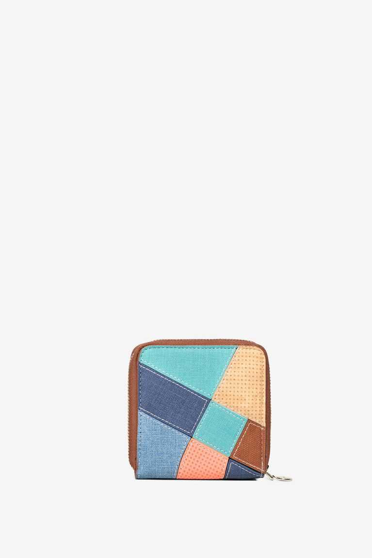 Small, square and without a doubt, unique. This coin purse of patch by zones in coral, blue and camel tones fill you with colour each time that you take it out to show it off. It's a unique accessory and very easy to put away thanks to its reduced size.