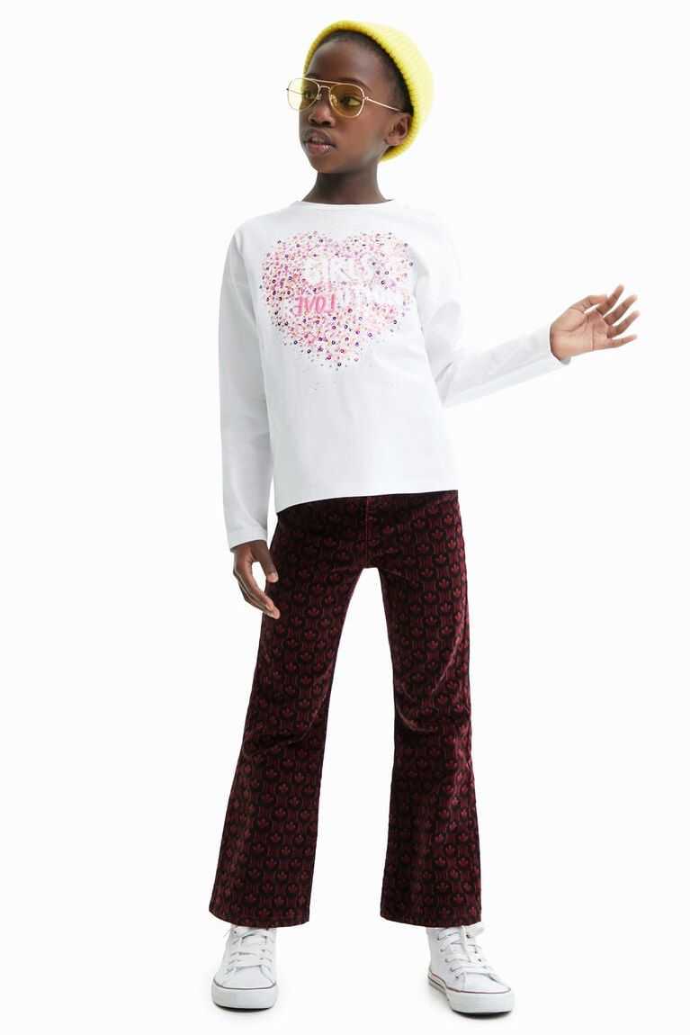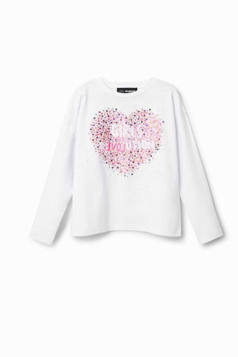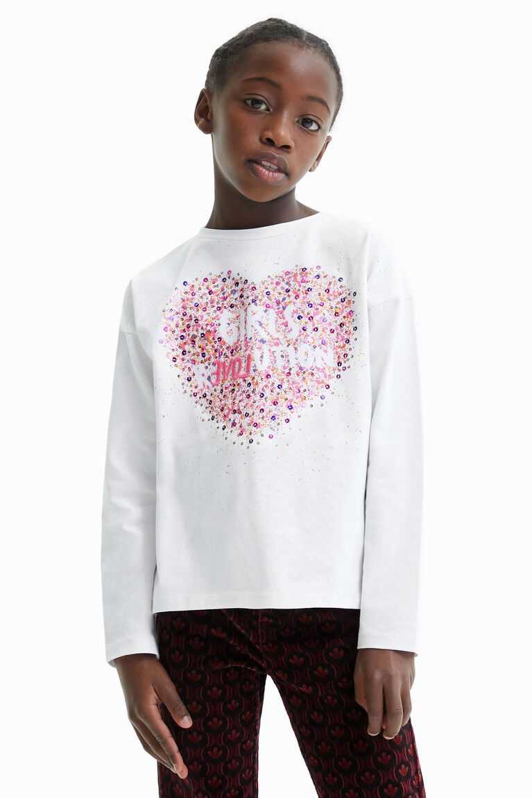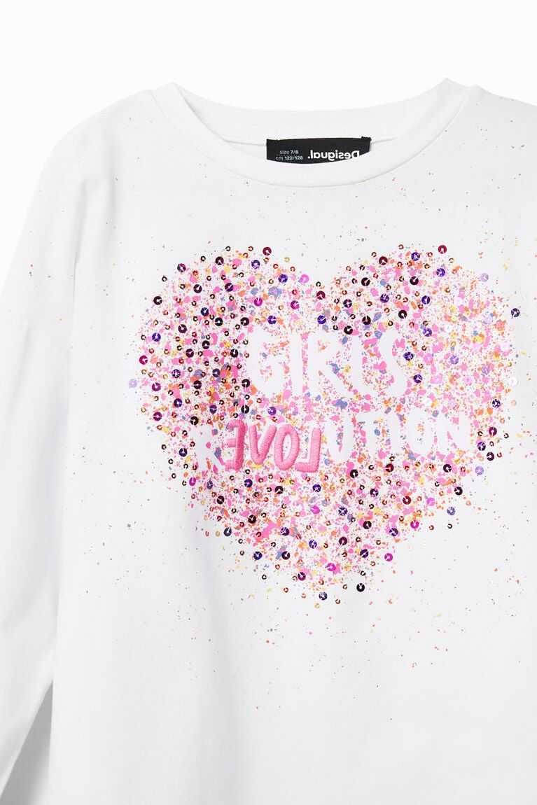 Sparkle and colour on this long-sleeve T-shirt. Featuring sequins and splatter-effect coloured spots in the shape of a heart with the message "Girl Revolution".