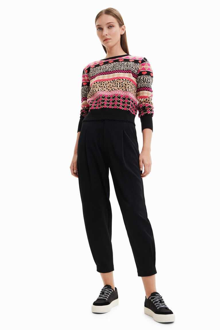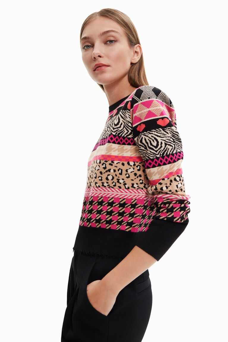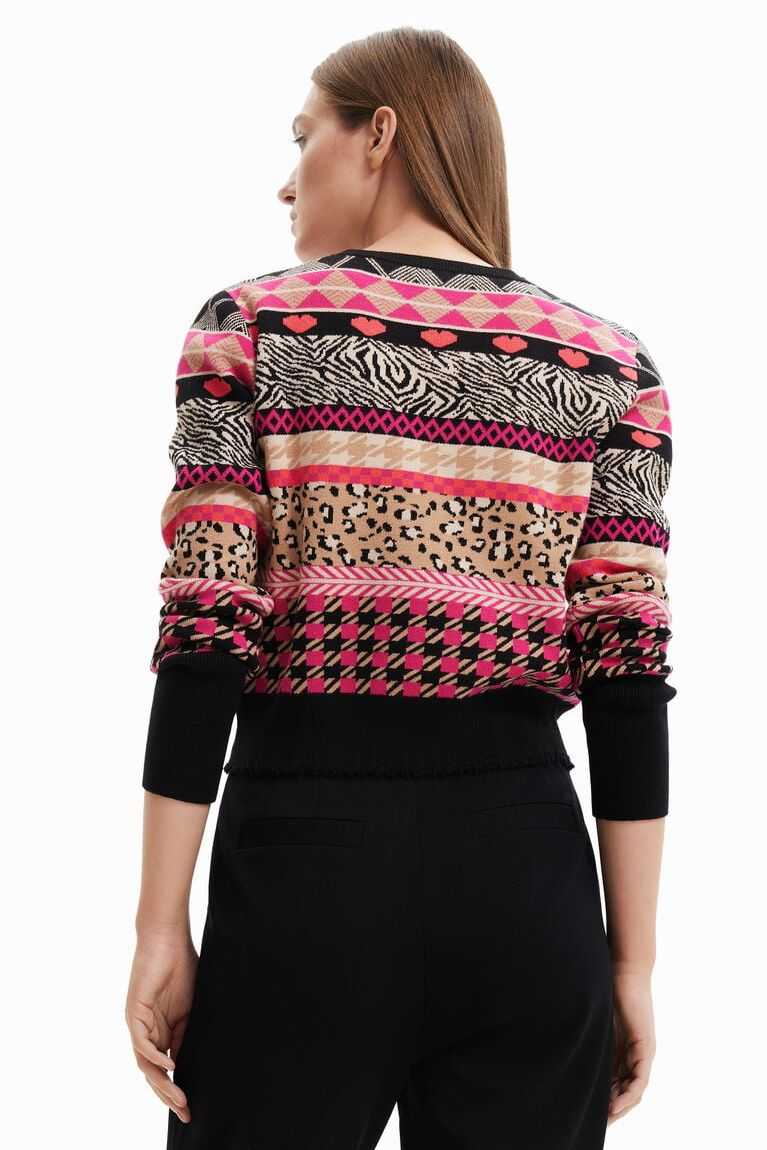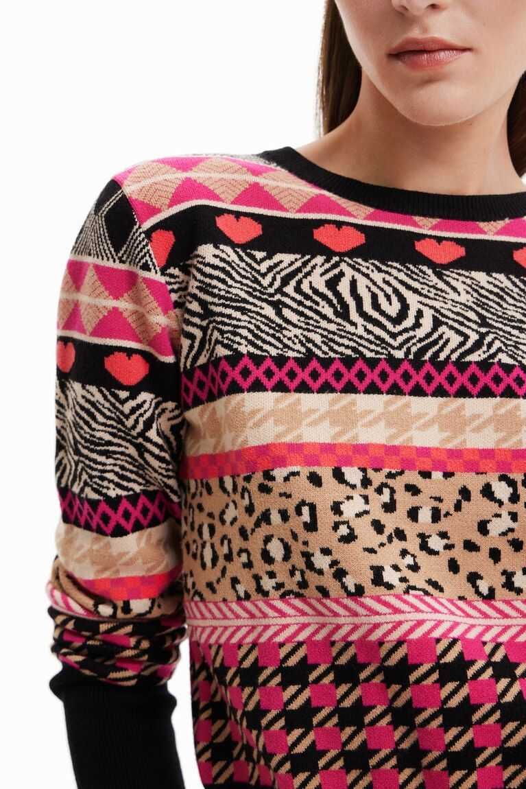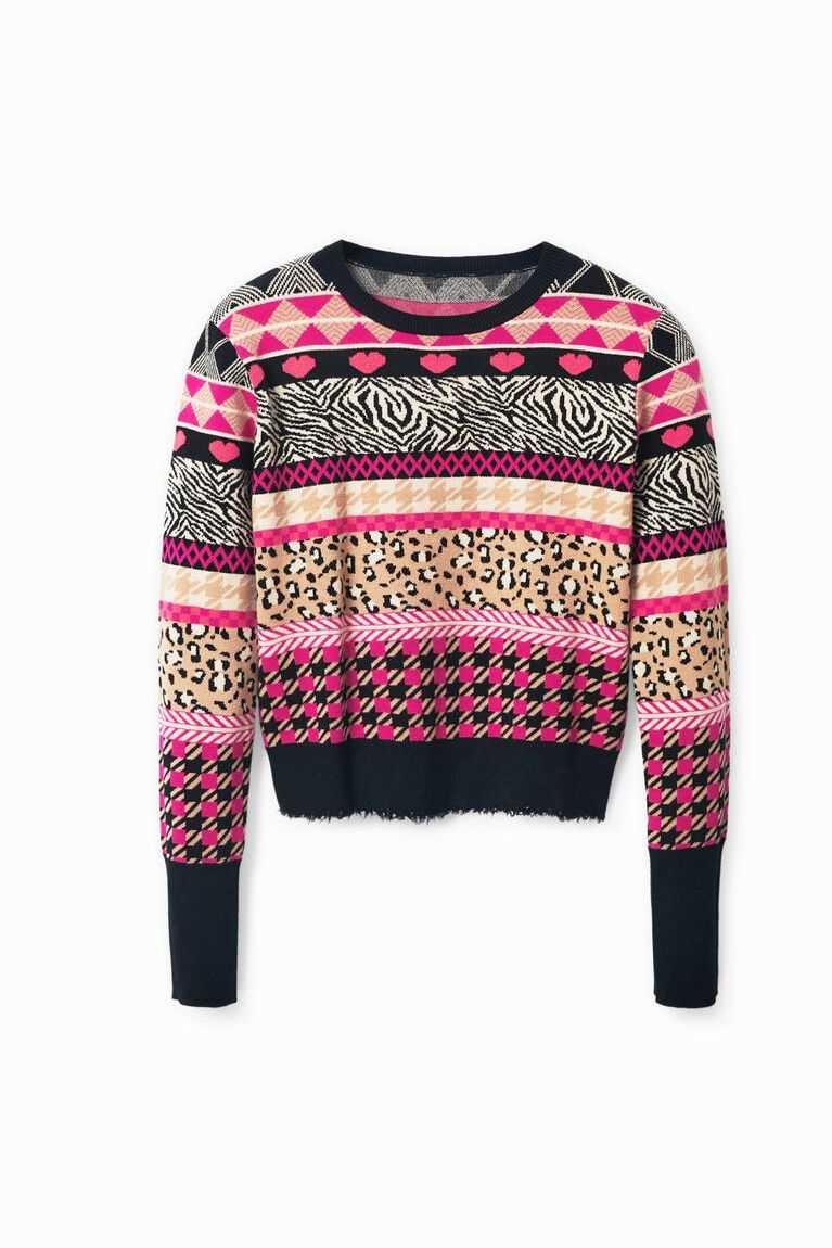 A fitted jacquard knit pullover with borders in animal print, plaid and hearts.