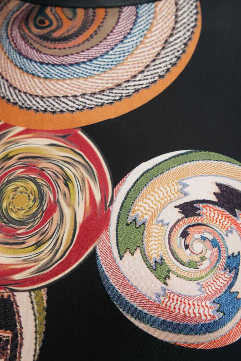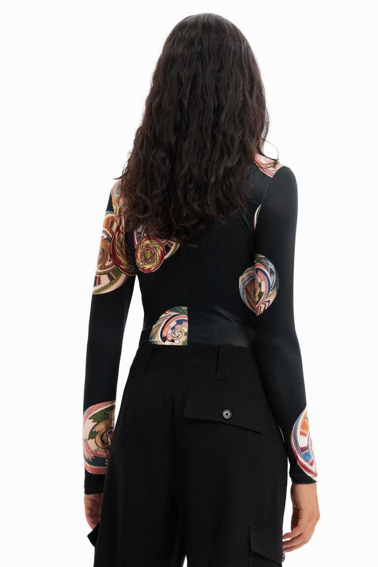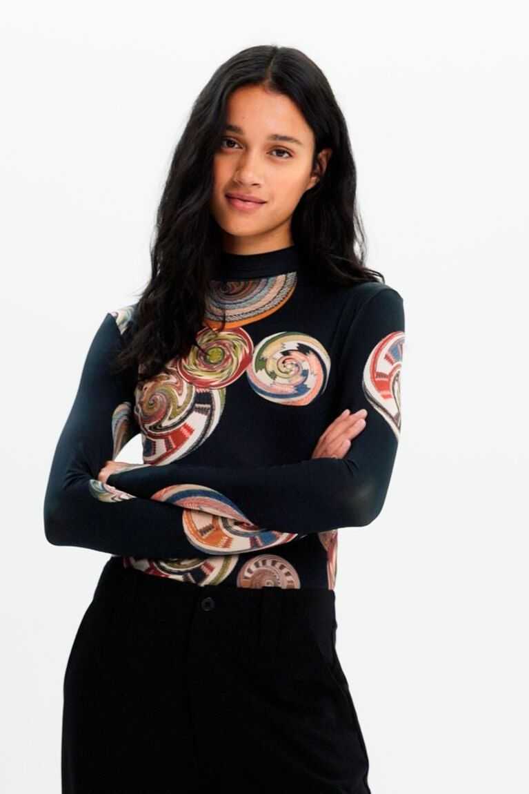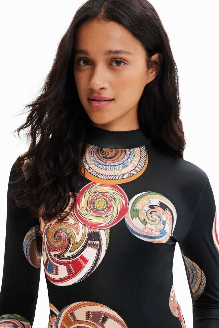A fitted long-sleeve body with a roll neck and contrasting print of different sized circles.