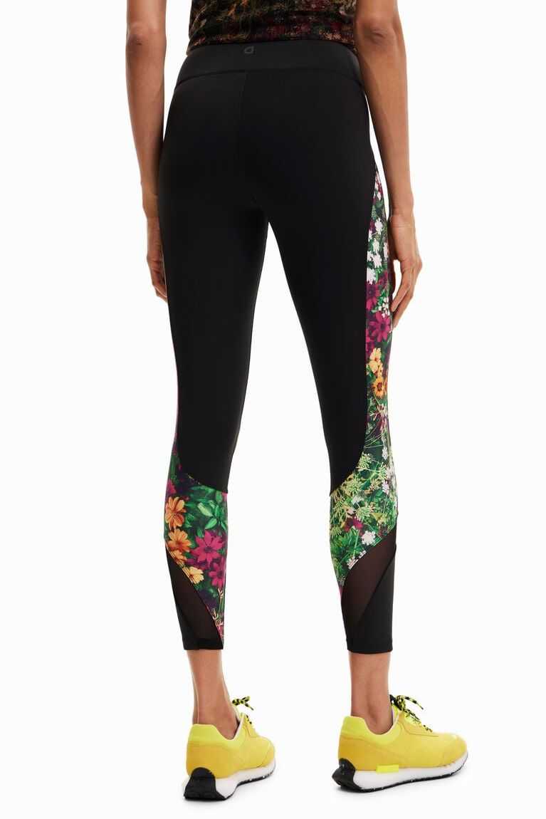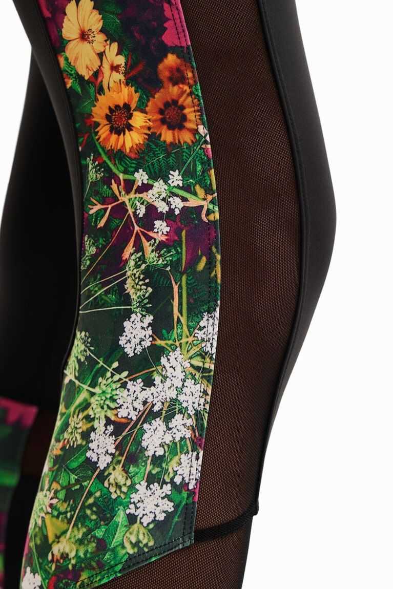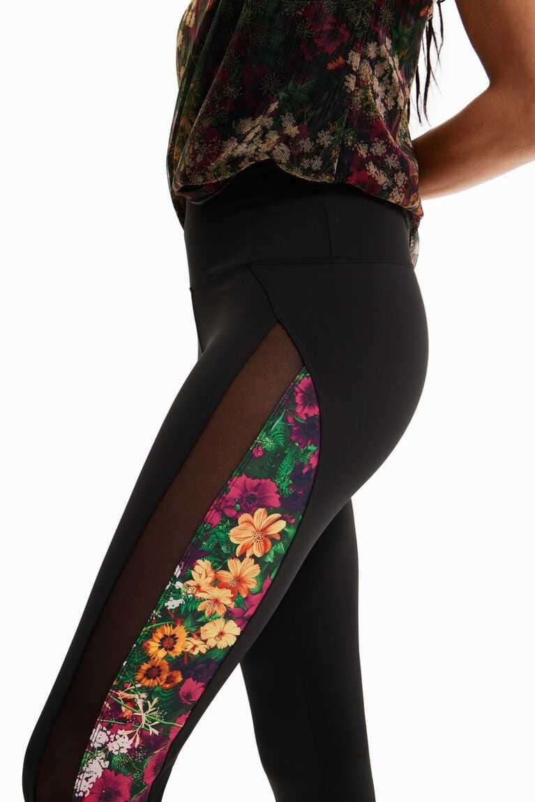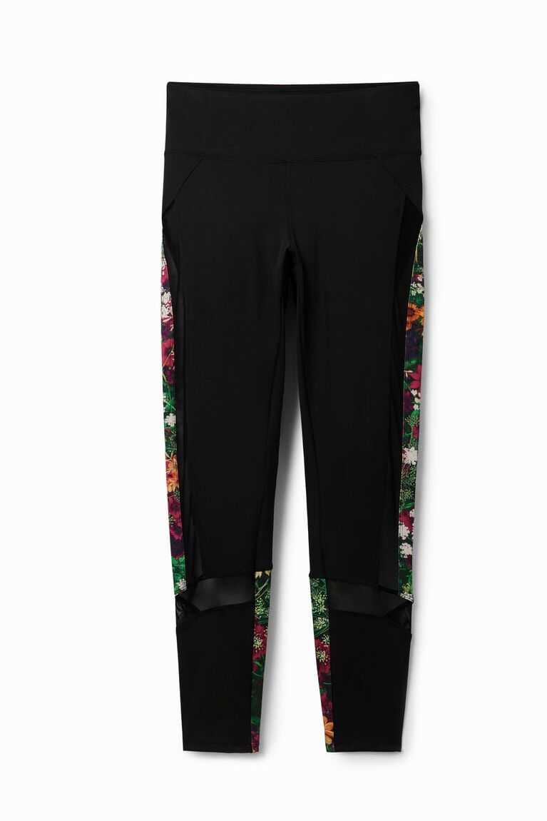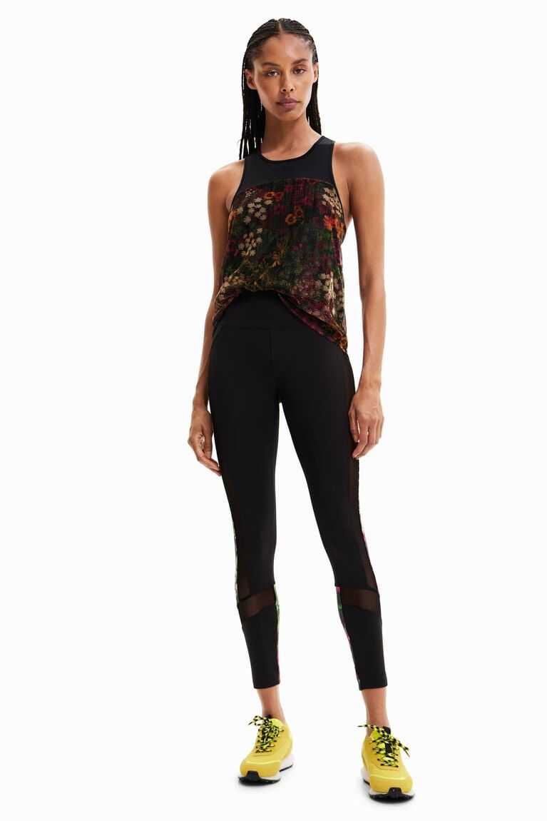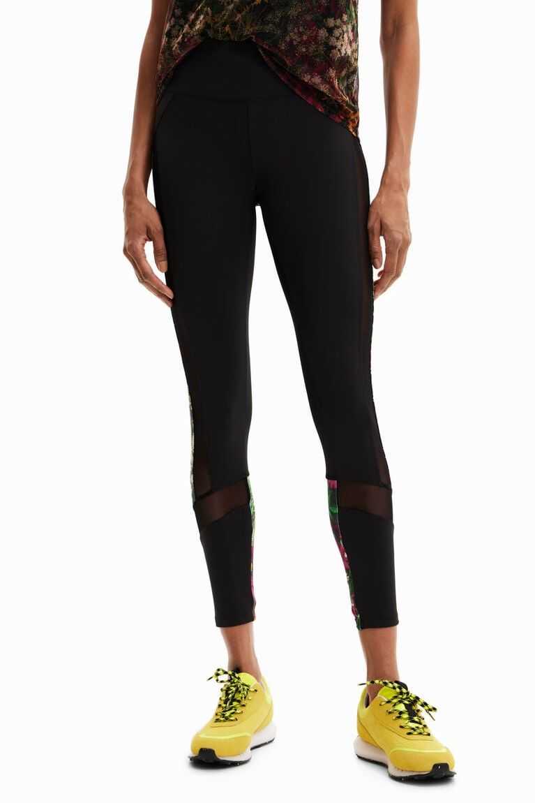 Fitted high-waisted leggings with semi-transparent mesh details and printed stripe on the side.