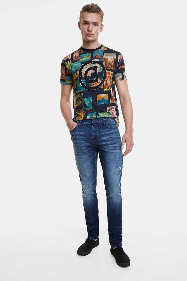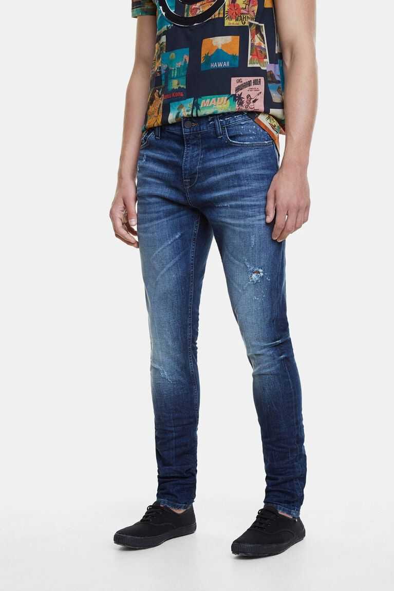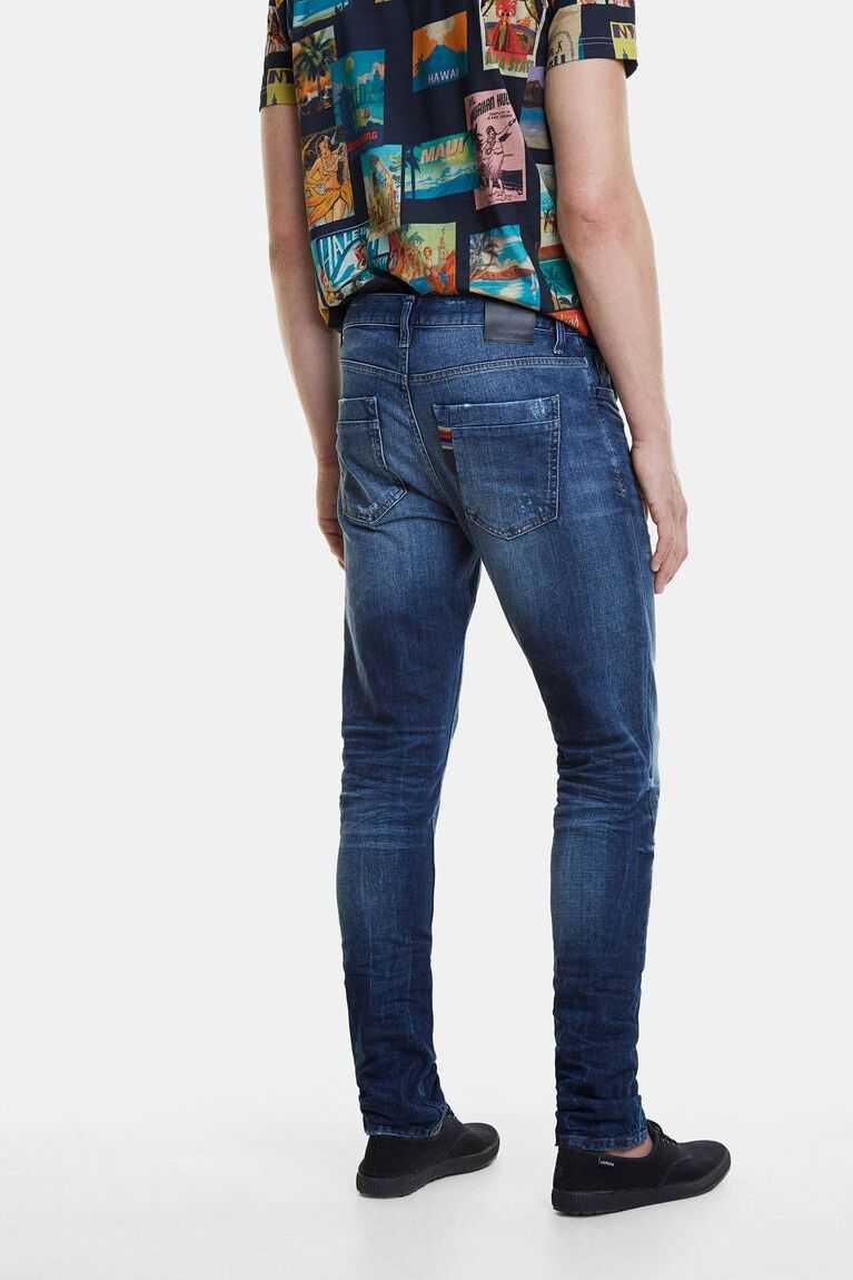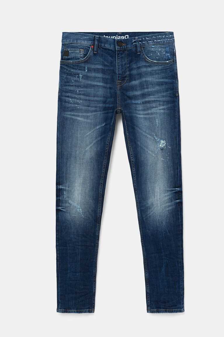 These basic fitted jeans with a dark blue wash will be your favourites, because they'll always look good on you. Desigual bets on better quality in the fabrics so they'll stay like new from the first day. And to modernize them, they have a faded effect, message on the waistband, and decorative tears.