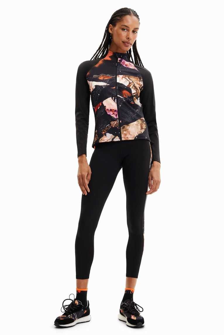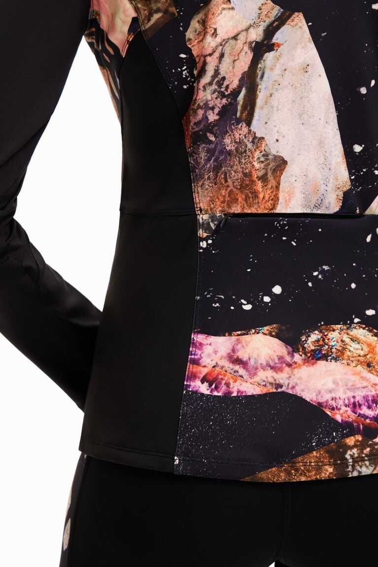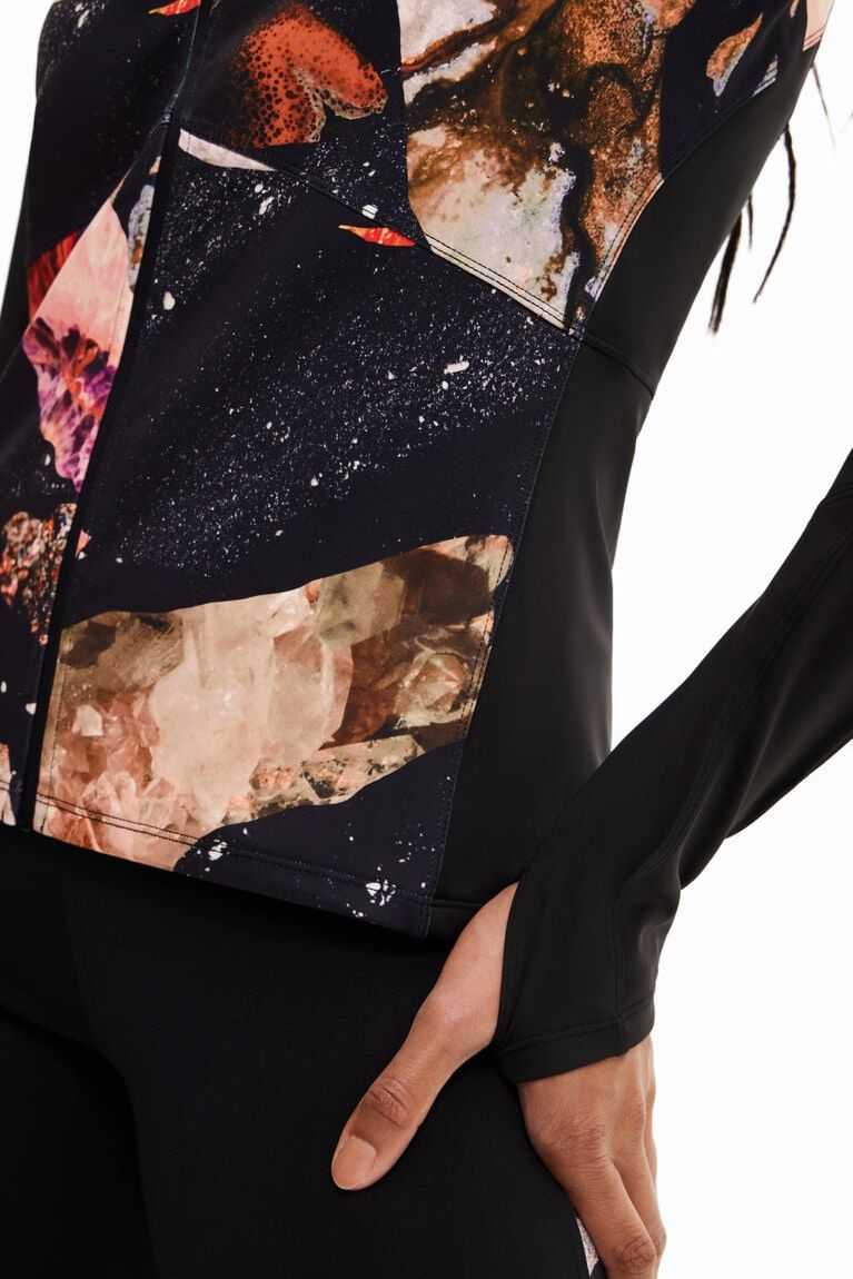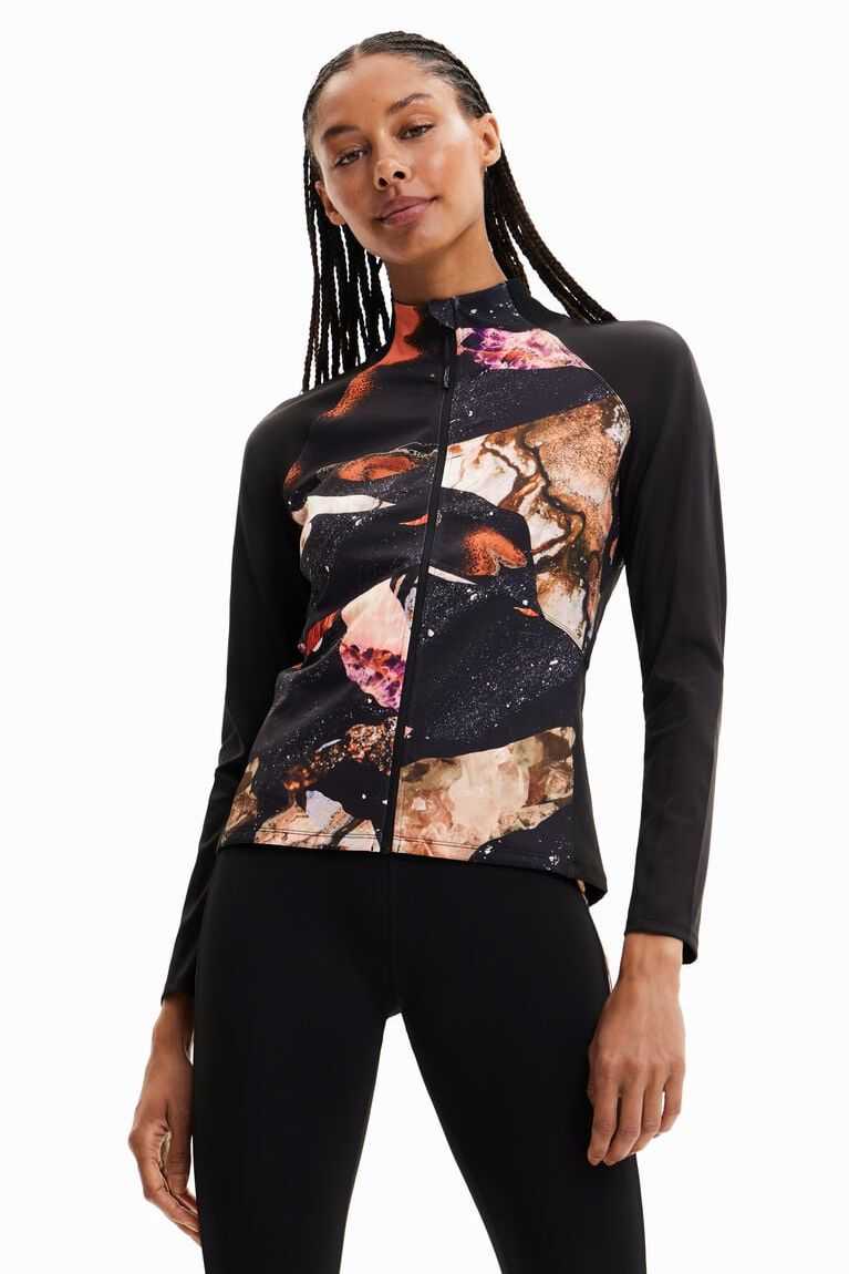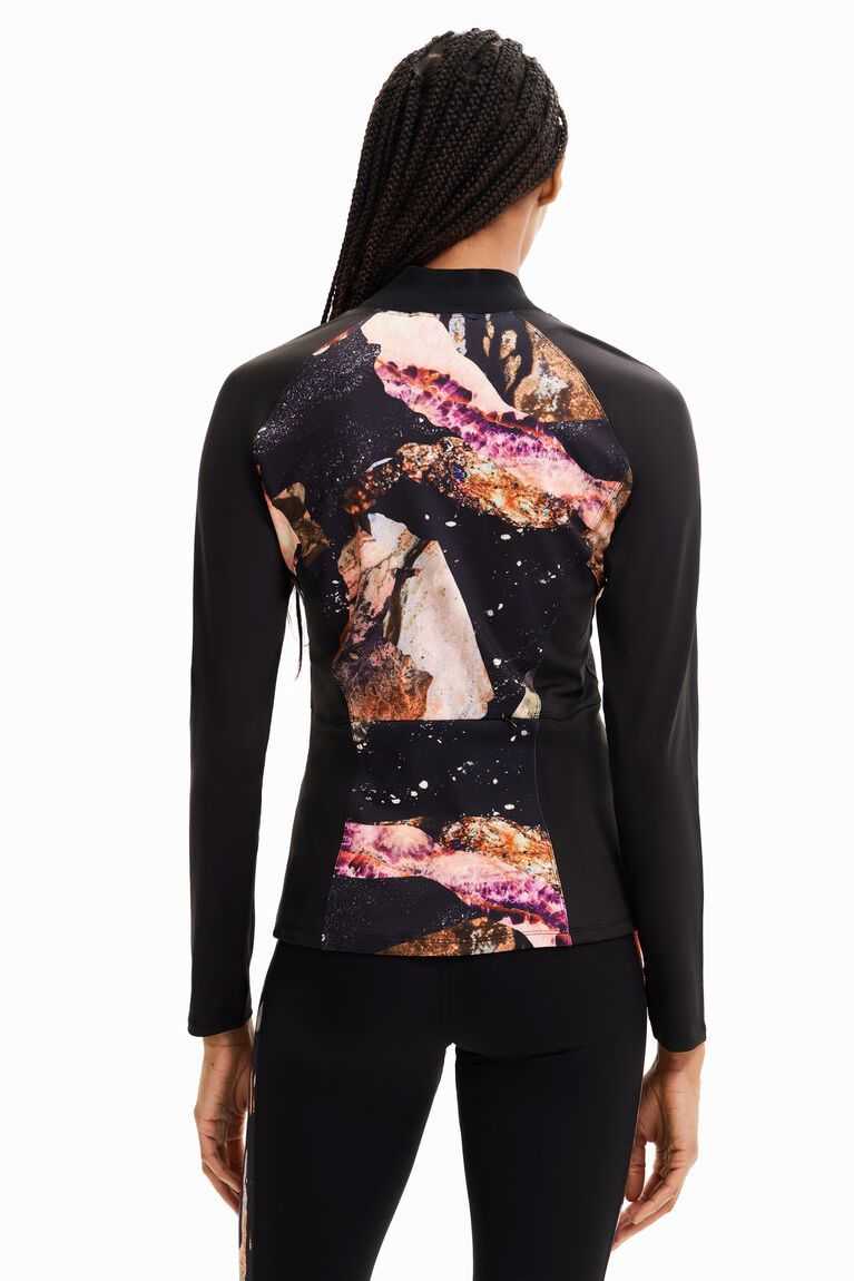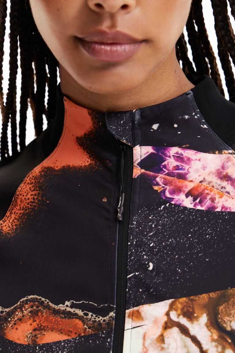 Fitted sport jacket in slightly stretchy fabric, with a Perkins collar, printed body and front zip.