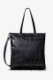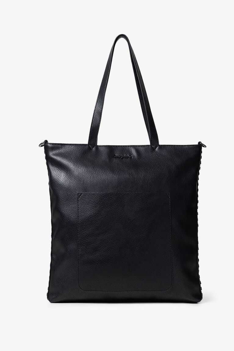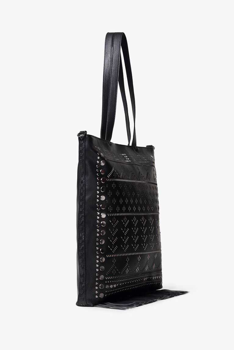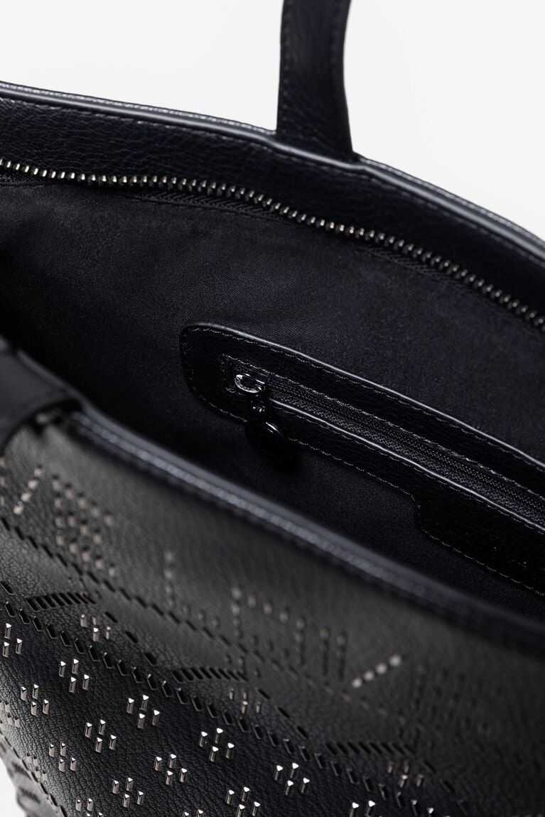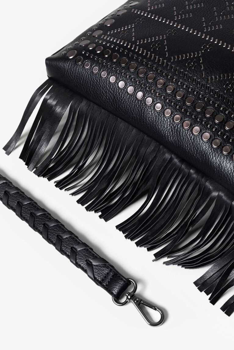Versatility is what defines this large sling bag that you can combine at different moments of the day and with different styles. A black sling bag in imitation leather, with decorative metal rivets in the form of floral frieze and Desigual LOVE messages, that you can carry on any occasion.