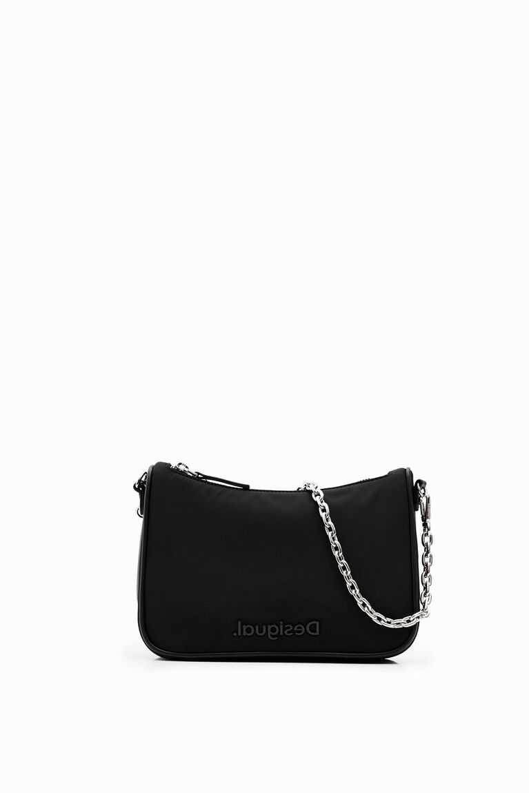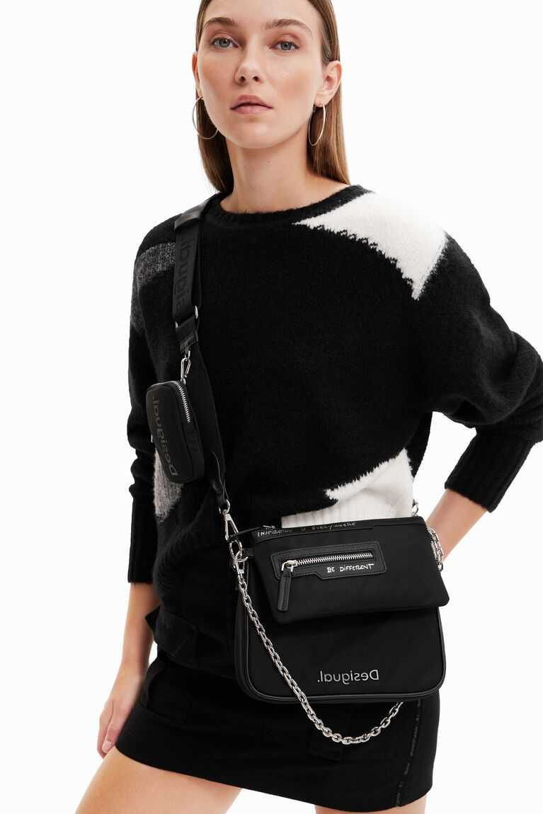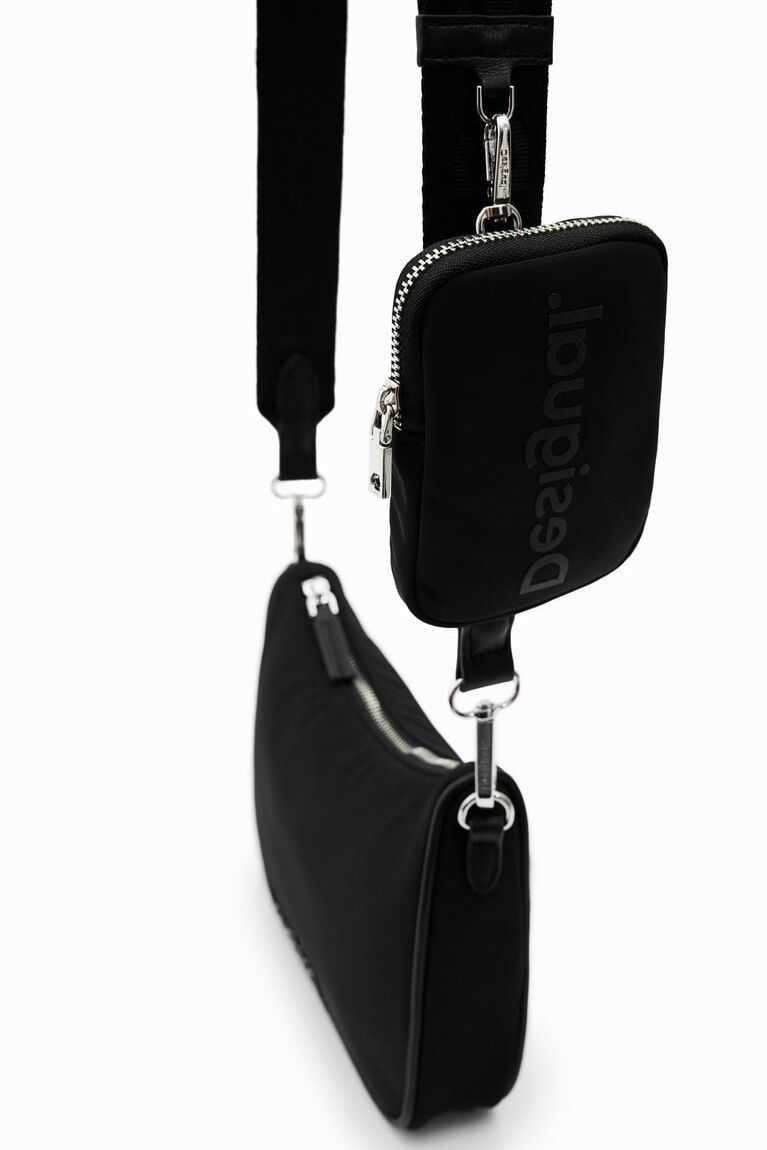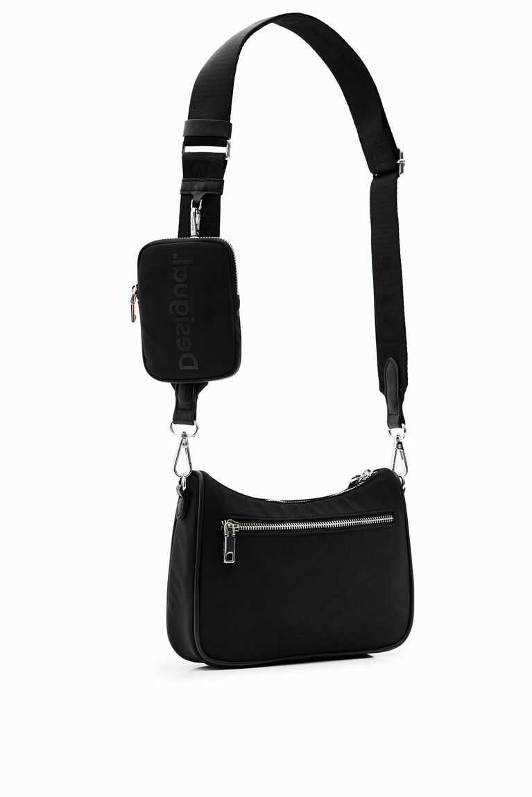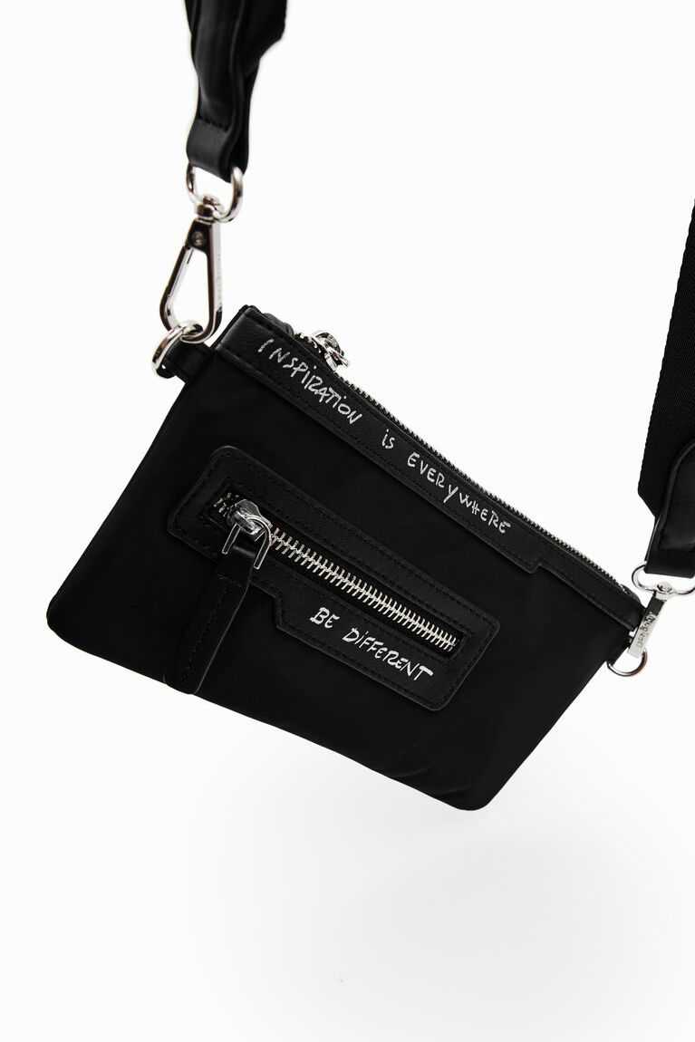 A small nylon messenger bag with message details and detachable mini-bag and wallet. Features several straps and pockets.