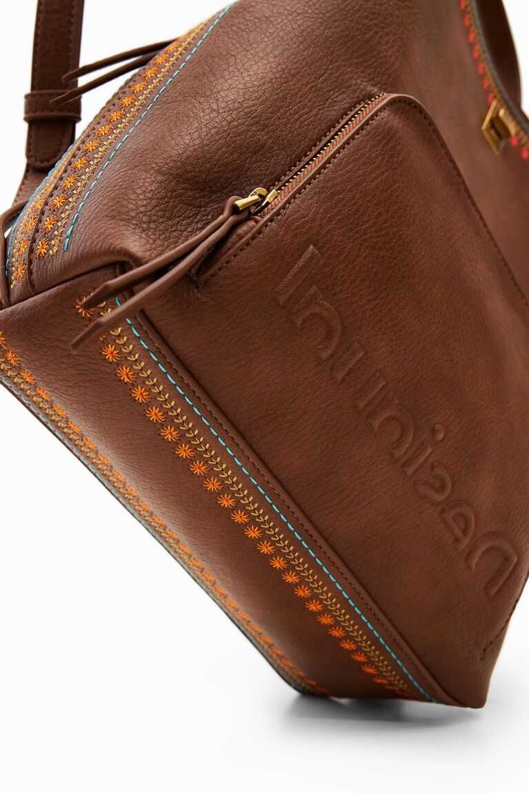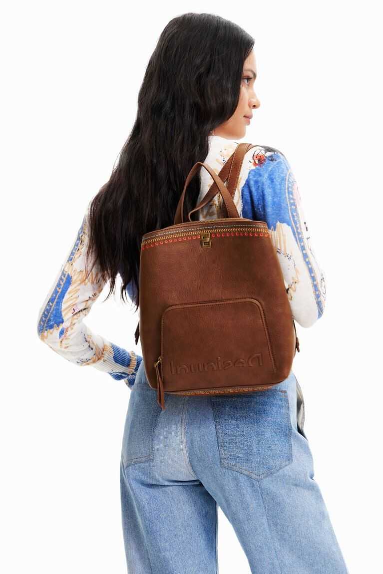 Small, plain-colour backpack with embossed logo work on its large front pocket and coloured backstitching. Features multiple interior compartments.