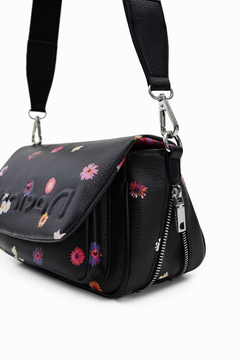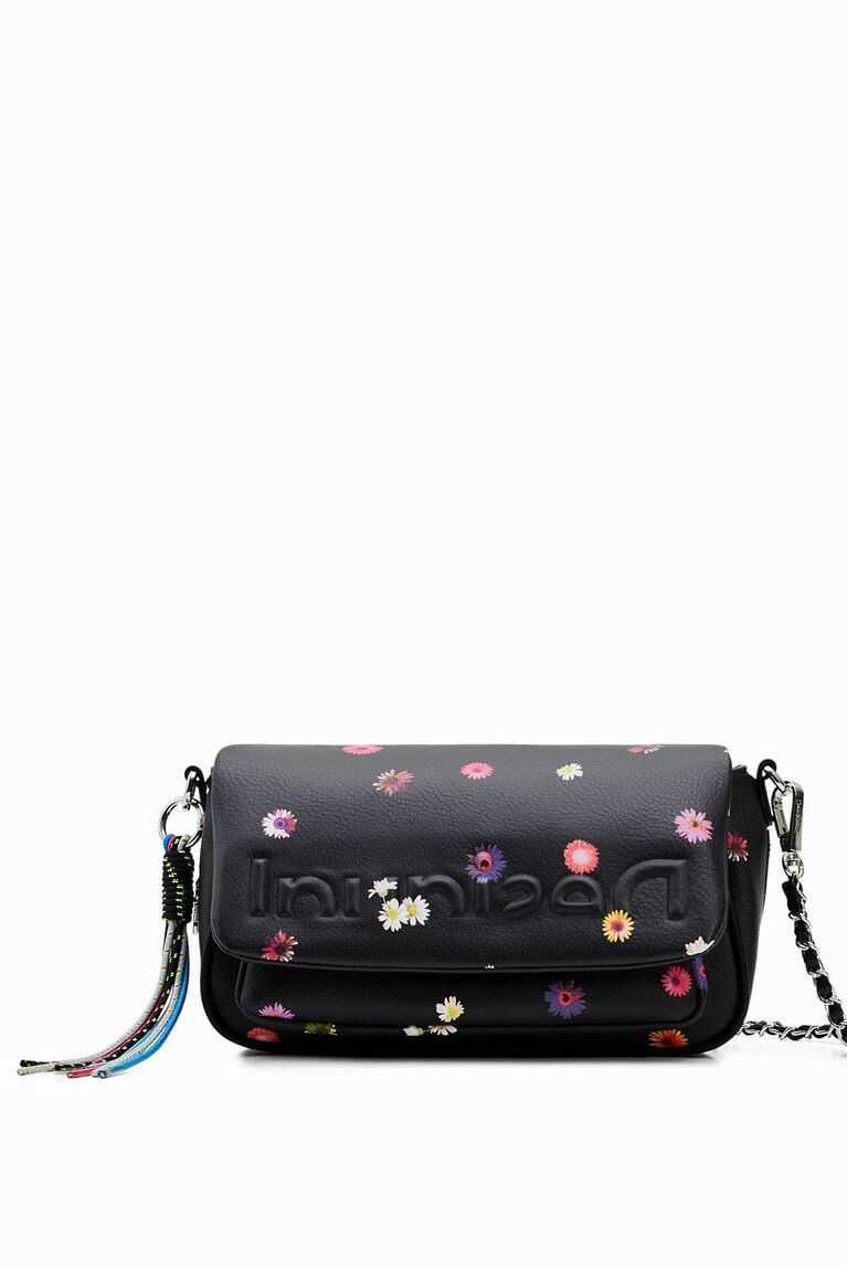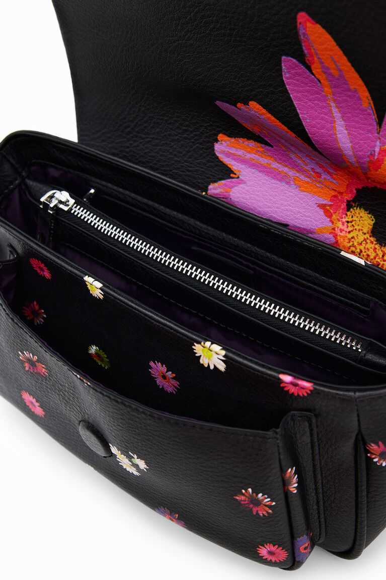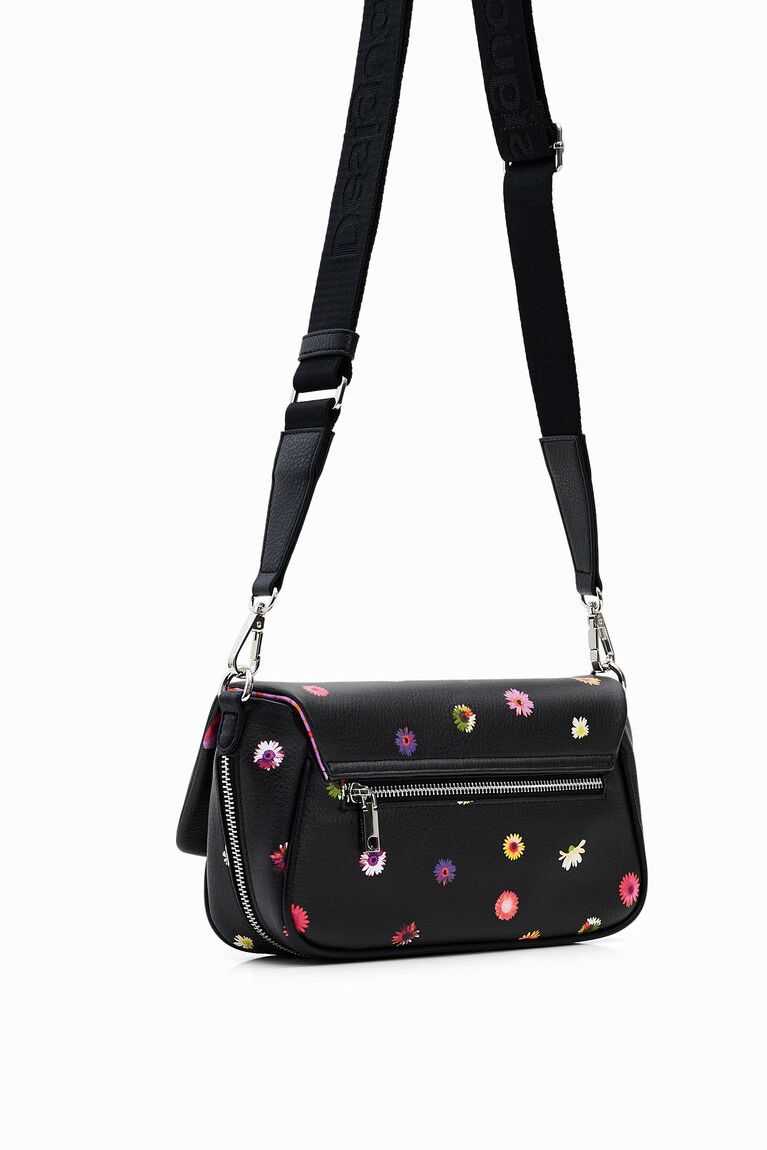 Black faux-leather crossbody bag with small daisies that appear to be painted on the outside. With a flap closure and multiple straps and compartments.
