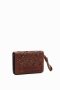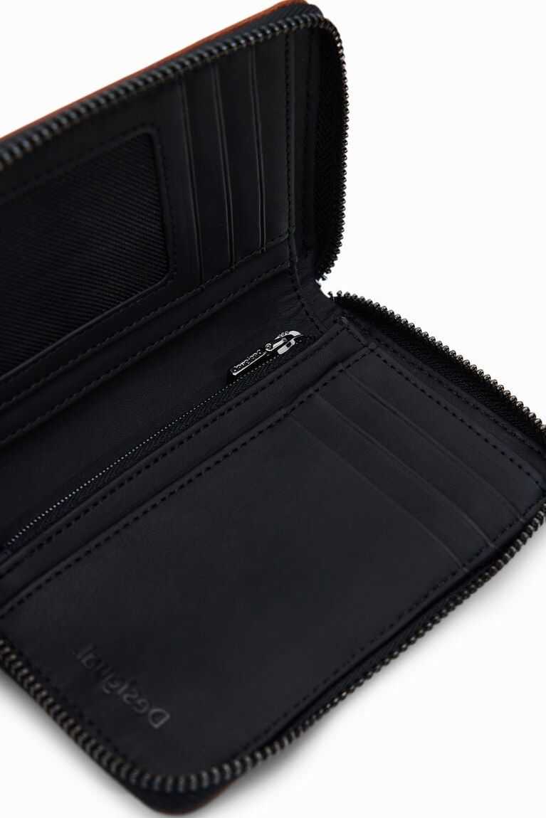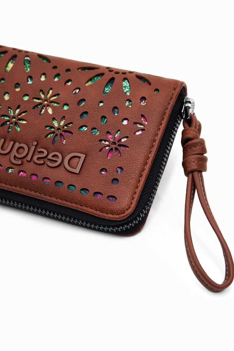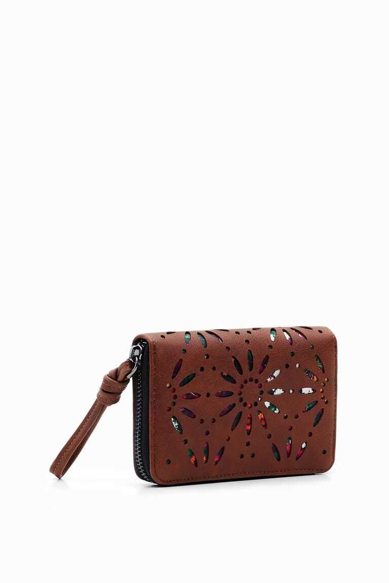 A small wallet in faux leather featuring die-cut flowers with a print underneath and a zip closure. Very light and soft.
