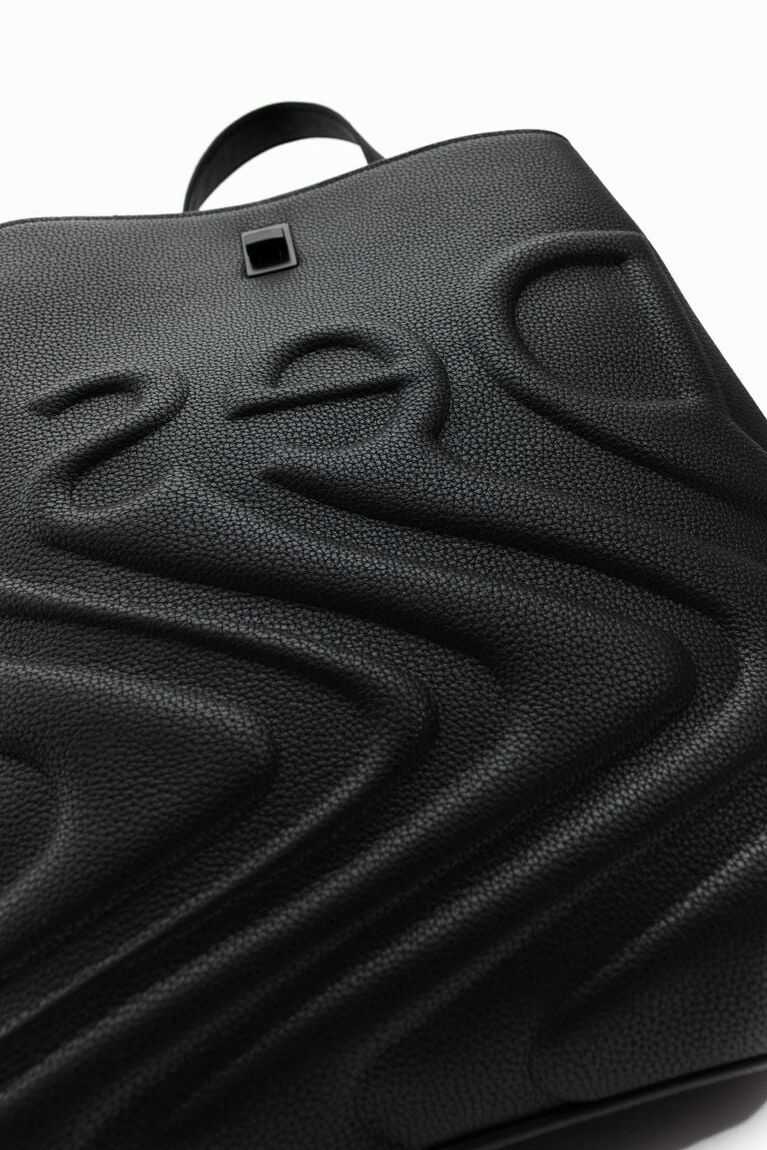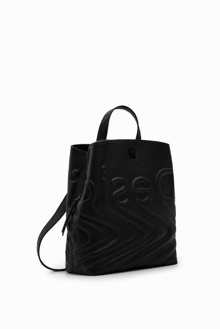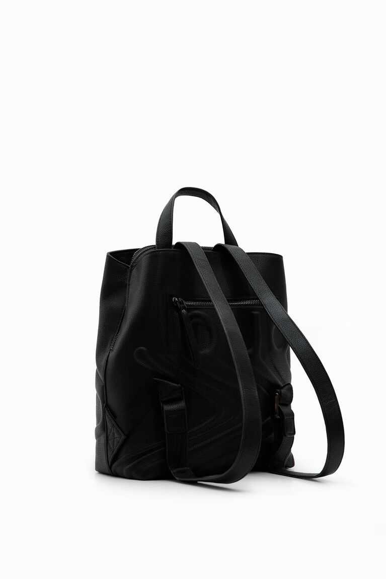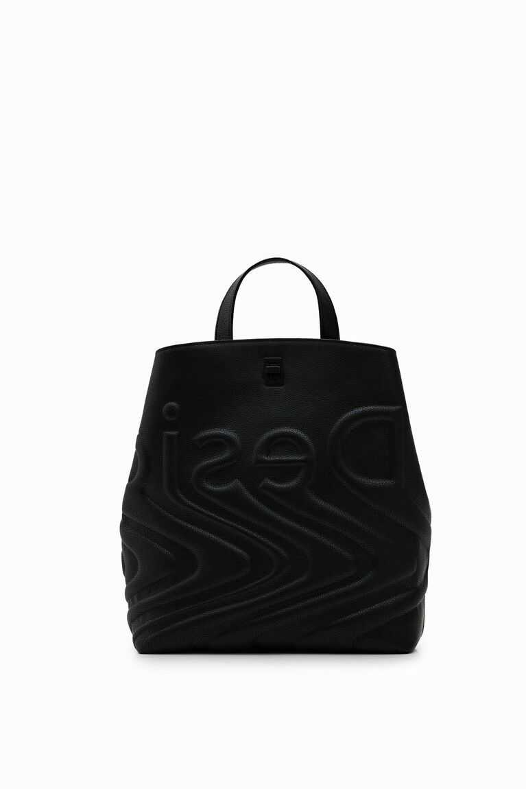Small, plain-colour backpack with embossed logo work on the outside and multiple compartments inside.