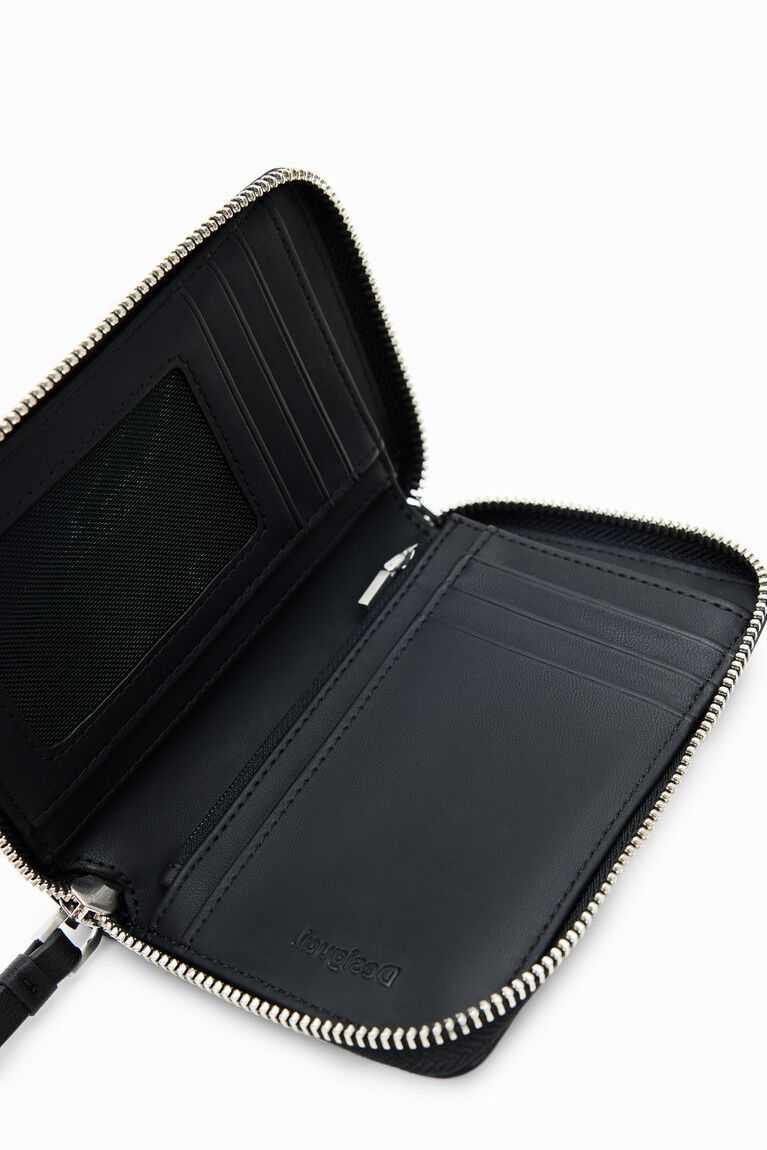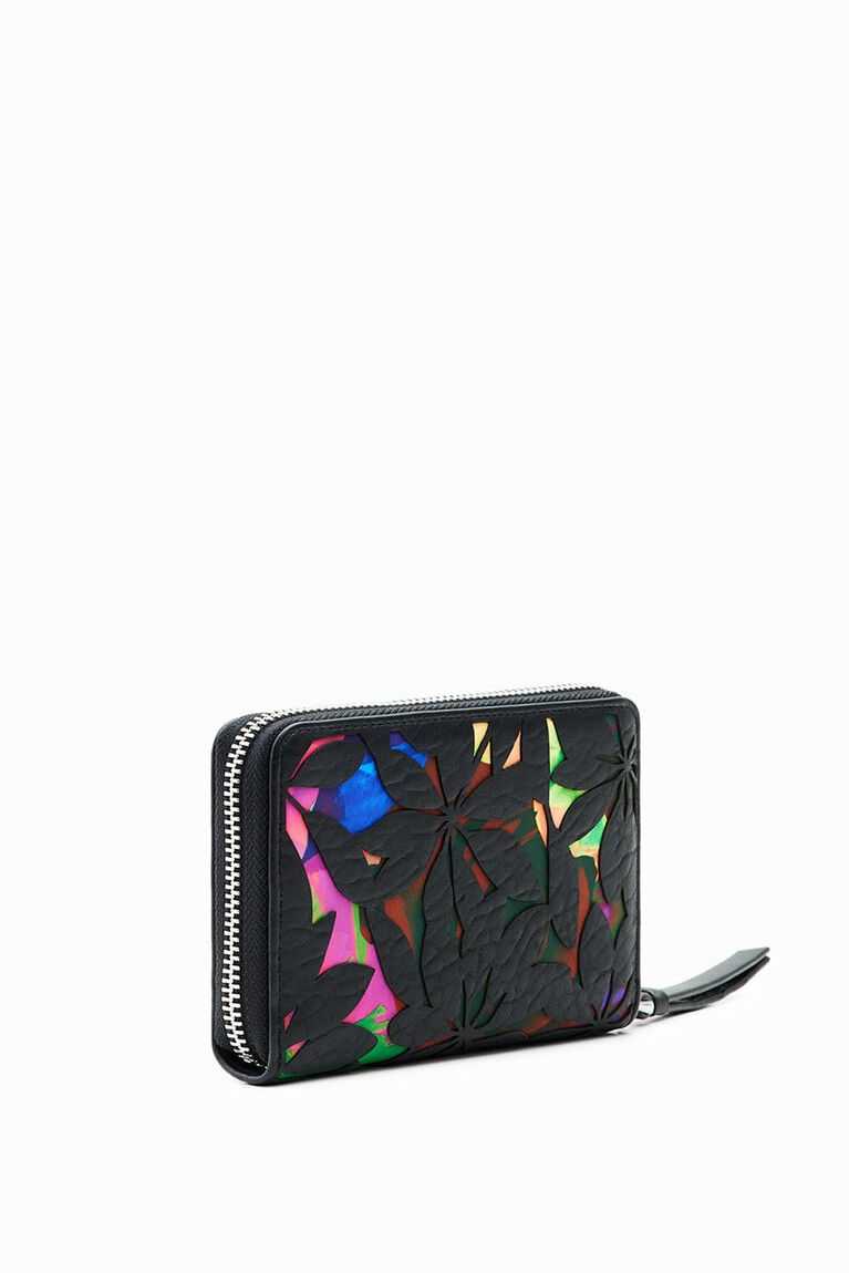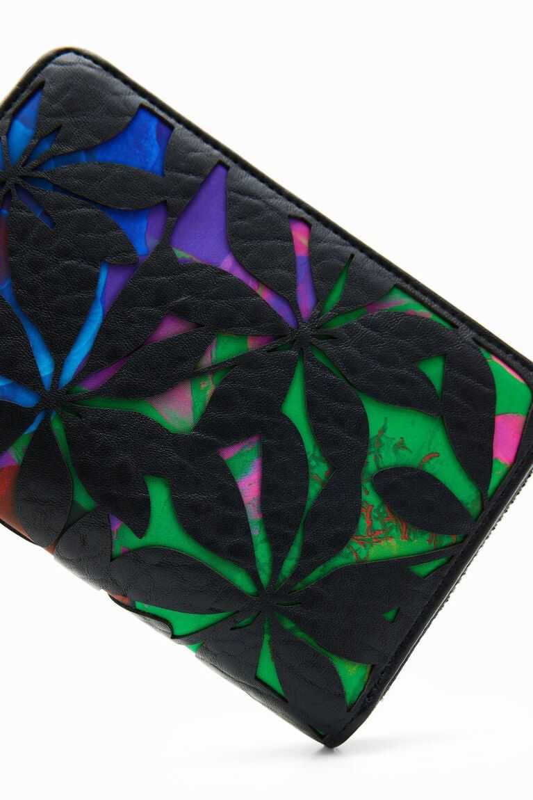 A small wallet in leather-effect fabric with a die-cut flower design over a printed background and several compartments.