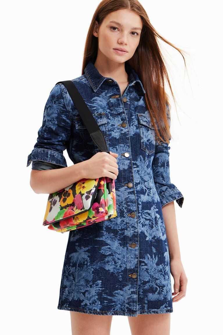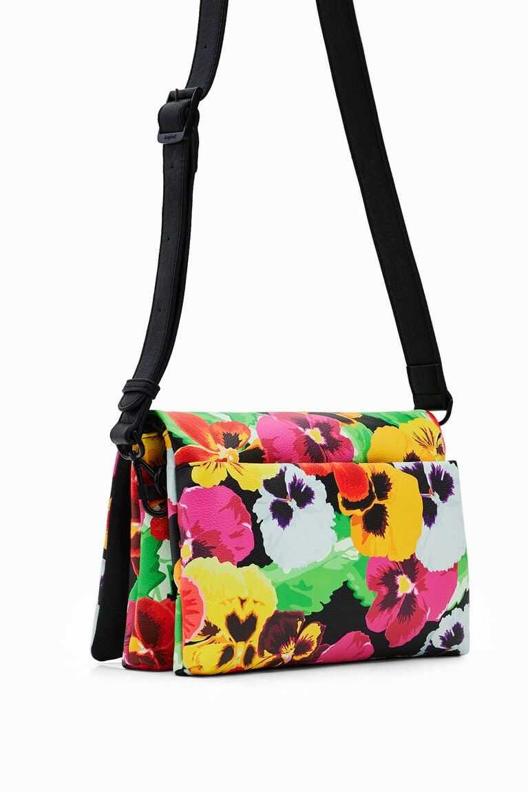 A small crossbody bag with a flap closure in a very colourful pansy print. With several compartments and straps, it is very versatile and lightweight.