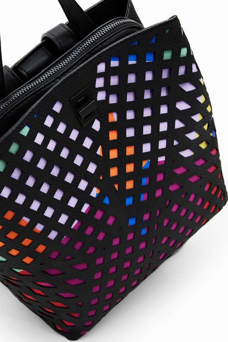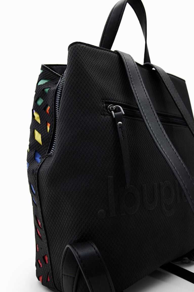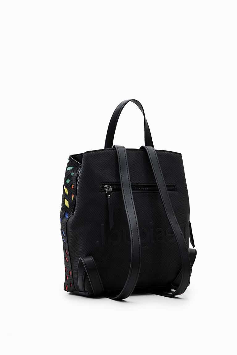 Small backpack with geometric texture work in various colours and multiple interior compartments.