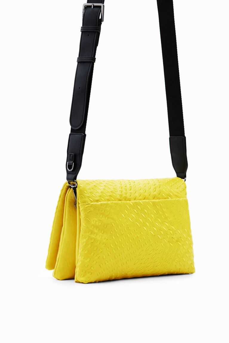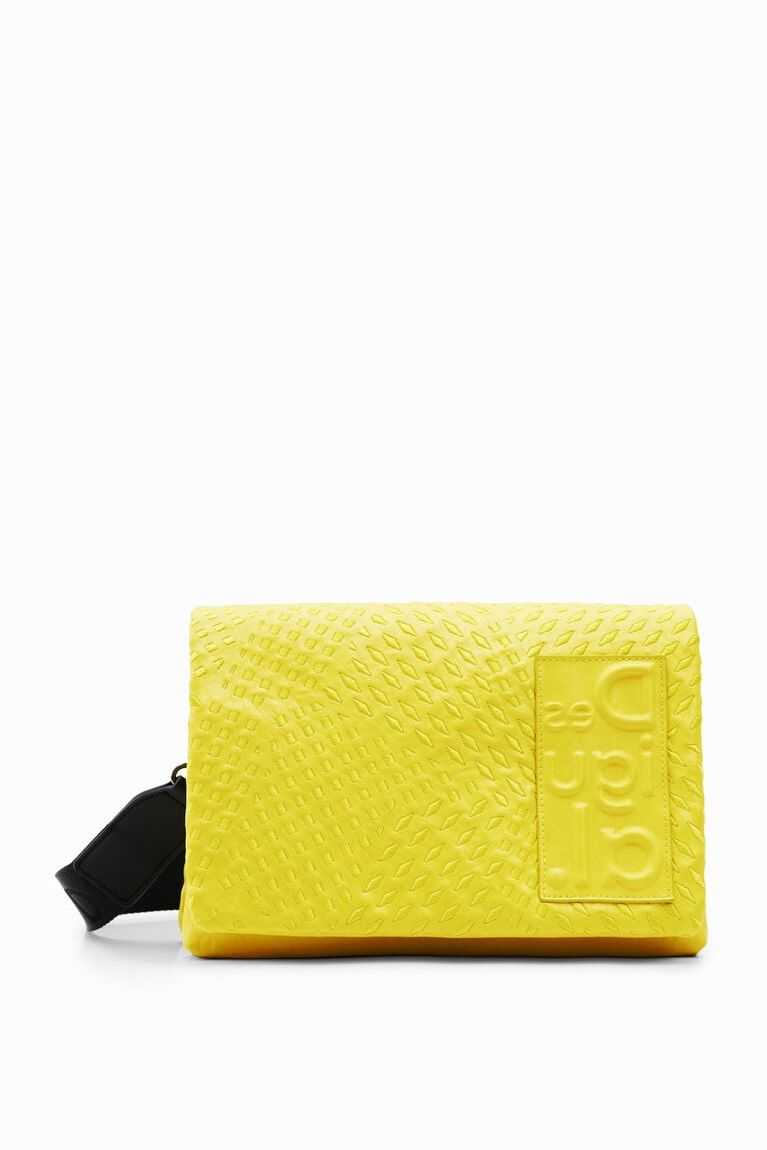 Crossbody bag with an embossed geometric texture and a large logo on the front. Featuring a flap closure and multiple compartments and straps.