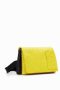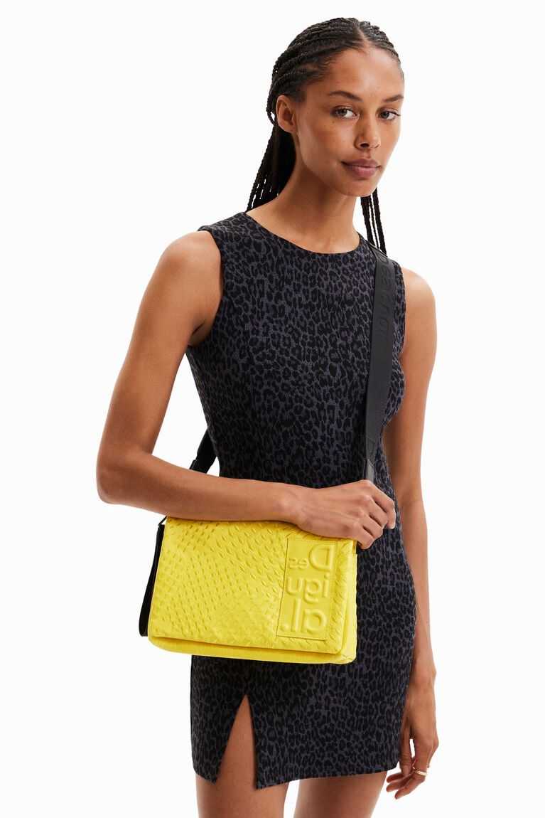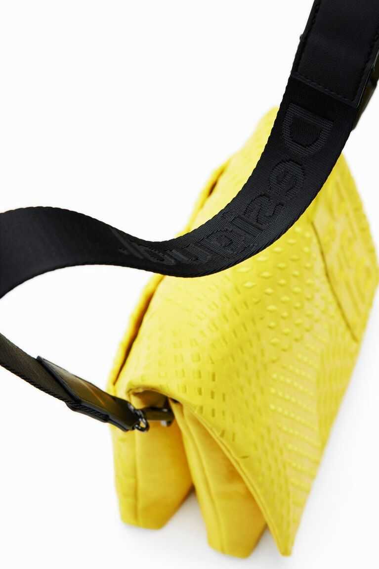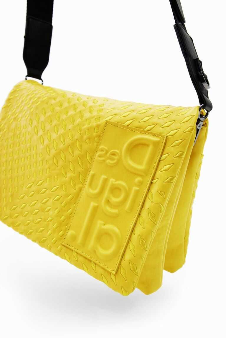 Crossbody bag with an embossed geometric texture and a large logo on the front. Featuring a flap closure and multiple compartments and straps.