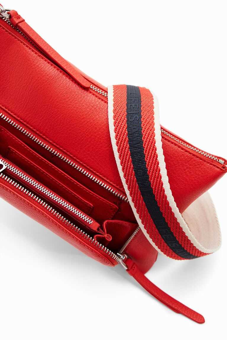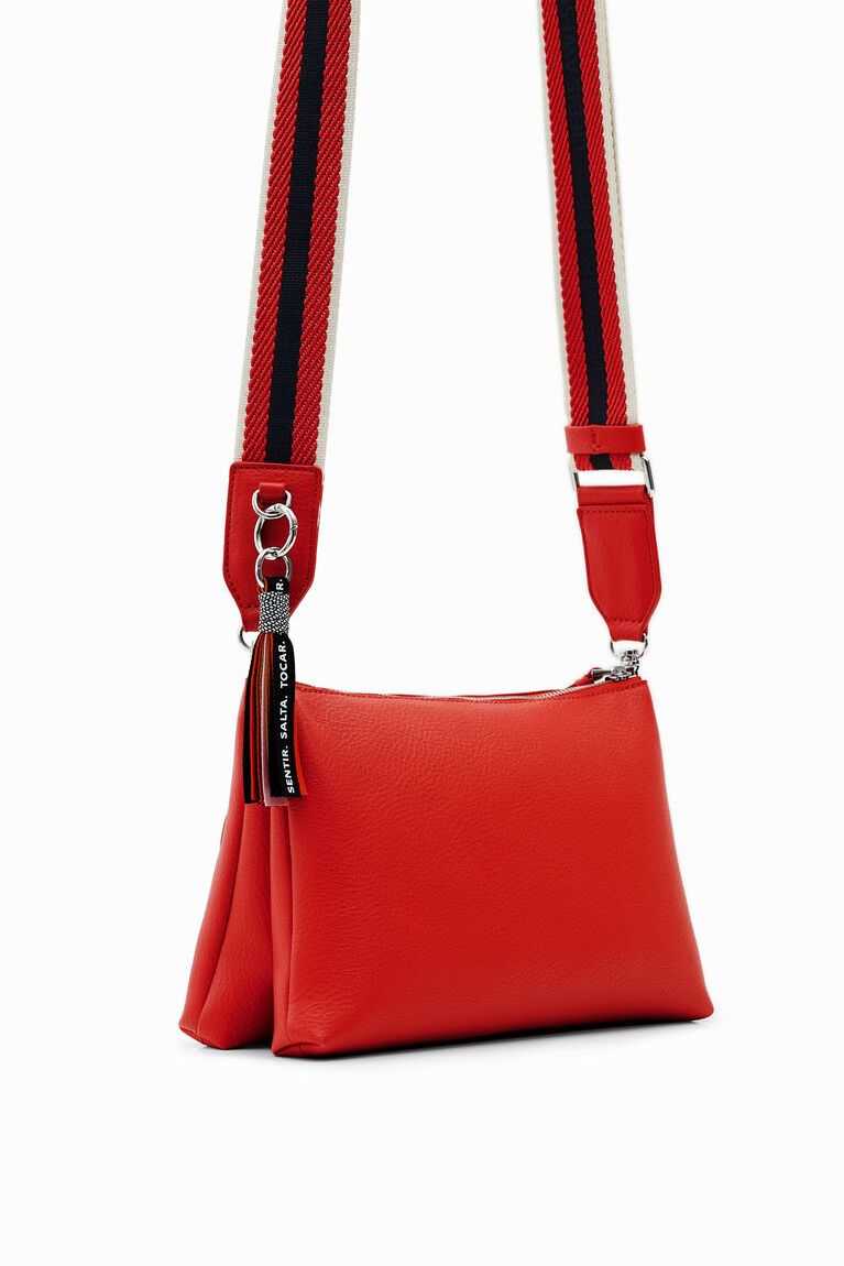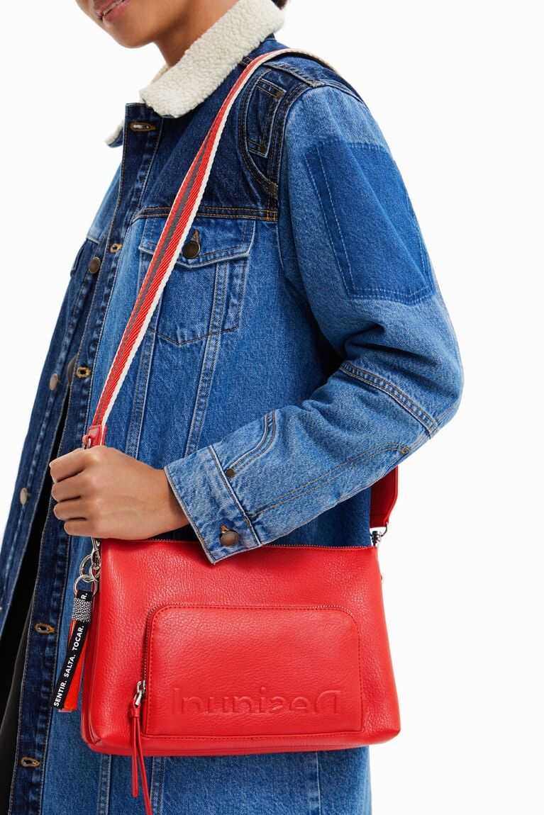 Plain-colour faux-leather crossbody bag with an embossed half logo on the front. Can be used in many ways thanks to its different straps.