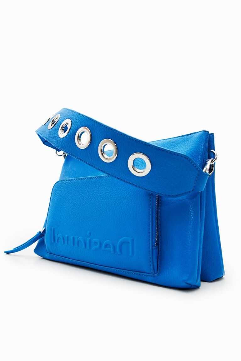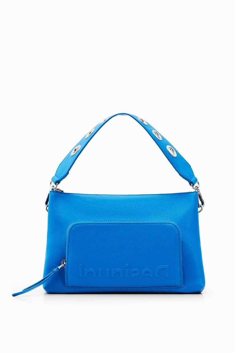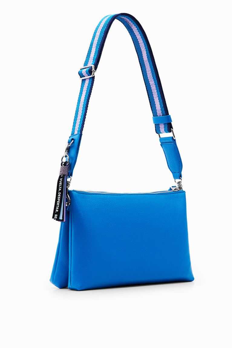 Plain-colour faux-leather crossbody bag with an embossed half logo on the front. Can be used in many ways thanks to its different straps.