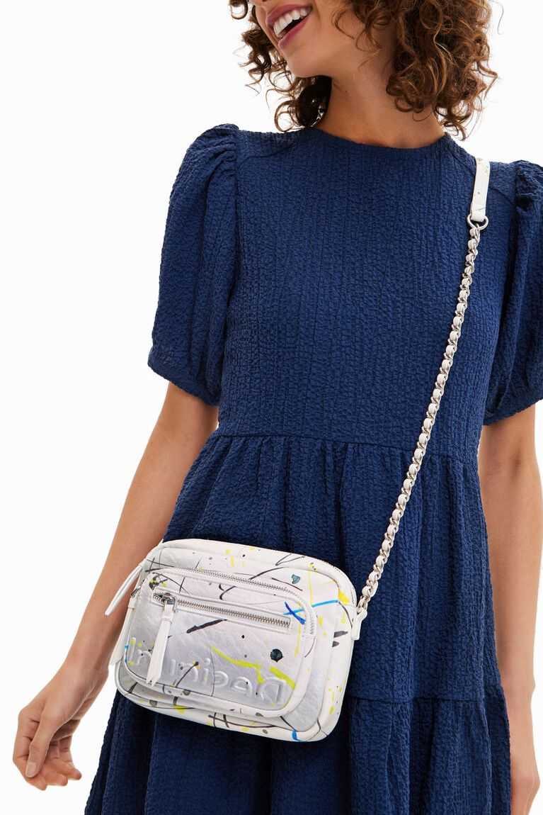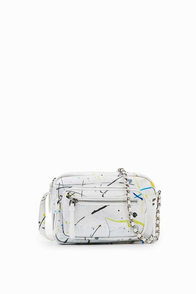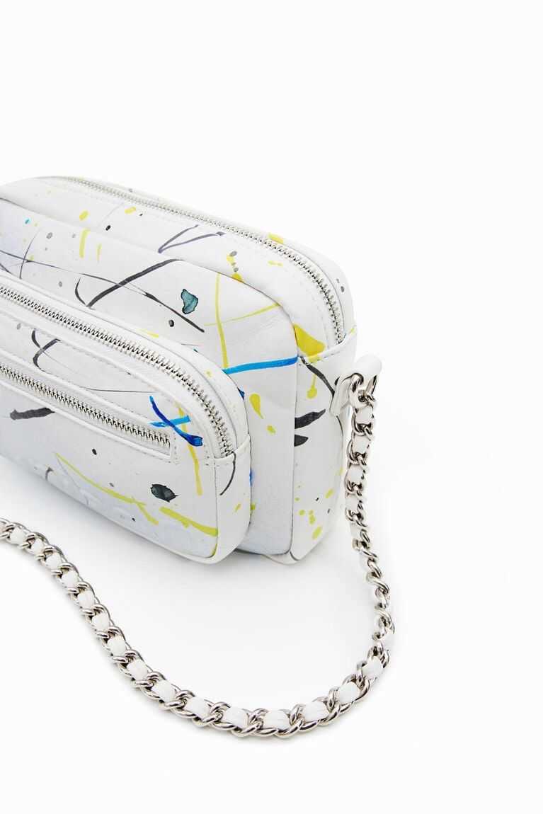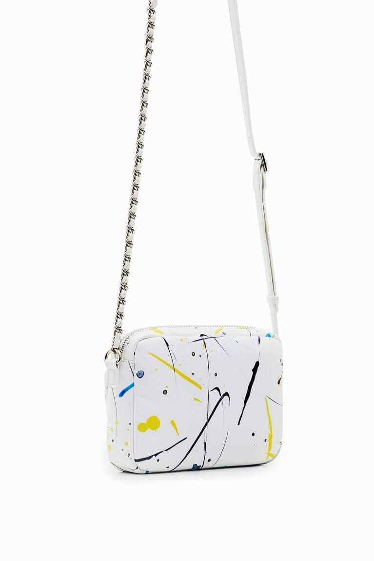 A small but spacious crossbody bag that's also very light. In white faux leather with paint splatter for an arty finish.