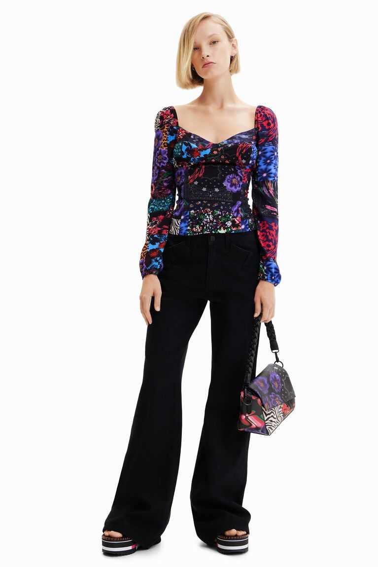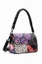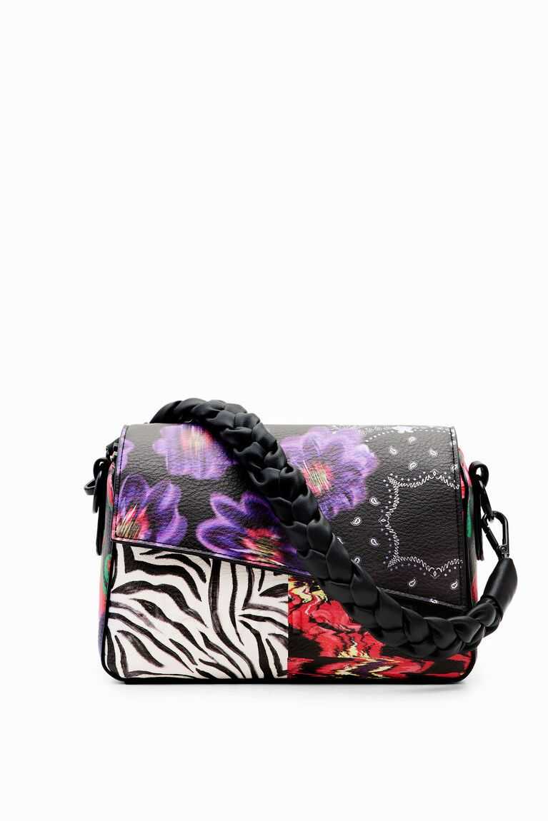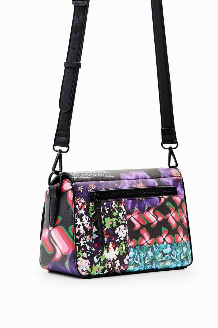 A small bag in leather-effect fabric with a patch print. Featuring a flap and several straps and pockets.