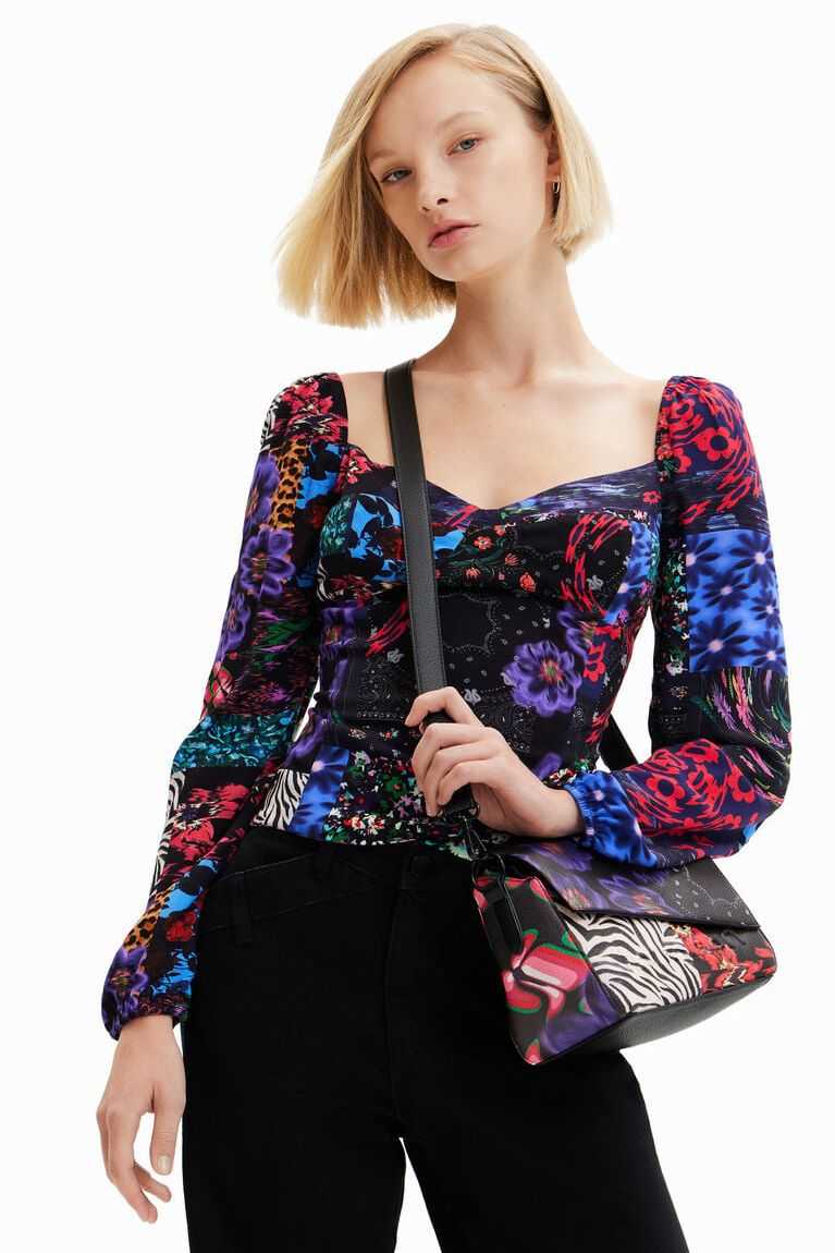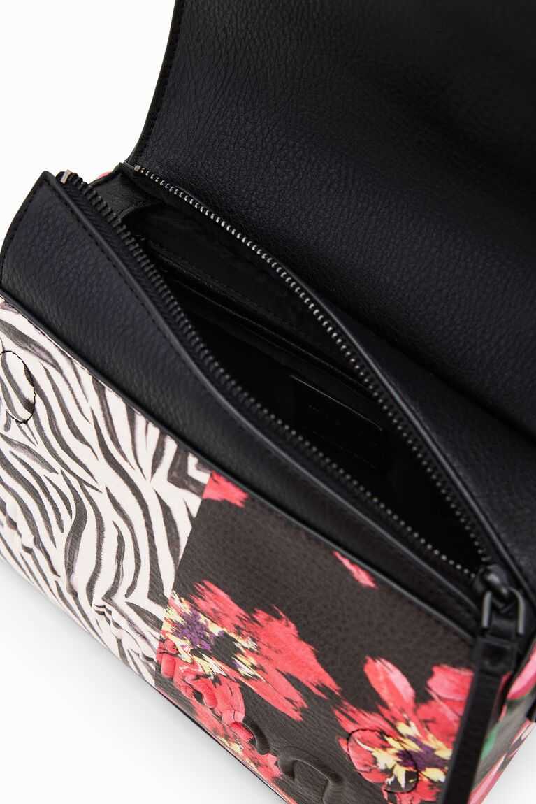 A small bag in leather-effect fabric with a patch print. Featuring a flap and several straps and pockets.