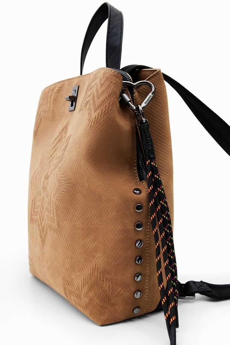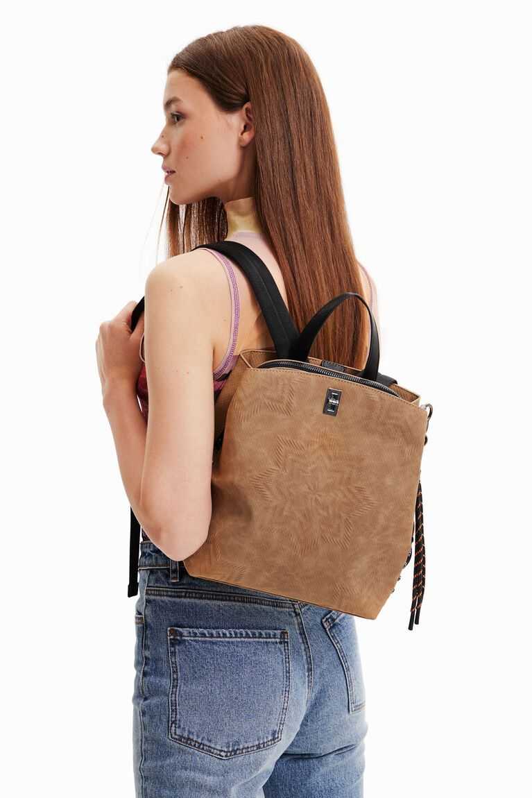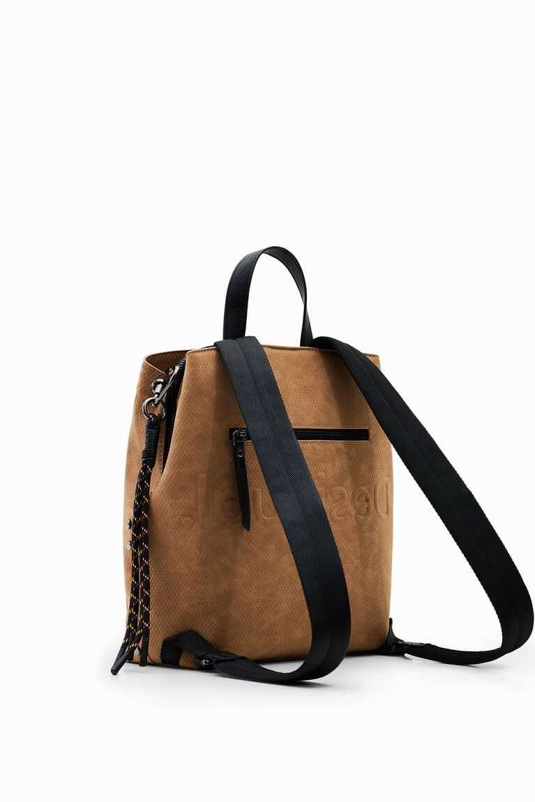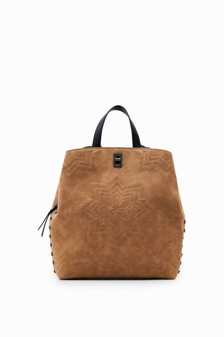 Plain backpack with embossed geometric pattern and black strap. Small size with two interior compartments and a zip and clip closure.