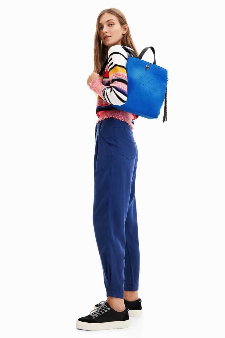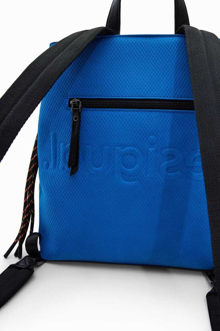 Plain backpack with embossed geometric pattern and black strap. Small size with two interior compartments and a zip and clip closure.