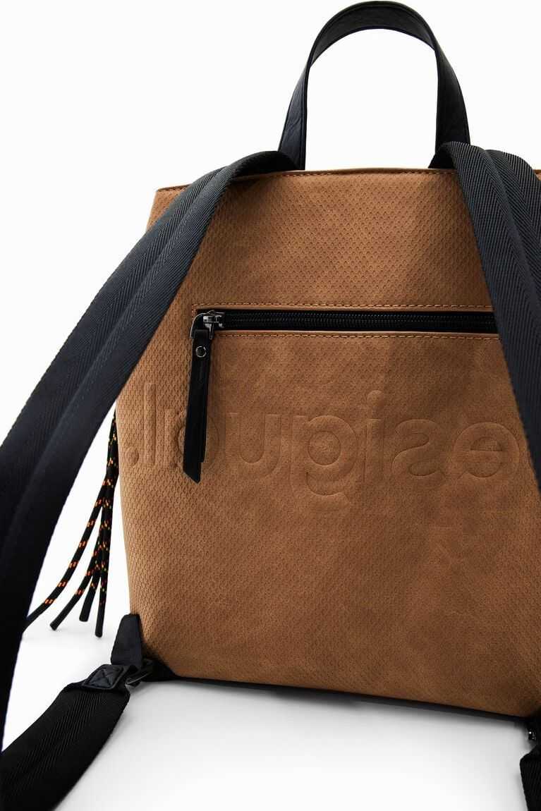 Plain backpack with embossed geometric pattern and black strap. Small size with two interior compartments and a zip and clip closure.