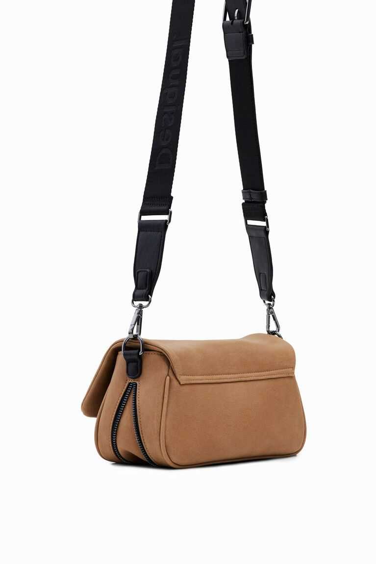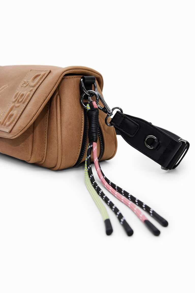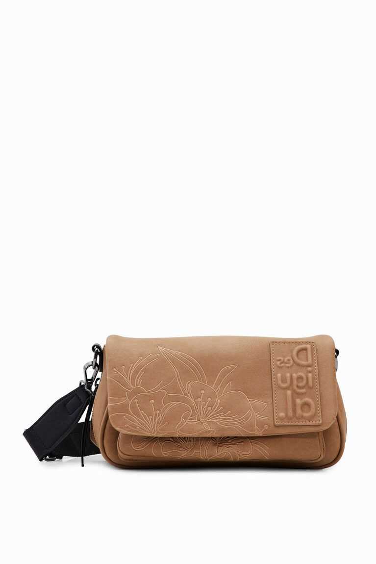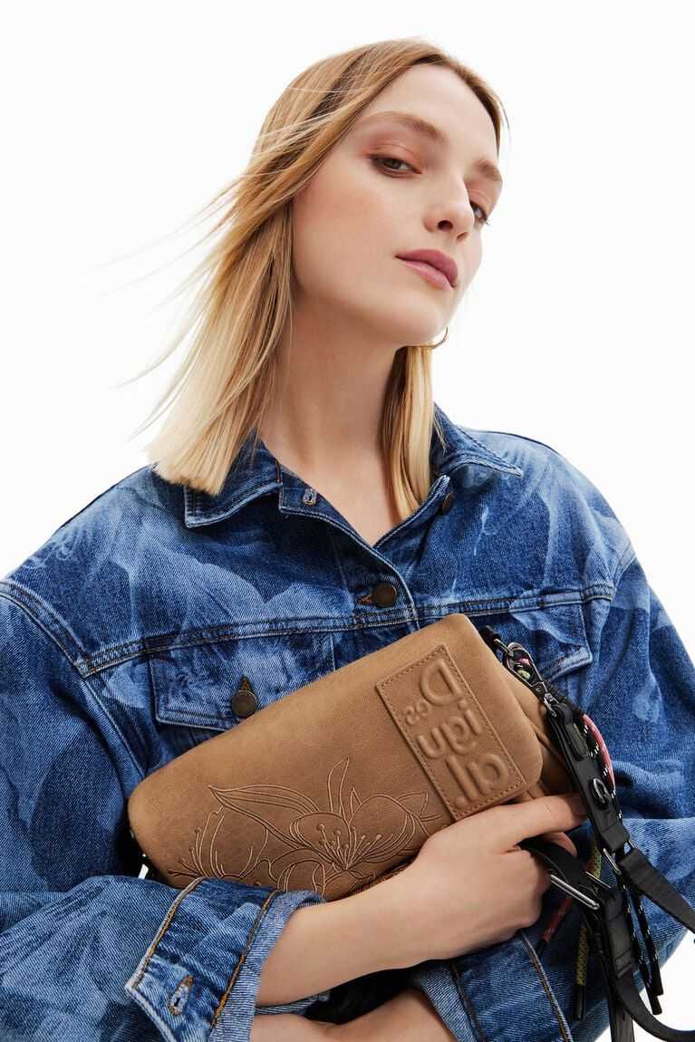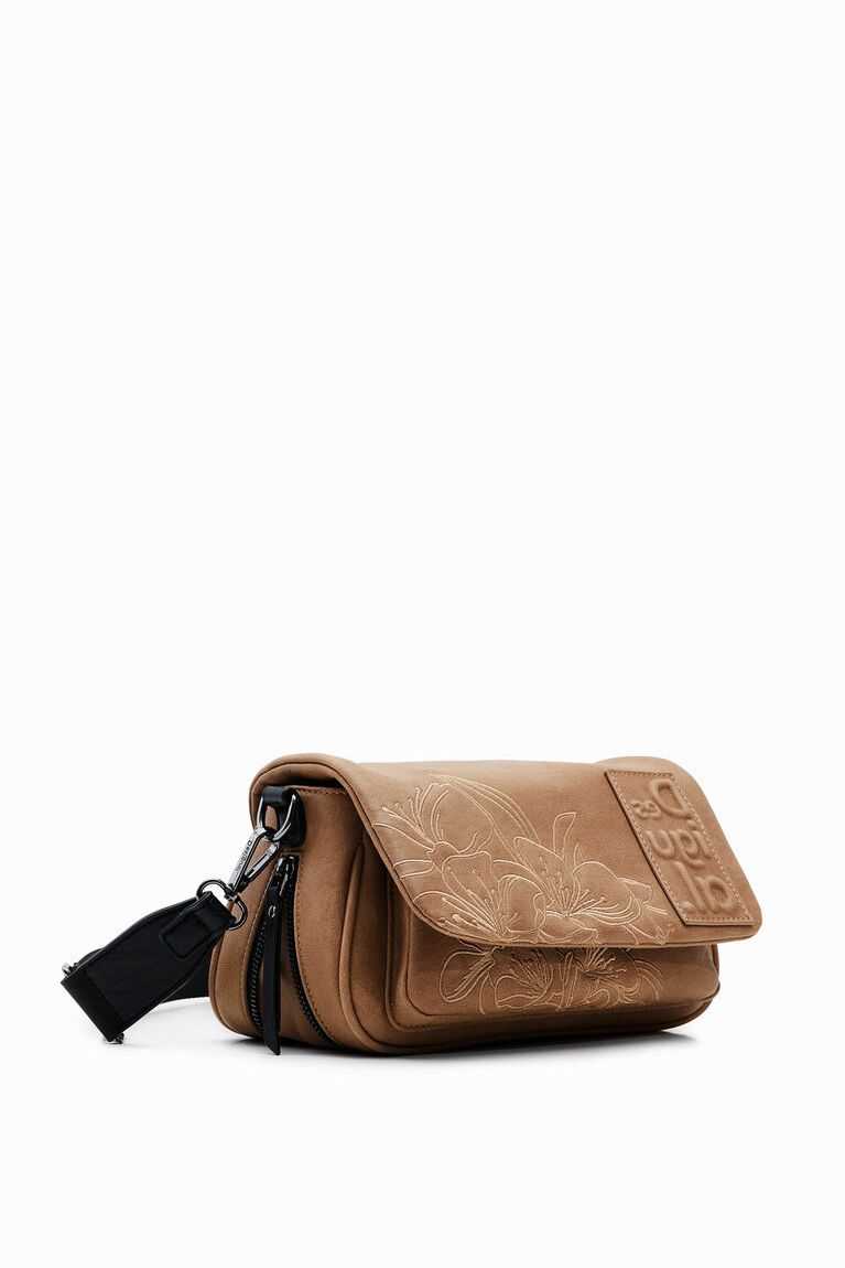 Faux-leather crossbody bag with textured flowers in a lighter shade. Features multiple straps for carrying in different ways and a zip to make it narrower.