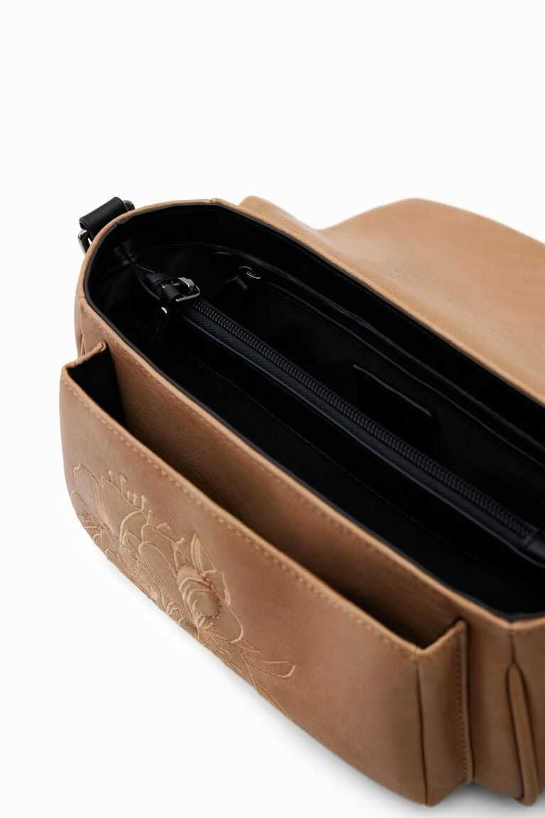 Faux-leather crossbody bag with textured flowers in a lighter shade. Features multiple straps for carrying in different ways and a zip to make it narrower.