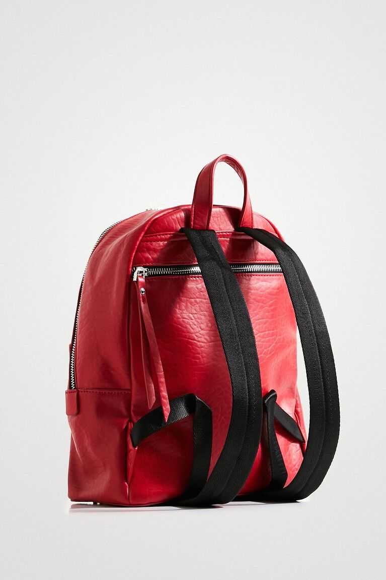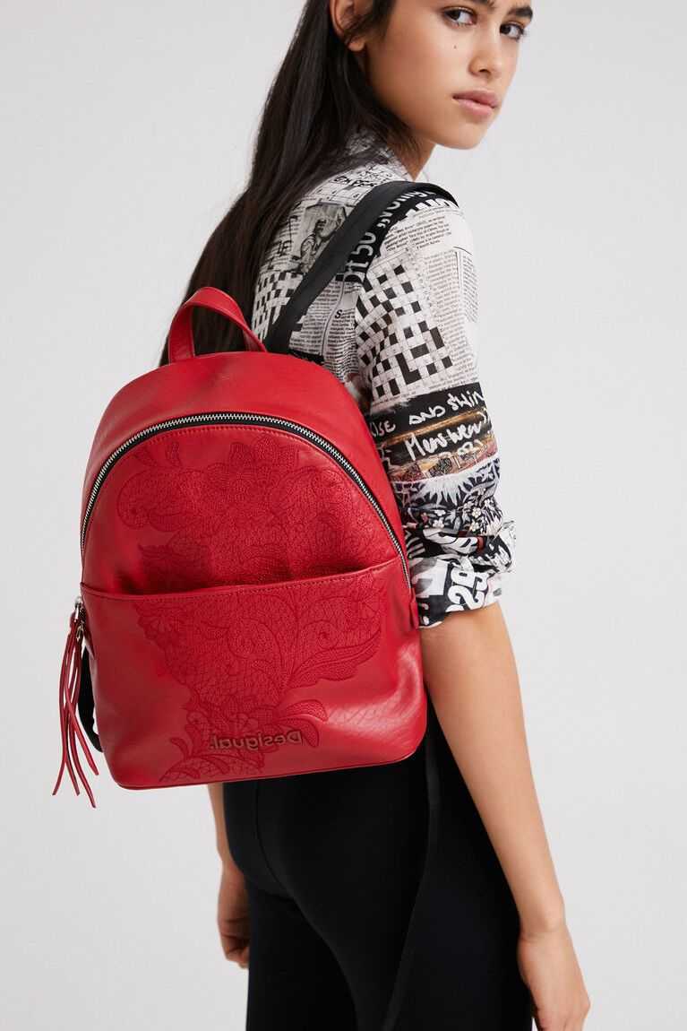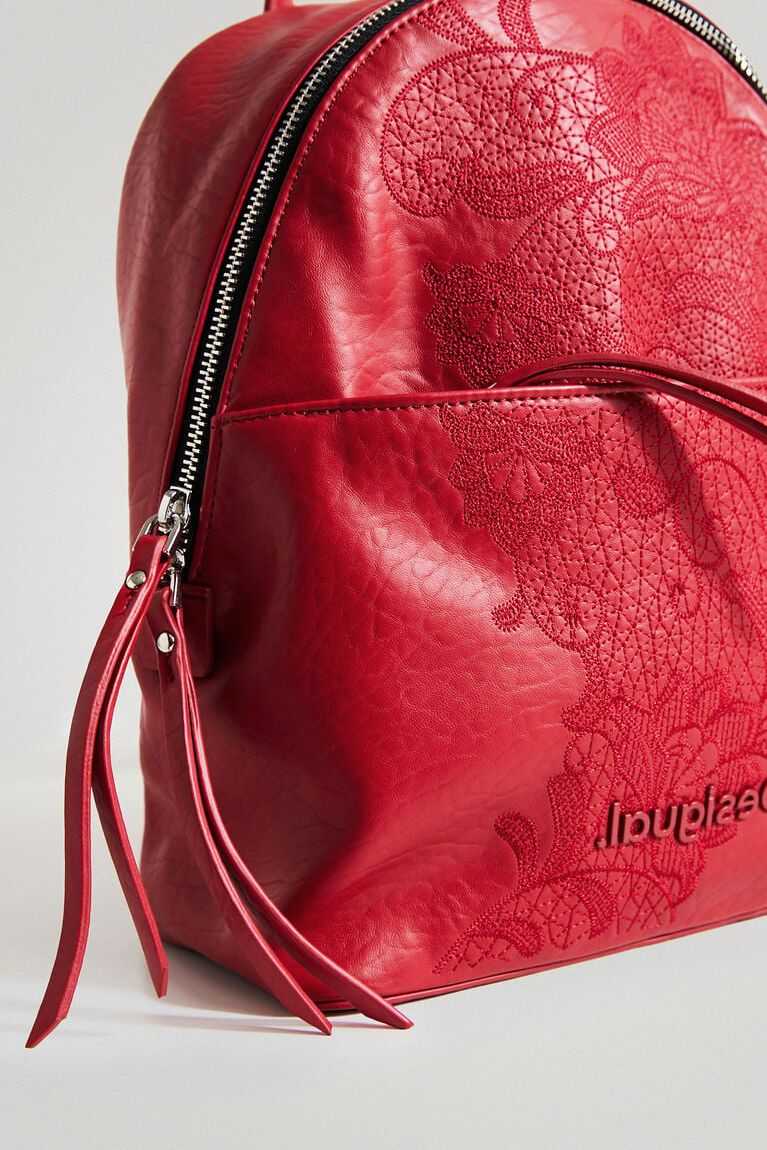 Small backpack in a very soft red fabric, with tone-on-tone embroideries on the front. Features multiple inside and outside pockets and colourful charms.