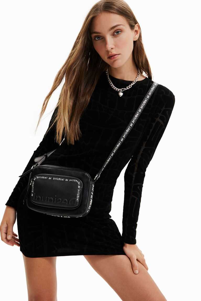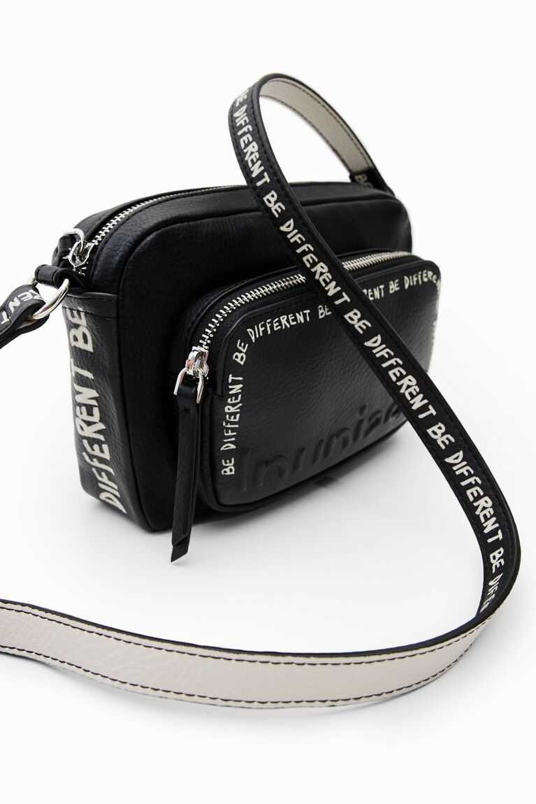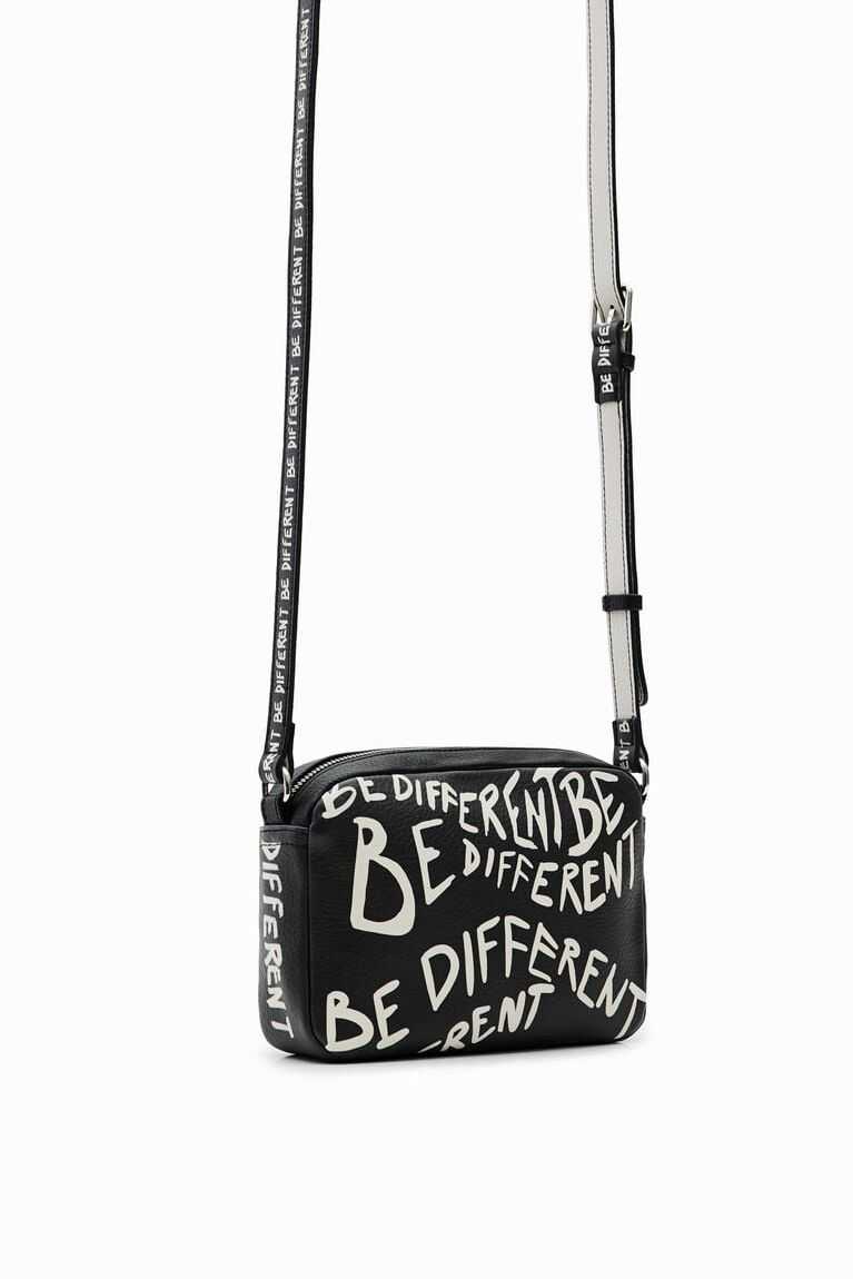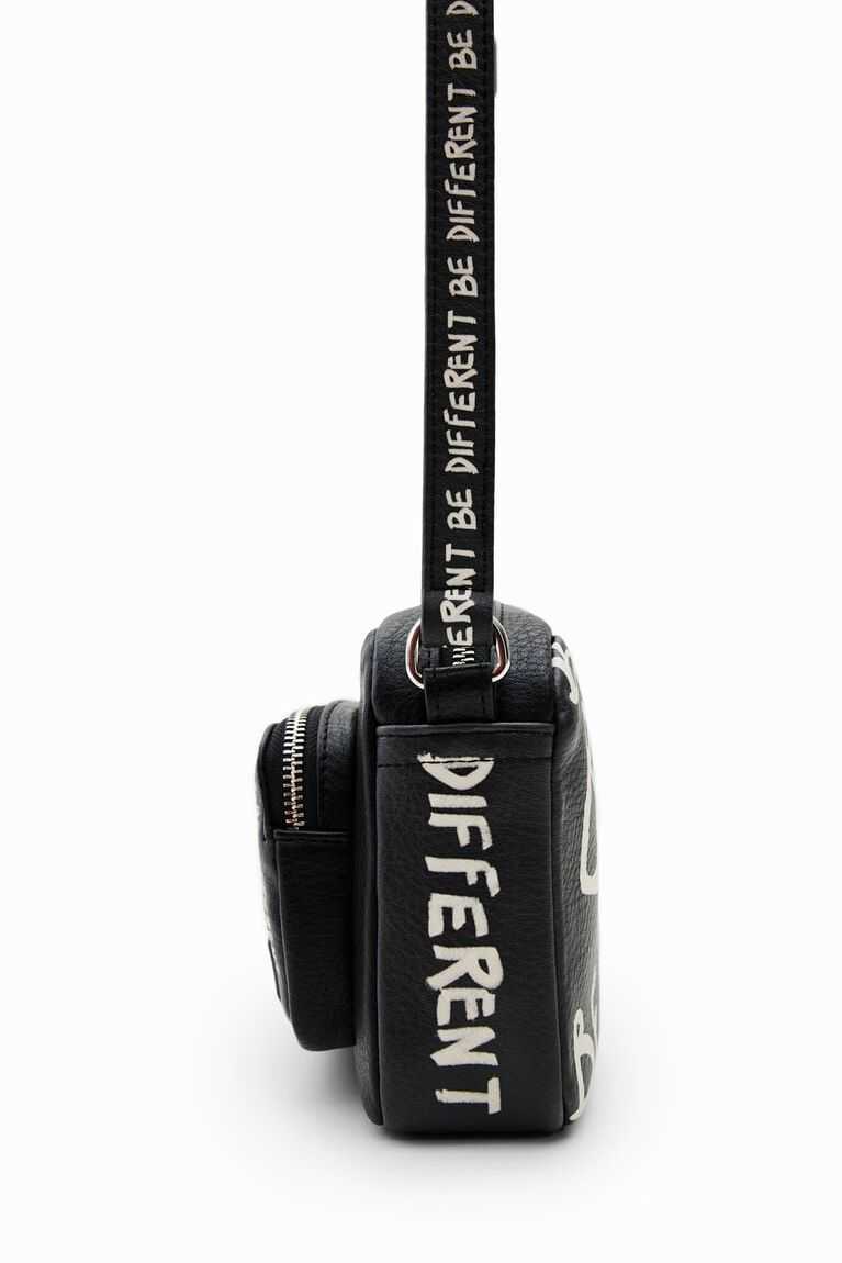 A small but spacious crossbody bag that's also very light. In black faux leather with painted messages for an arty finish.