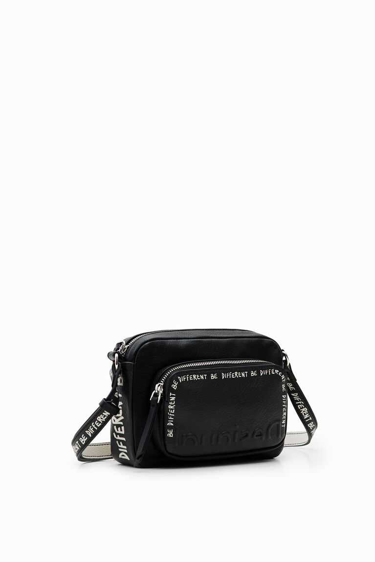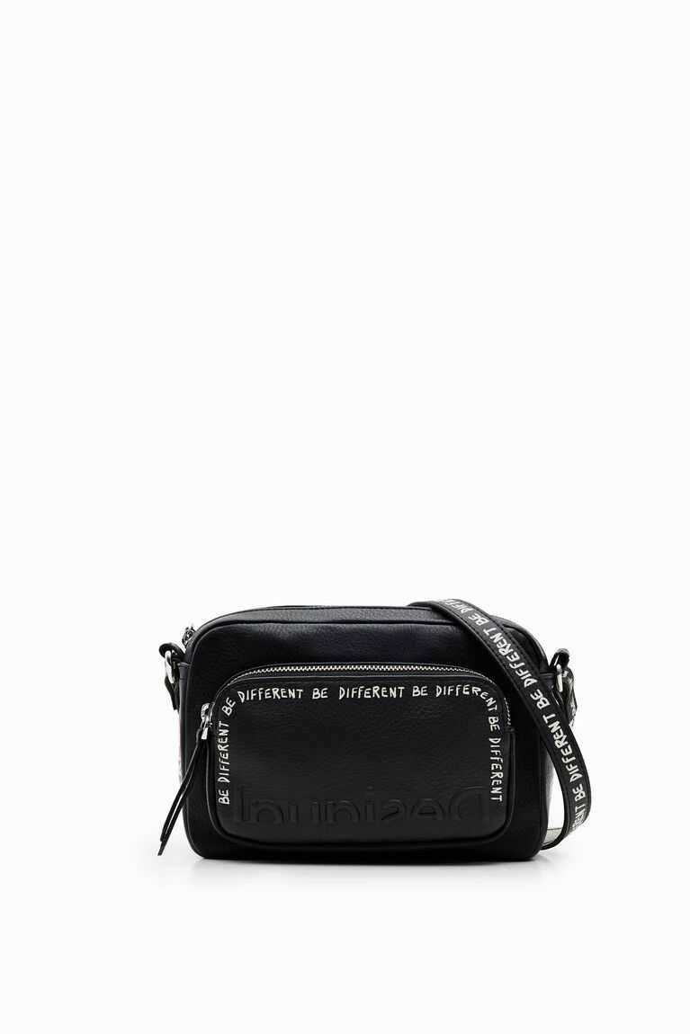 A small but spacious crossbody bag that's also very light. In black faux leather with painted messages for an arty finish.